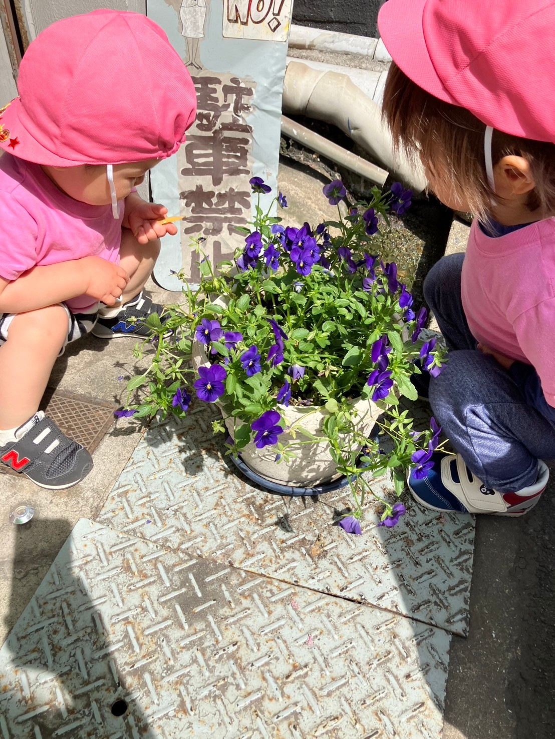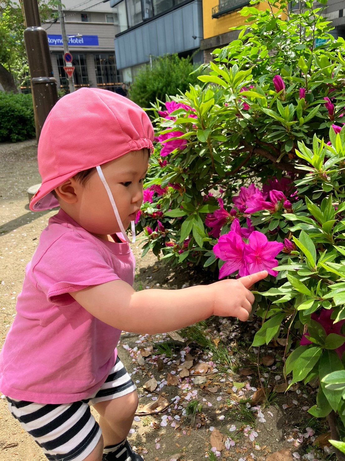 桜の花びらや咲いている花にも触れたりして、興味深々です。