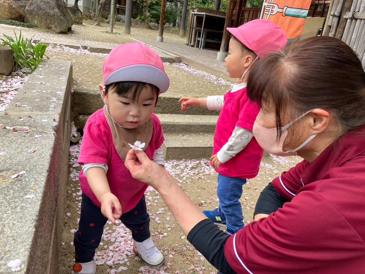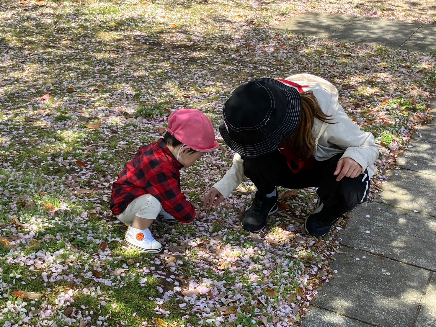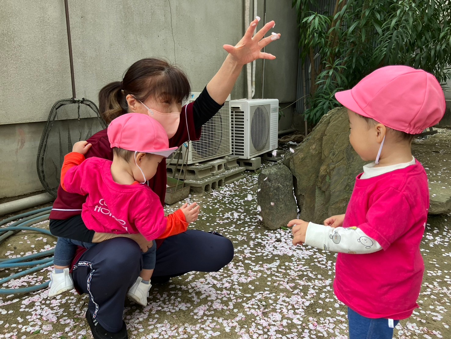 春の自然に興味津々の子ども達。桜の花びらを見つけては、「きれ〜!」「わあーーー!」と大喜び。