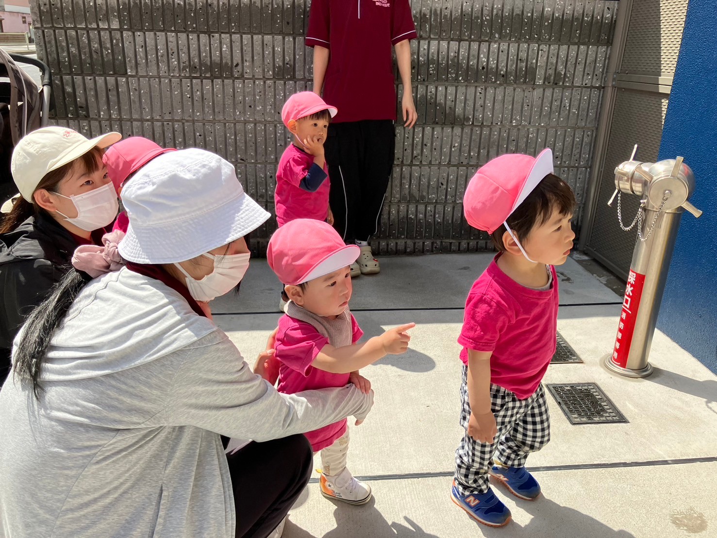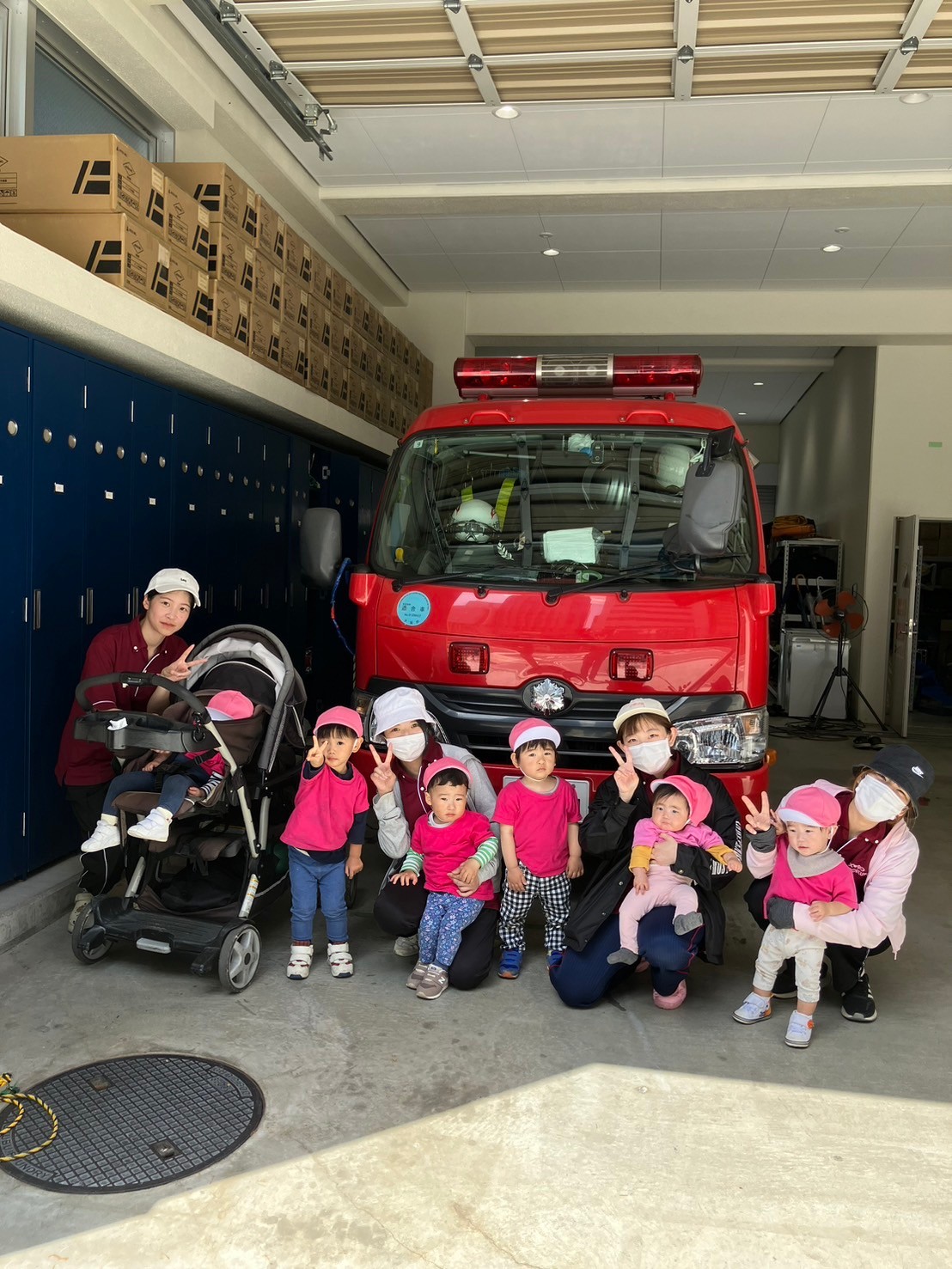 散歩の帰り道には、出張所に消防車が停まっていて、皆で見学をしました。