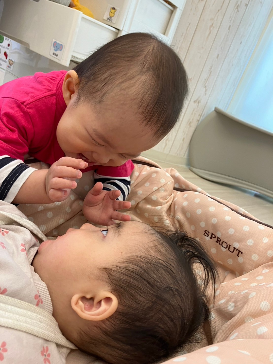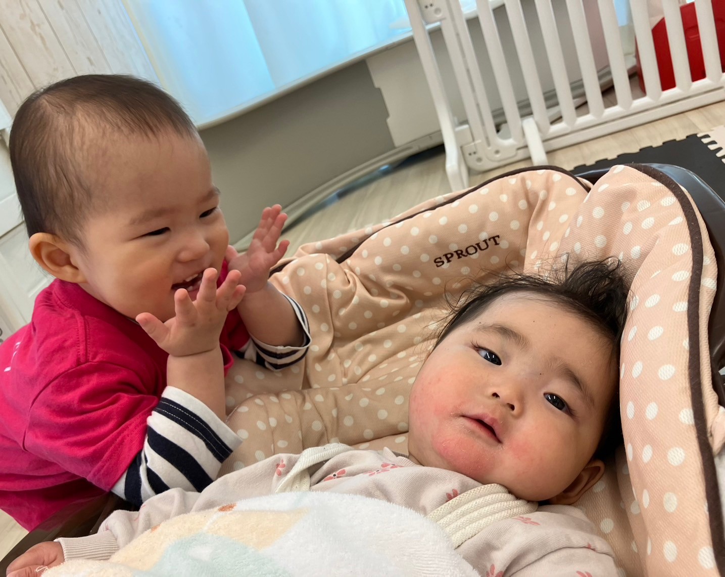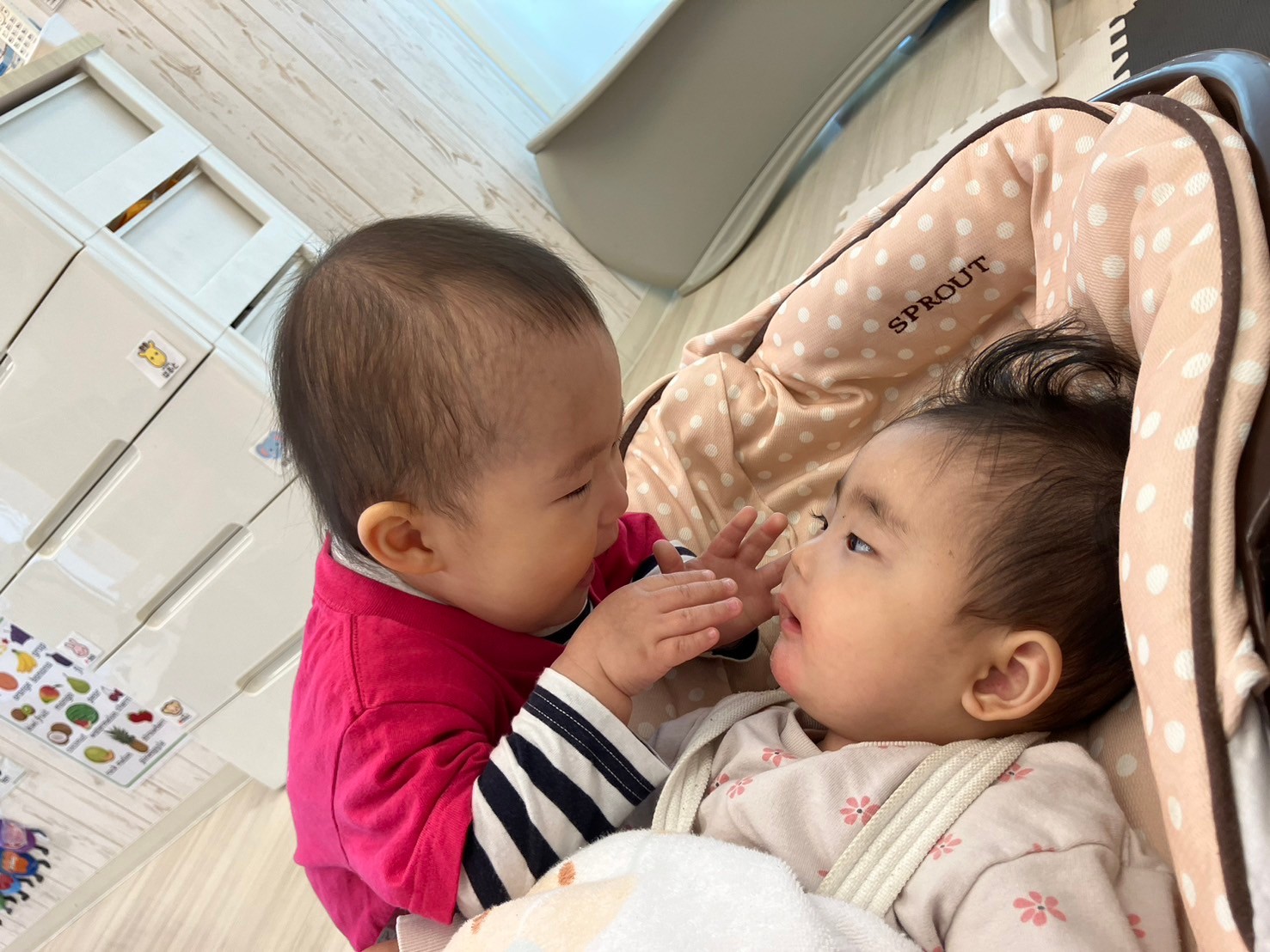 お友だち同士で“いないいないばあ!”を繰り返し楽しんでいます。
