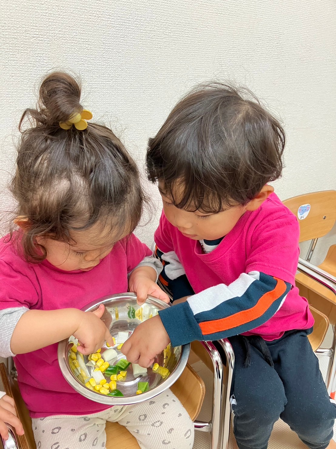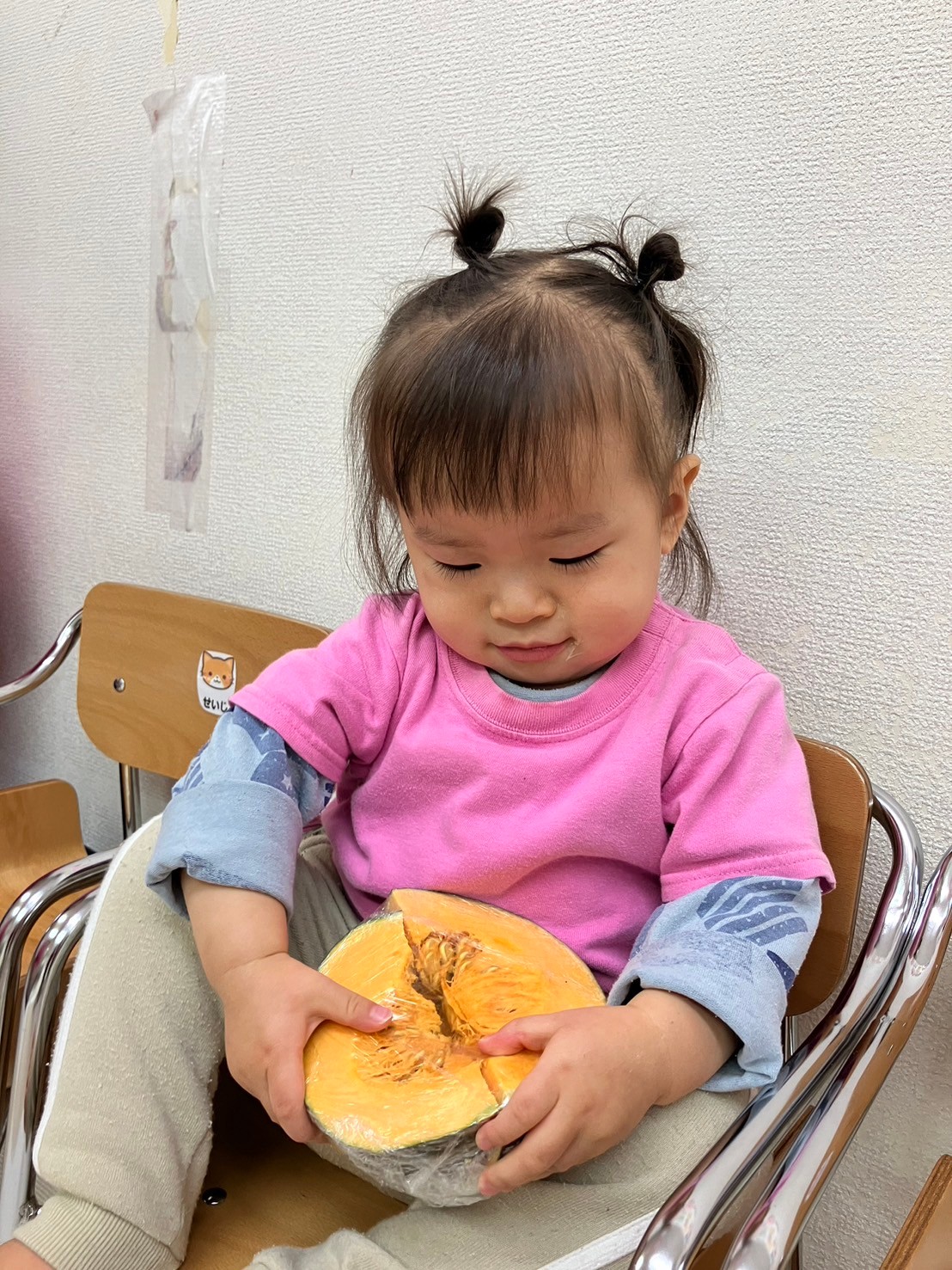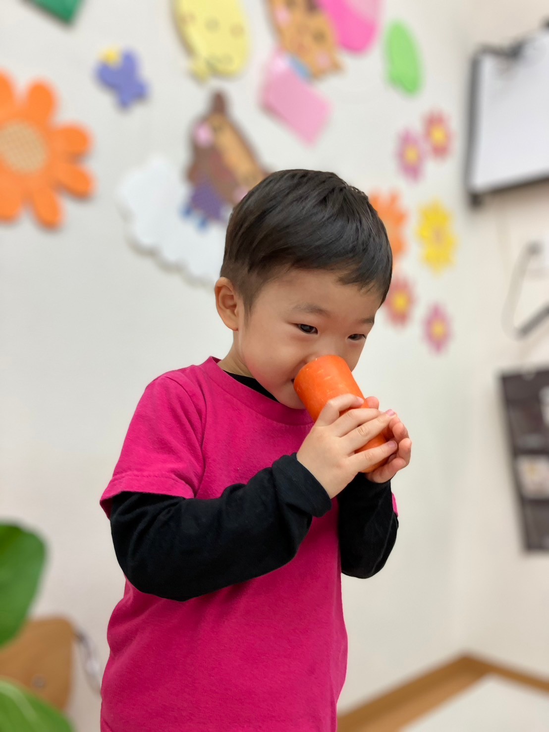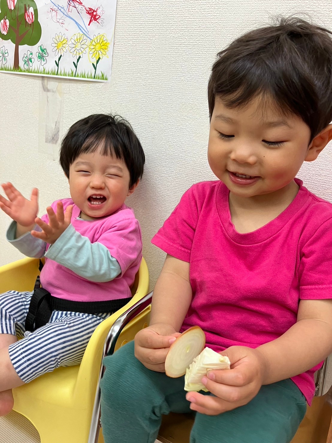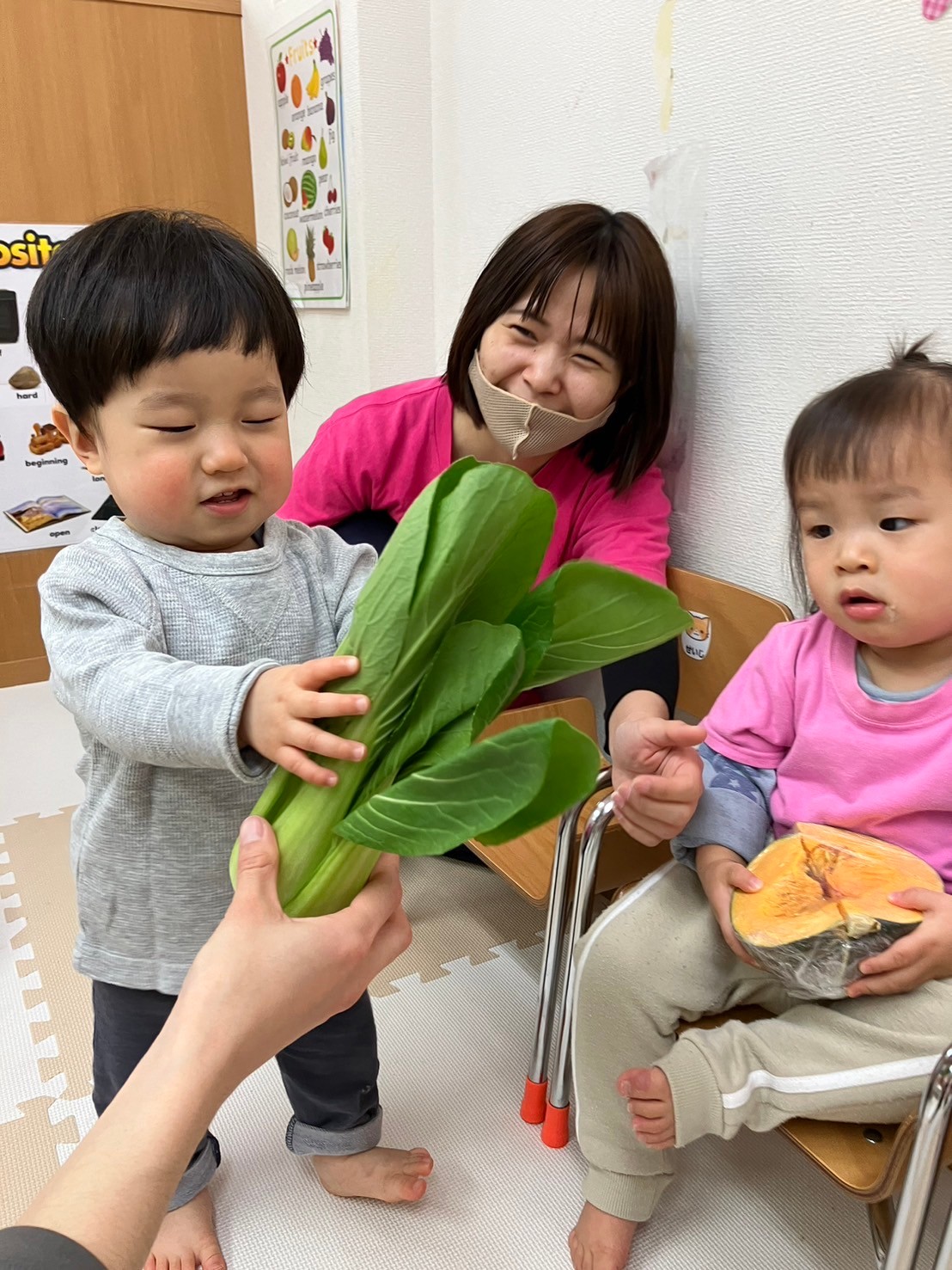 また調理室からその日に使う野菜達をお借りして触ったり、クンクンと匂いを嗅いだりしています。