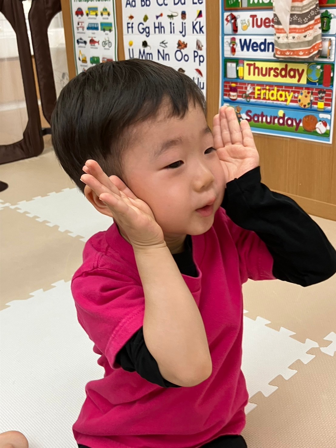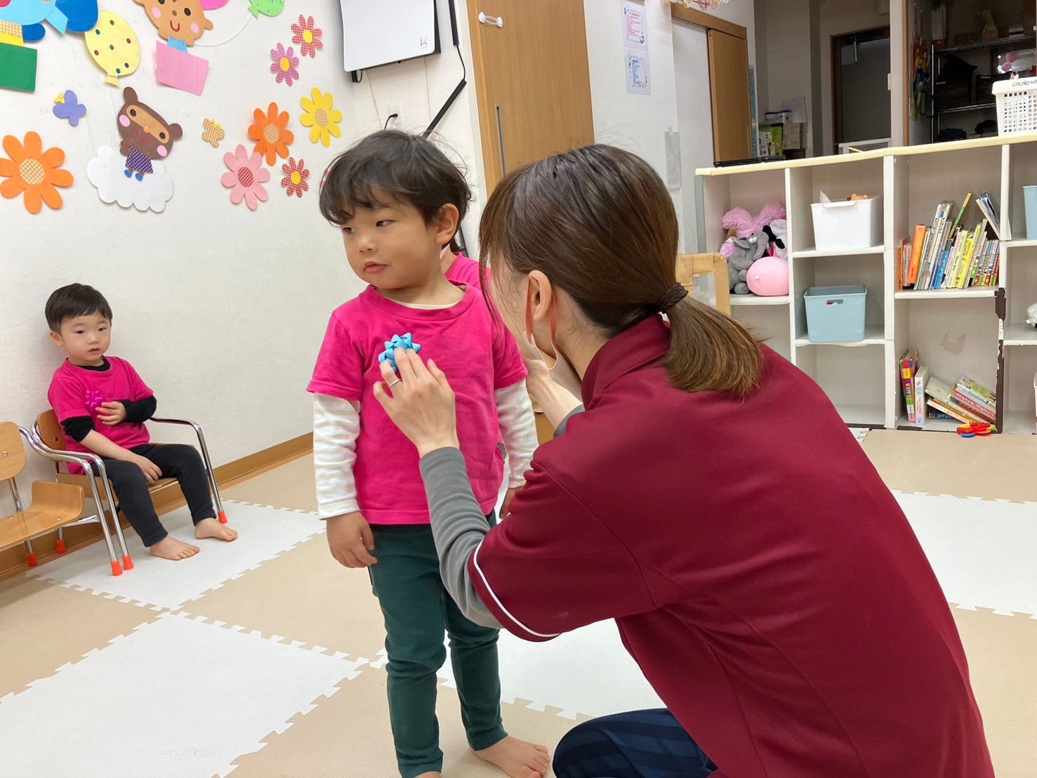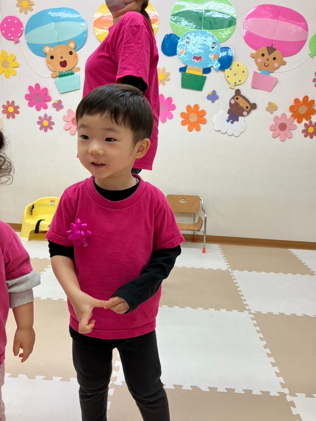 入園式ではお名前呼びや歌を歌ったりしました。入園、進級の証にリボンをつける場面では自分で好きな色を選んで嬉しそう。