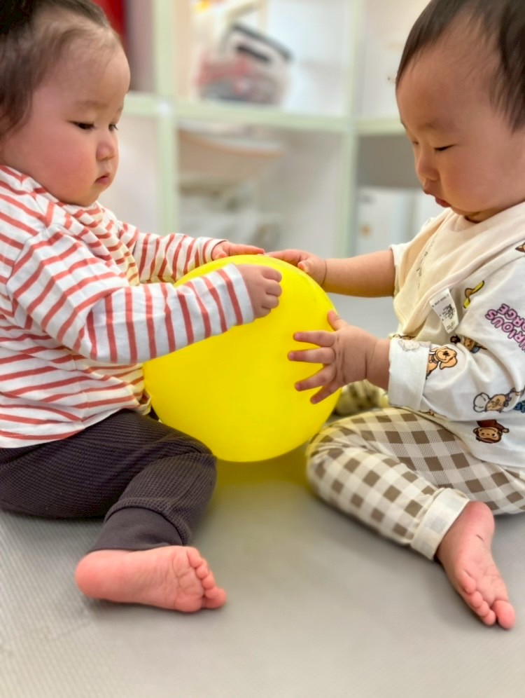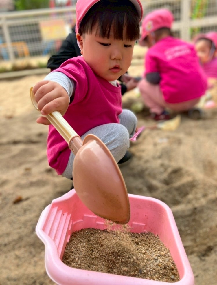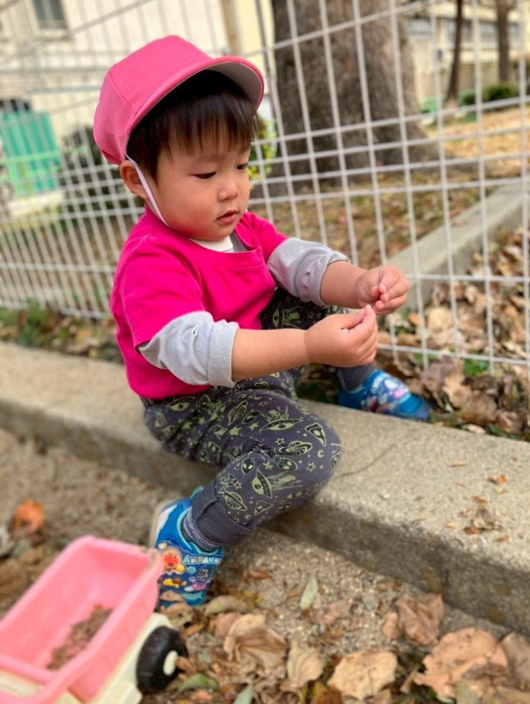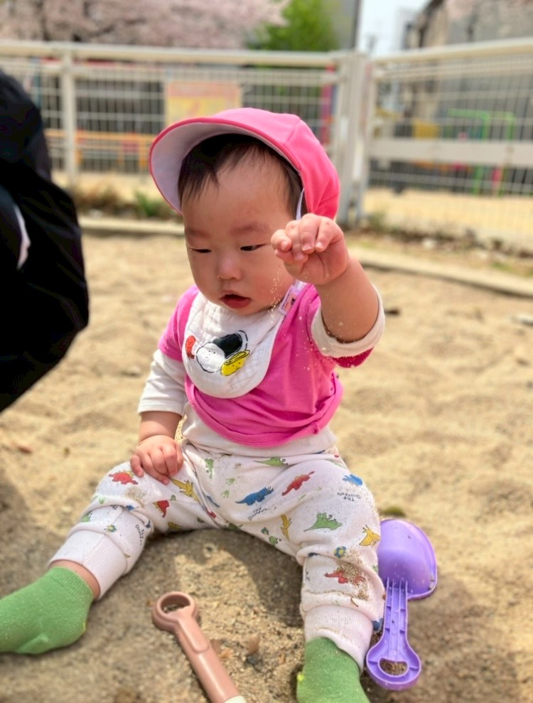 散歩では公園に行くとお砂場セットを広げ、赤ちゃんチームはスコップで上手にすくってはジャーと砂を落としたり、容器に入れて遊んだり、砂場でダイナミックにずり這いやハイハイをして移動して楽しんでいます♪