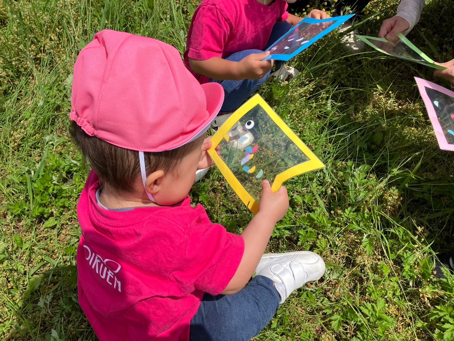 公園に行き、透明の鯉のぼりの部分を使って色んな模様に変身です。