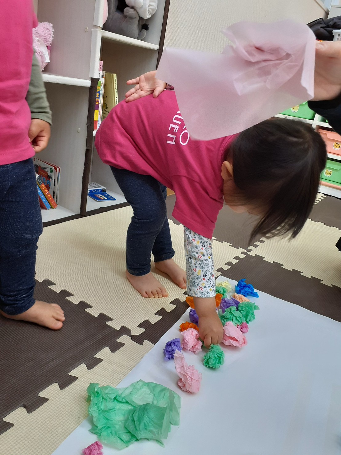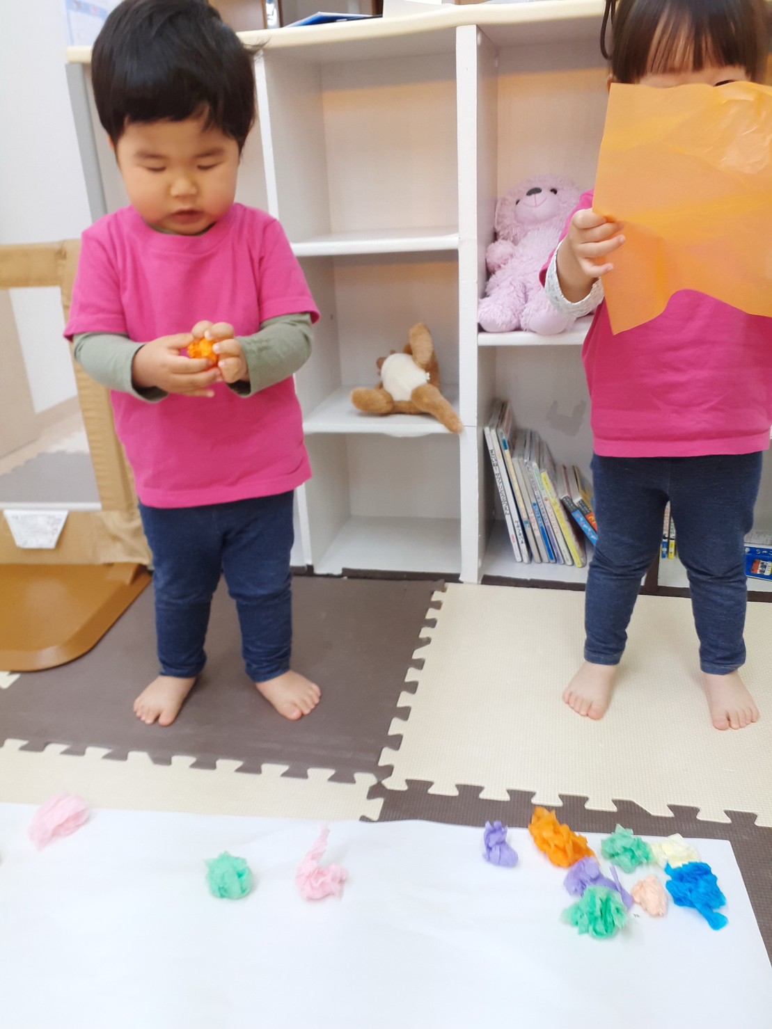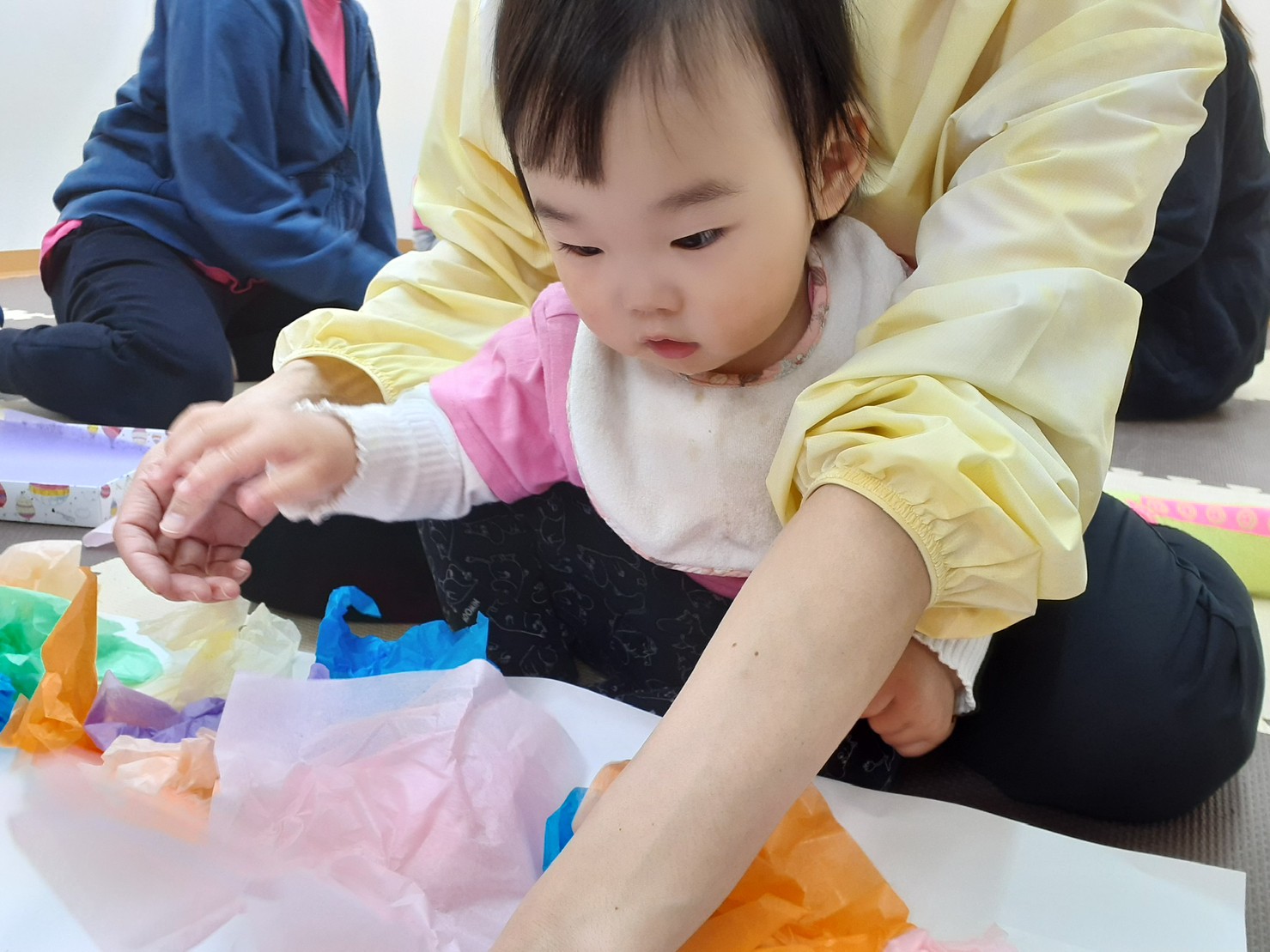 花紙をくしゃくしゃとして、「ぺったん」「ここ」「あーか」など、たくさんお話をしながら楽しんで作っていました。