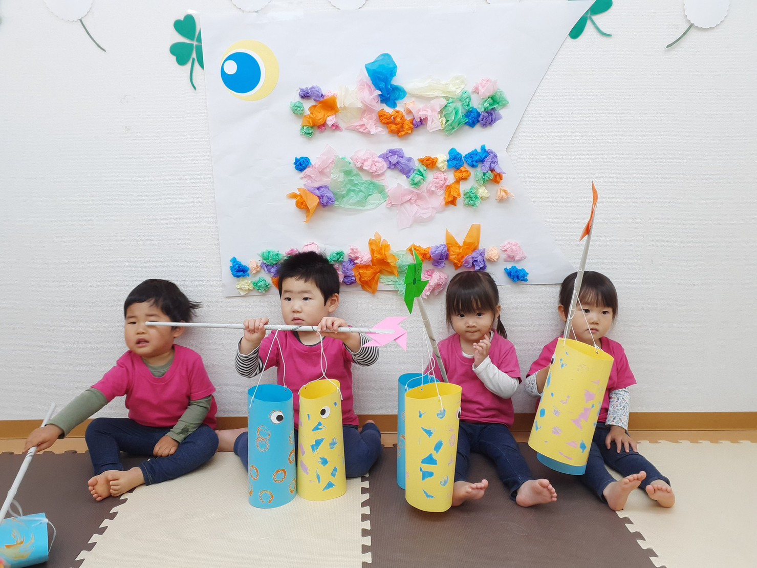 1歳児、2歳児に分かれ、花紙を貼りこいのぼりを作りました。