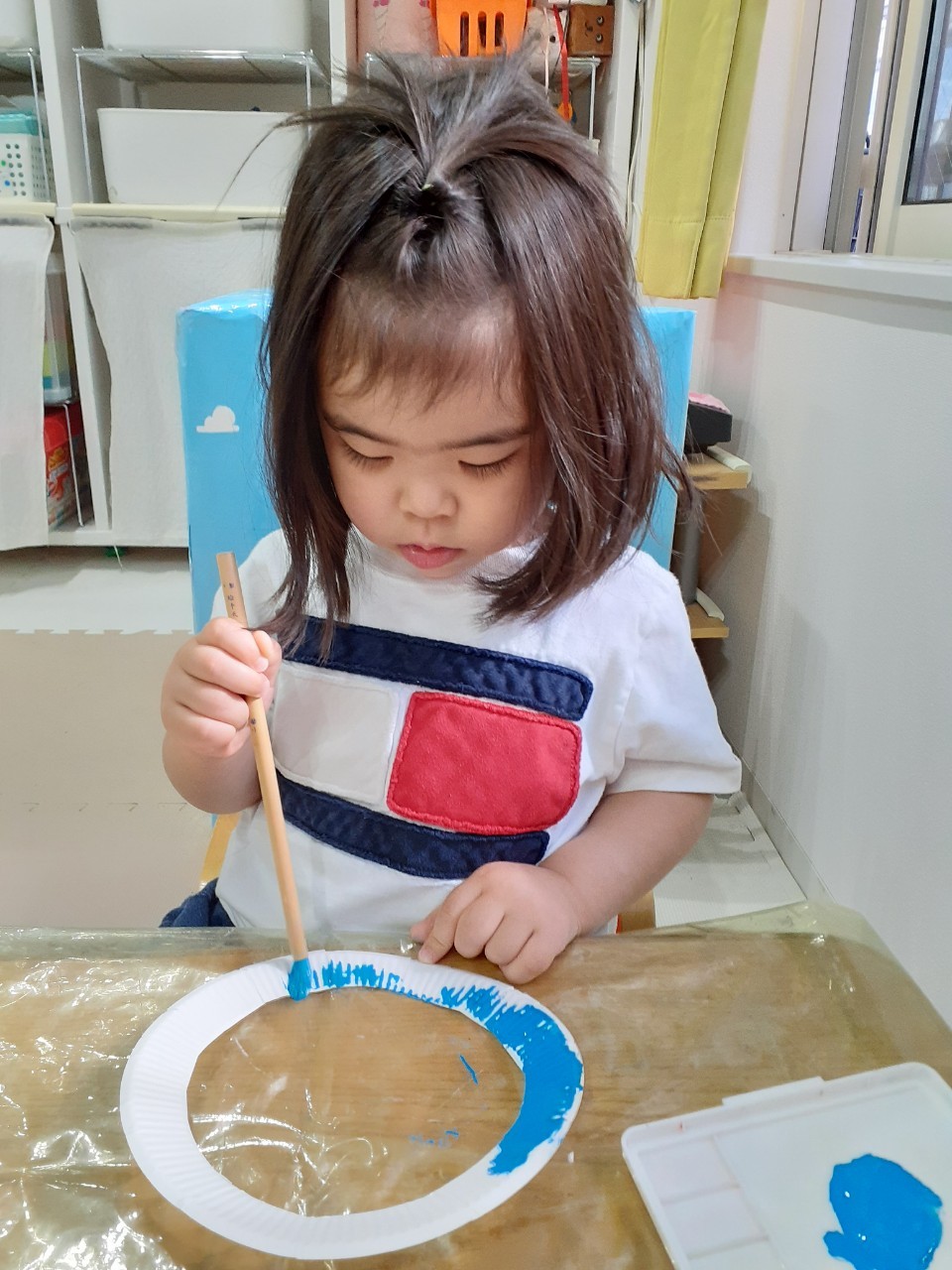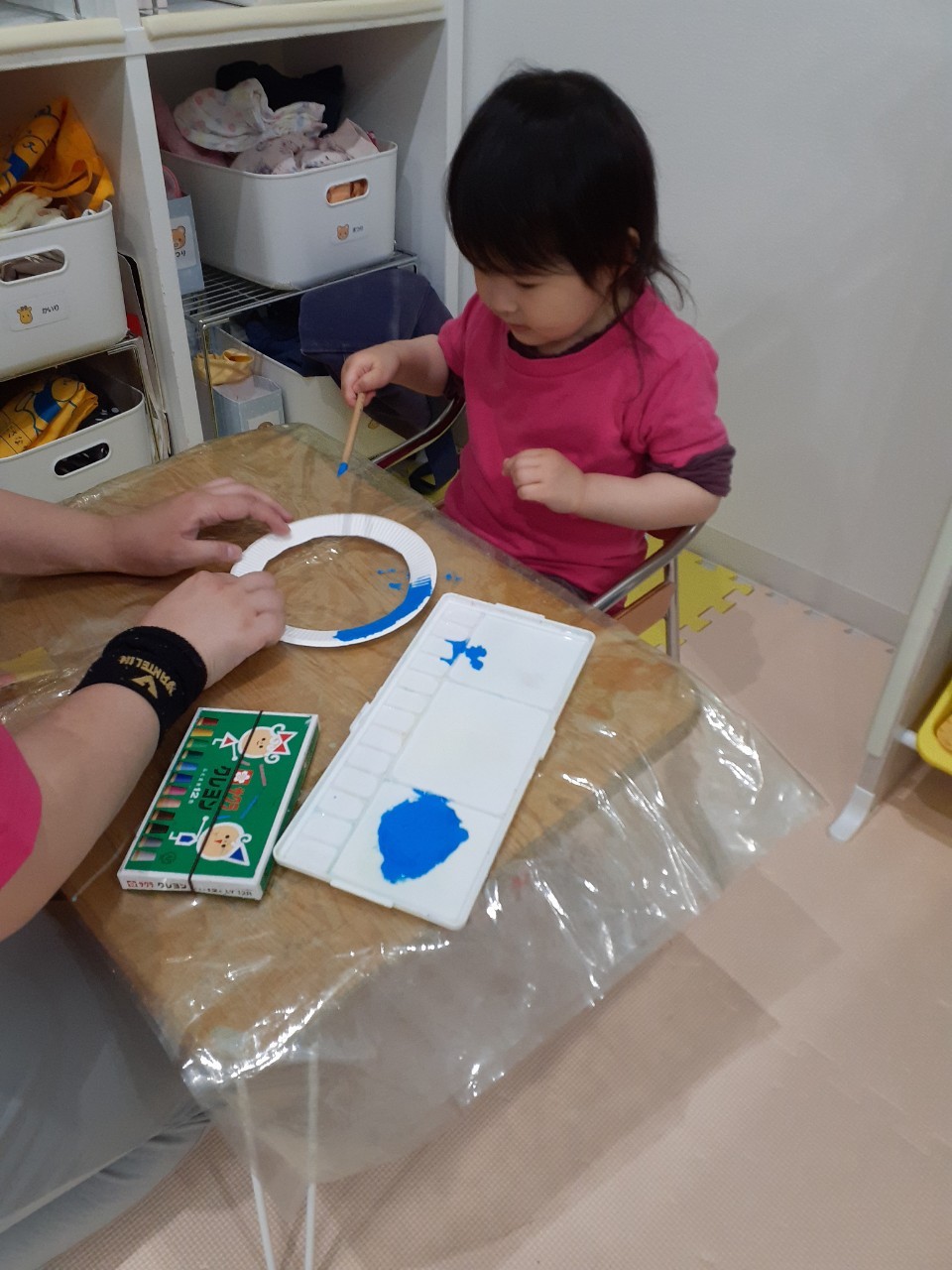 絵の具で「塗り塗り」と言いながら紙皿に色を塗ったり可愛い小さなこいのぼりを付けたりしました♡