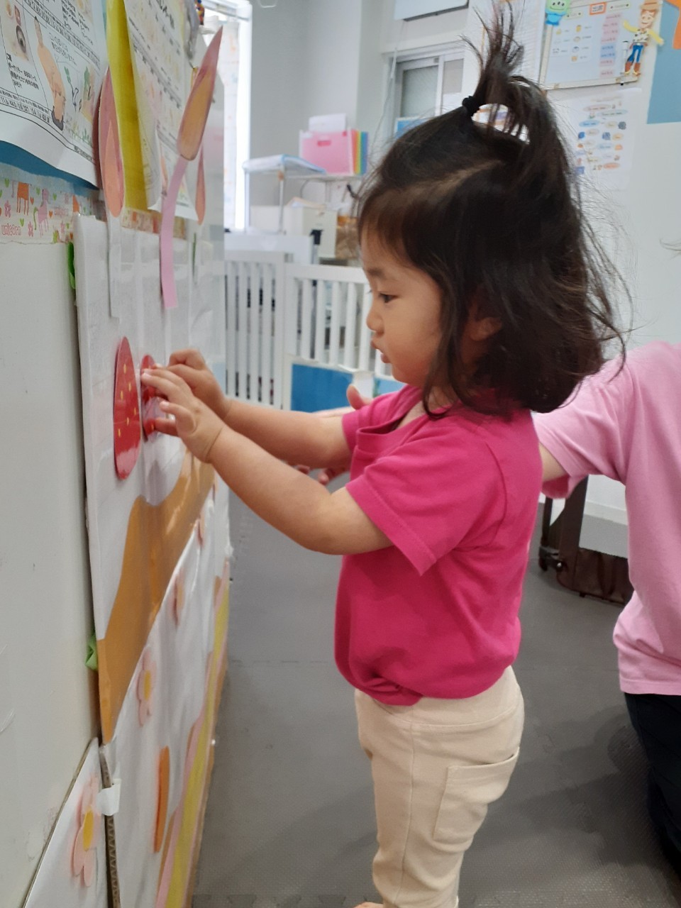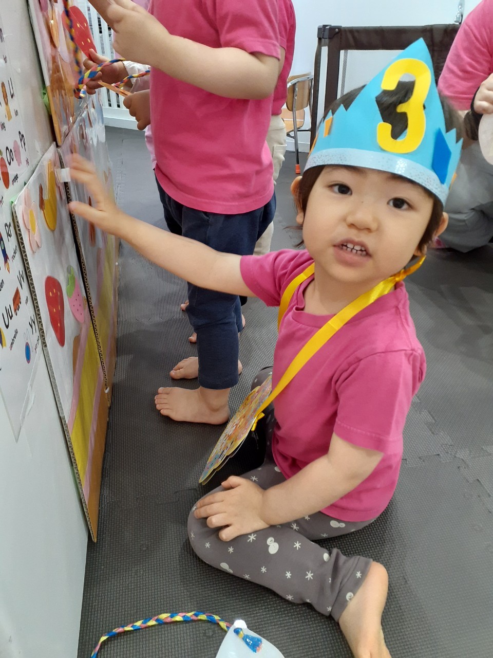 誕生日以外のお友だちと協力しながら巨大なケーキにフルーツを沢山つけて美味しそうなケーキを作ってくれました☆