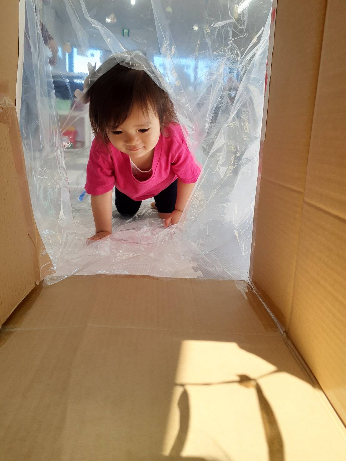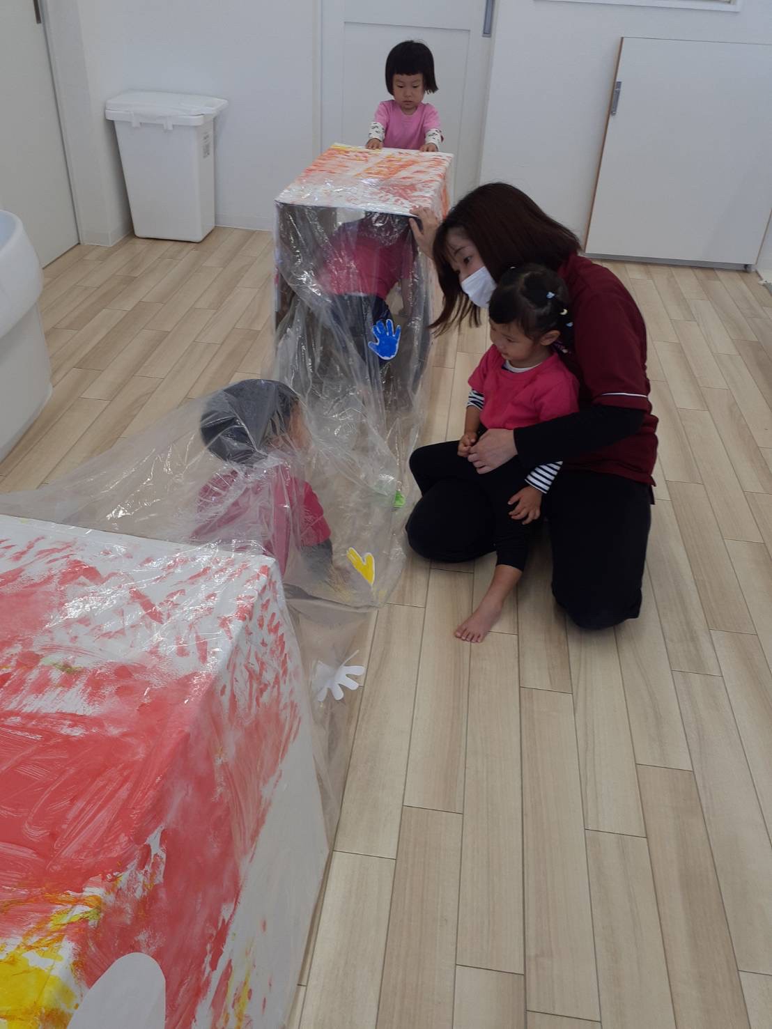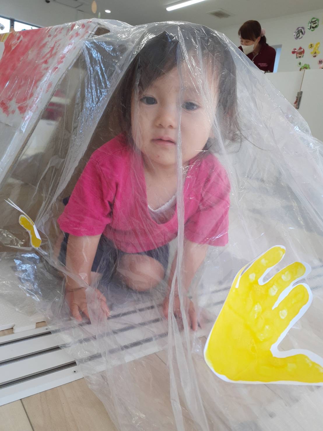 しかし、保育者の「どうぞお入り下さ〜い!」「楽しいよ〜」の声を聞くと安心したようで嬉しそうに中に入っていき「キャッキャッ」と喜んだり、「やっほ〜」と顔を覗かせたりする可愛い姿が見られました。