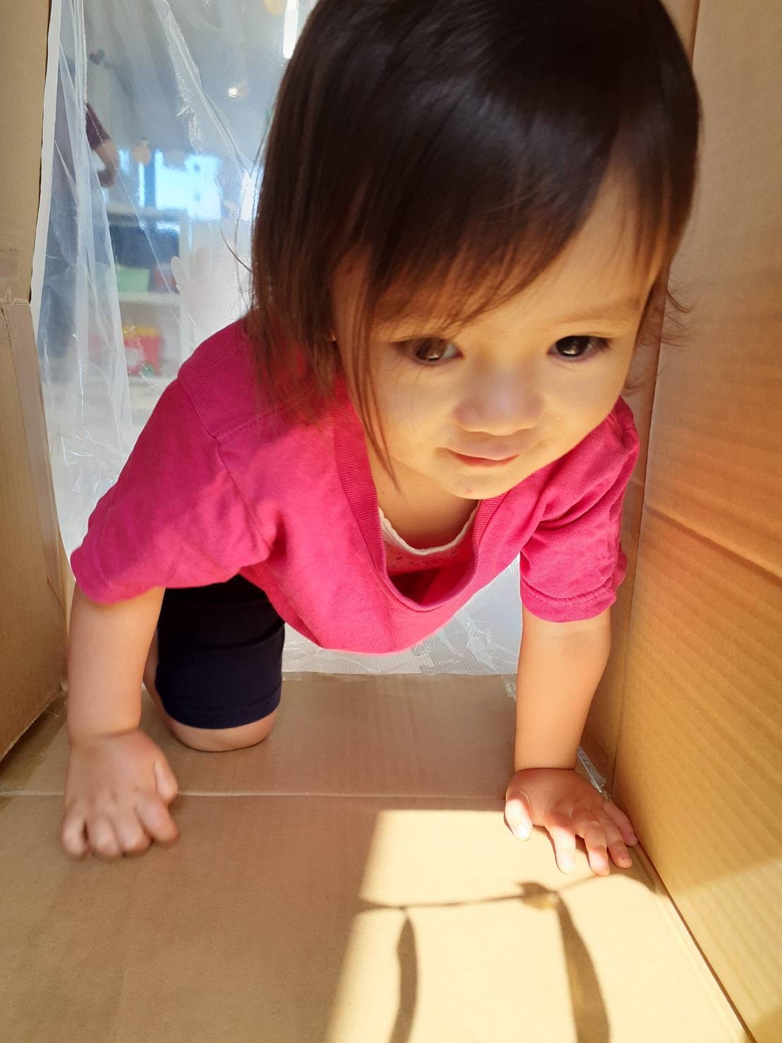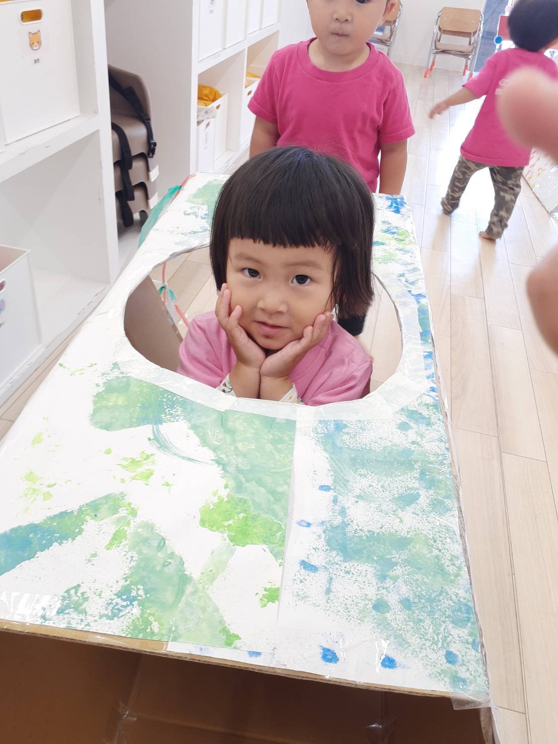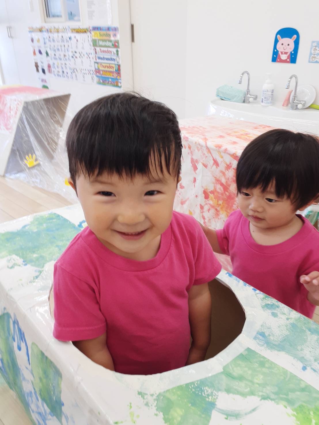 しかし、保育者の「どうぞお入り下さ〜い!」「楽しいよ〜」の声を聞くと安心したようで嬉しそうに中に入っていき「キャッキャッ」と喜んだり、「やっほ〜」と顔を覗かせたりする可愛い姿が見られました。