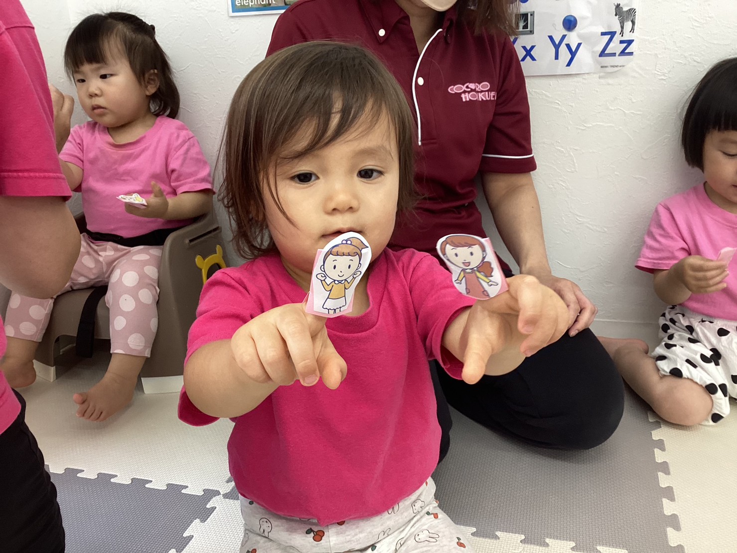 sister(薬指)baby(小指)というように各指に人形を付けて、こどもたちと手遊びをしながら歌いました。