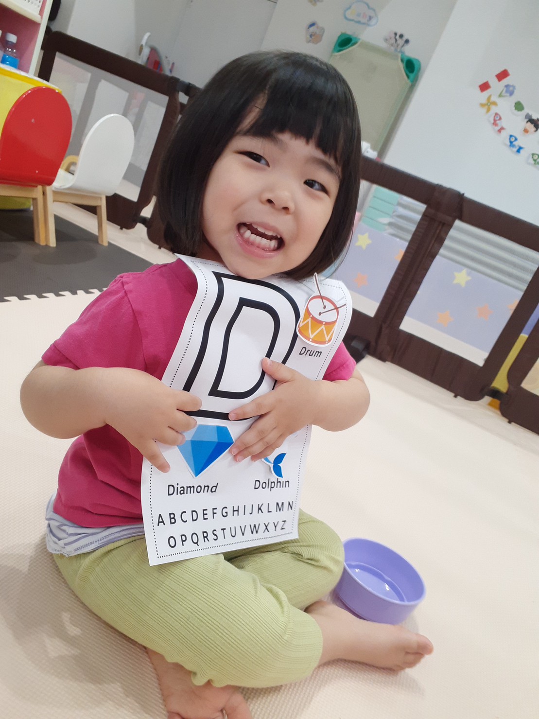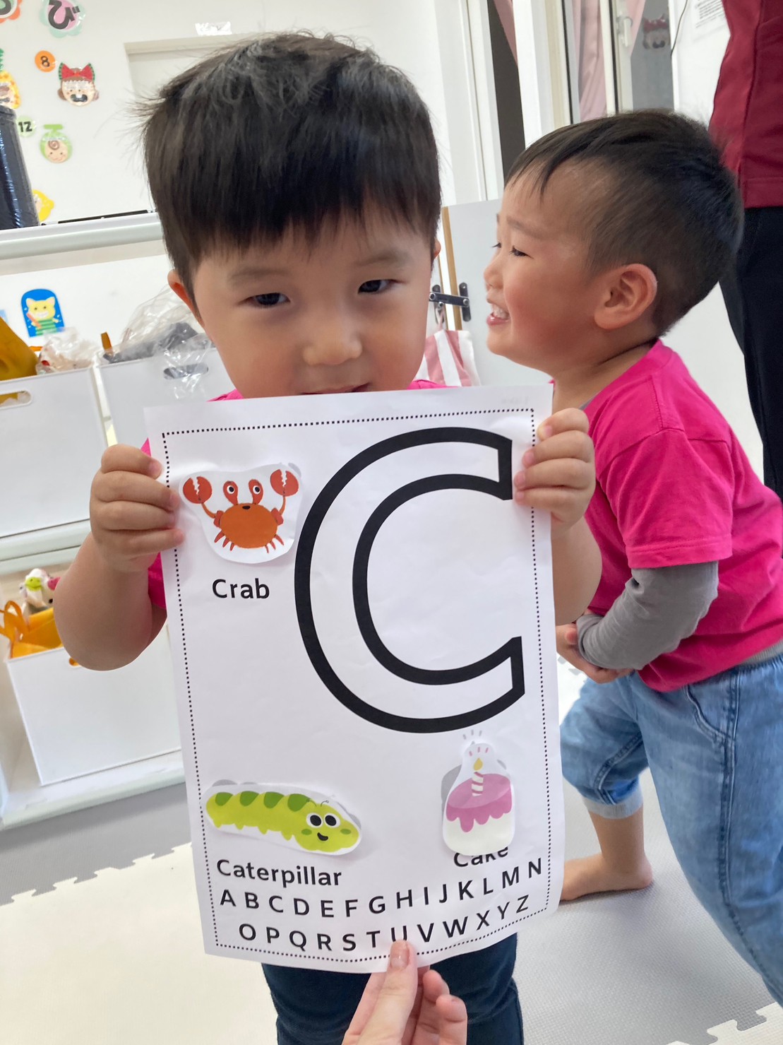アルファベットワークシートは、”C”(cake, crab, caterpillar)と”D”(diamond, dolphin, drum)を行いました。