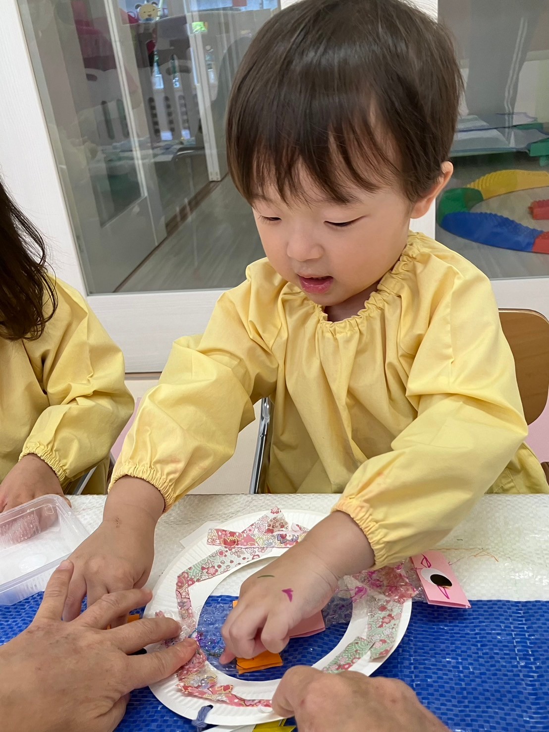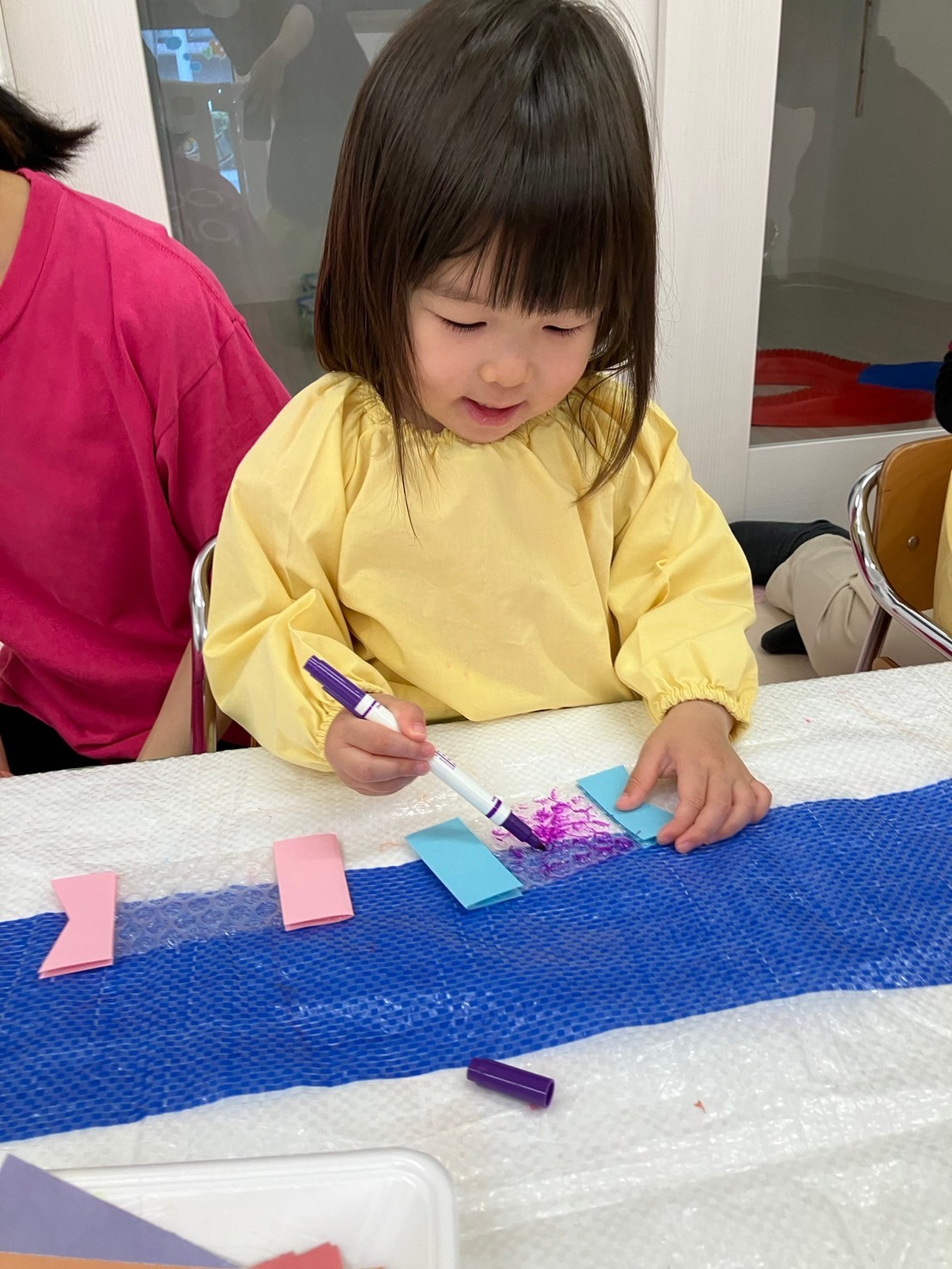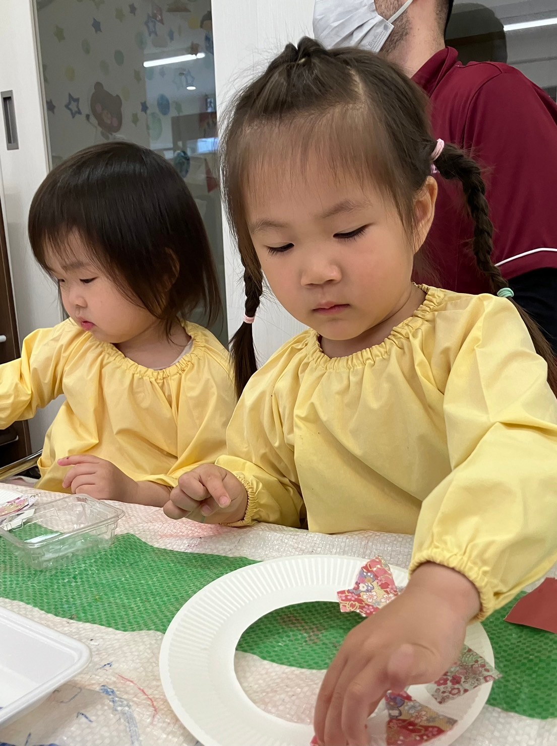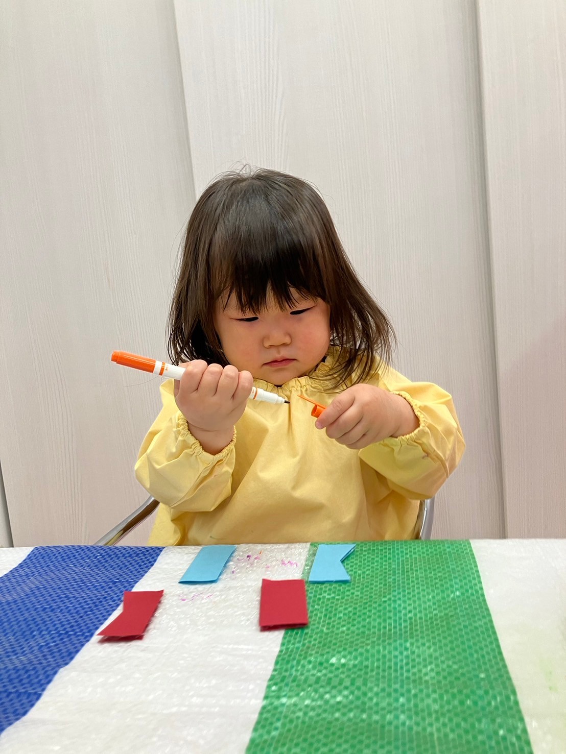 好きなペンを選んで鱗に色つけたり、折り紙をちぎり貼りをして可愛いこいのぼりが完成!