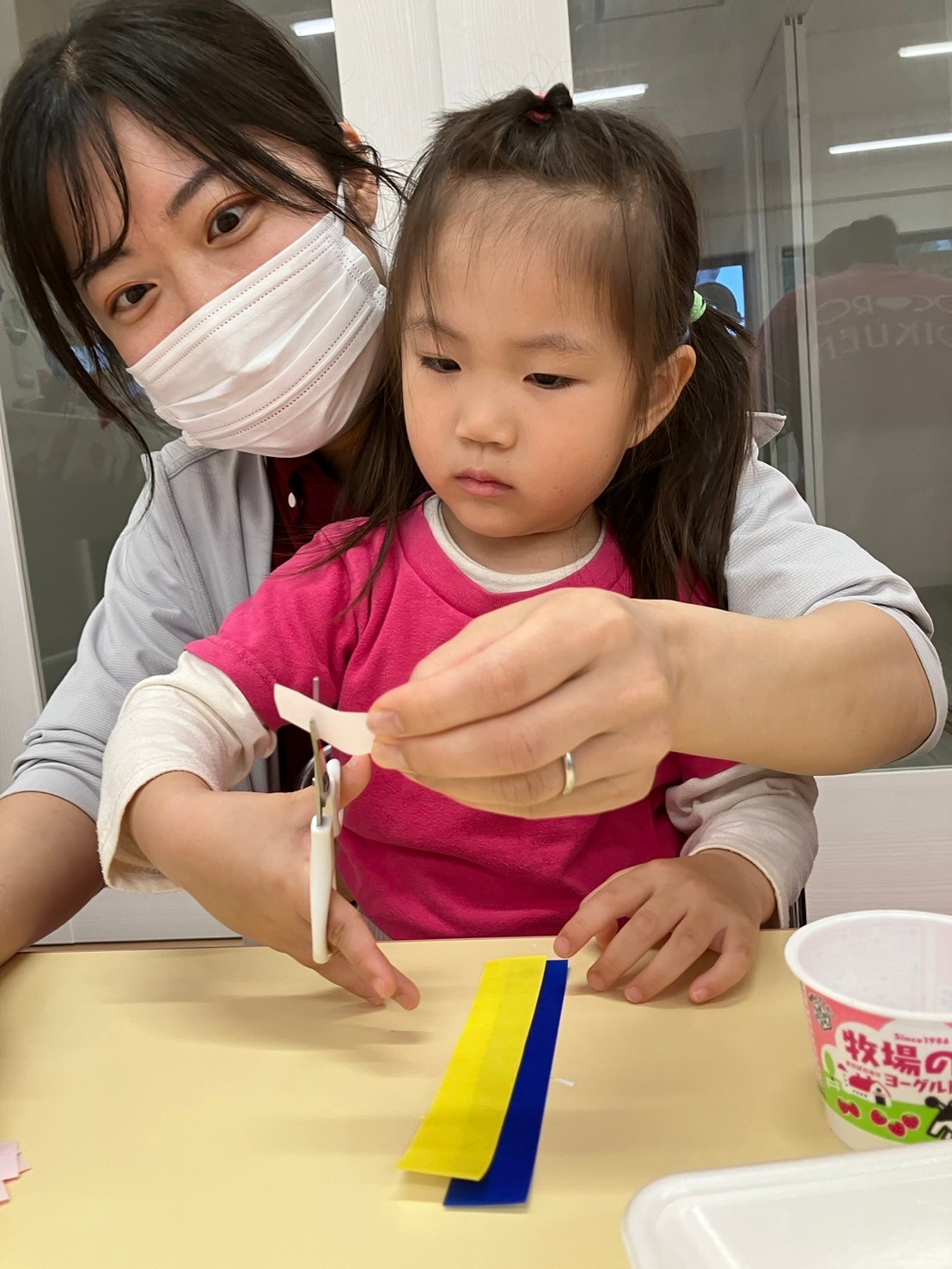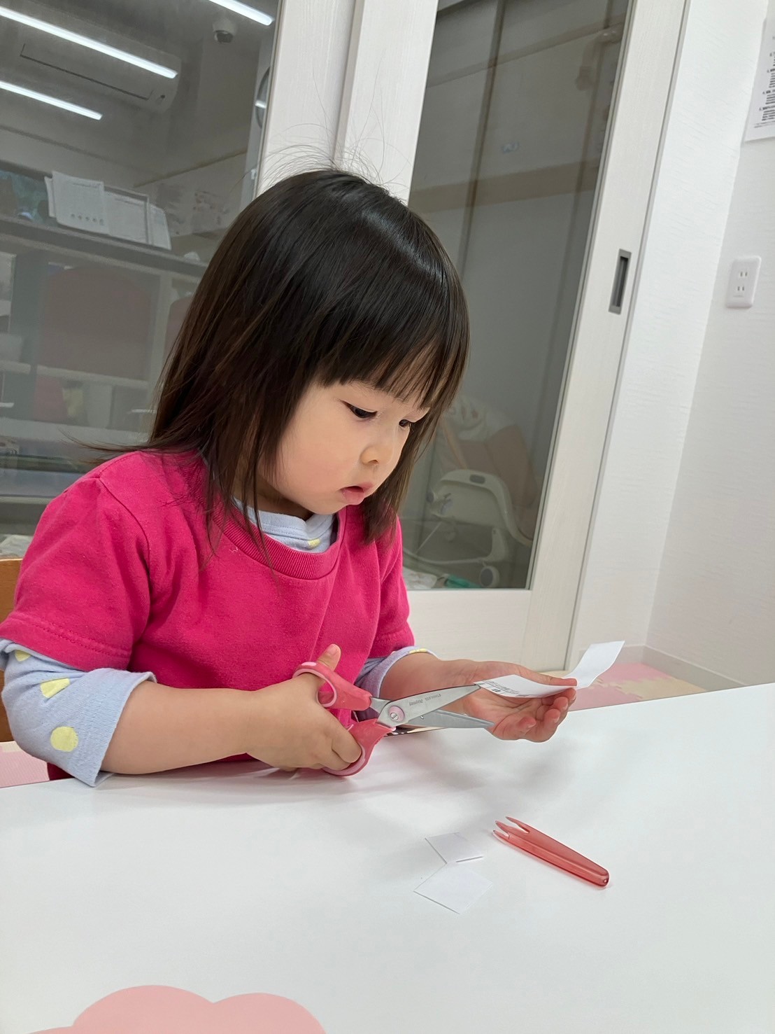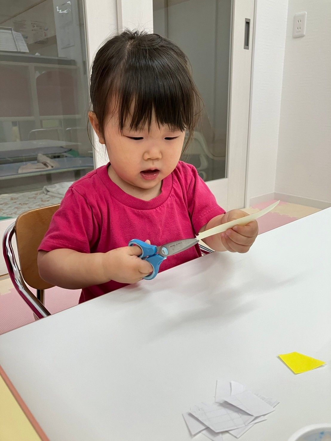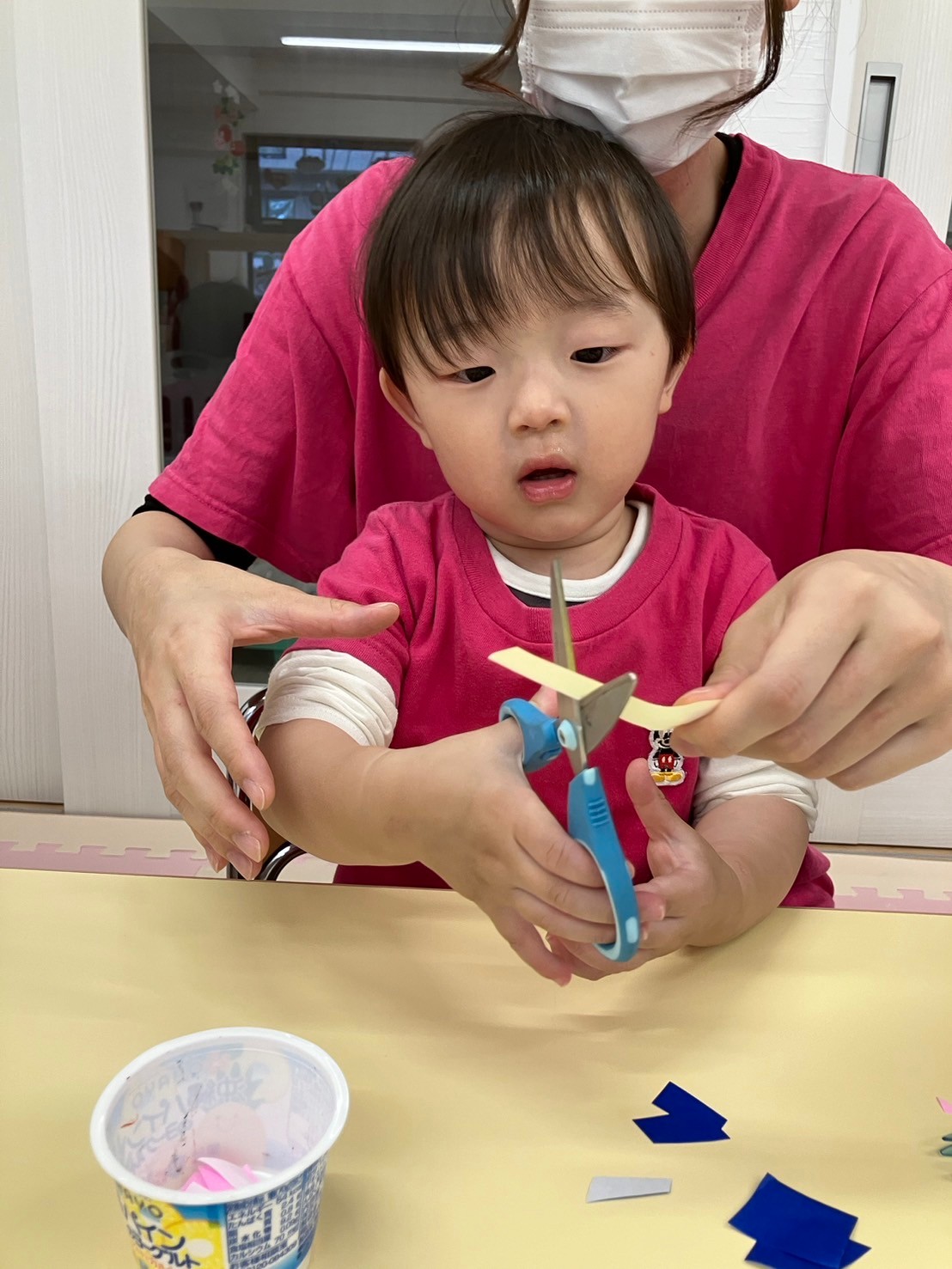 それぞれハサミを握り、自分の力で切ろうと頑張っていました。