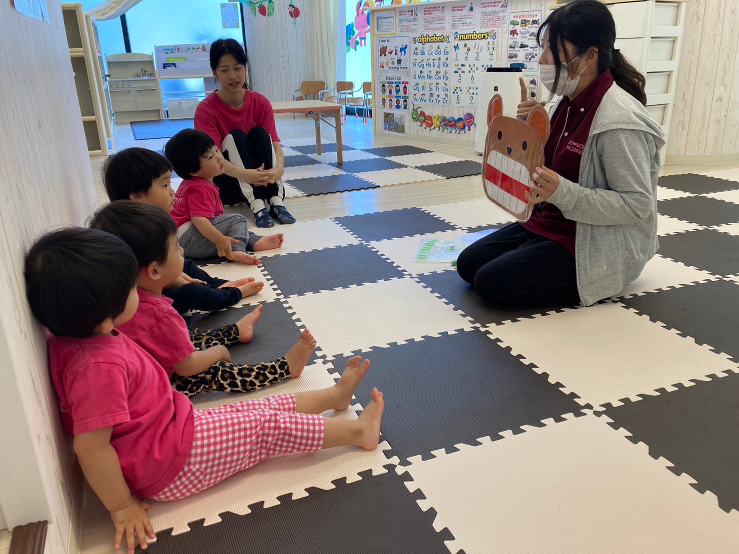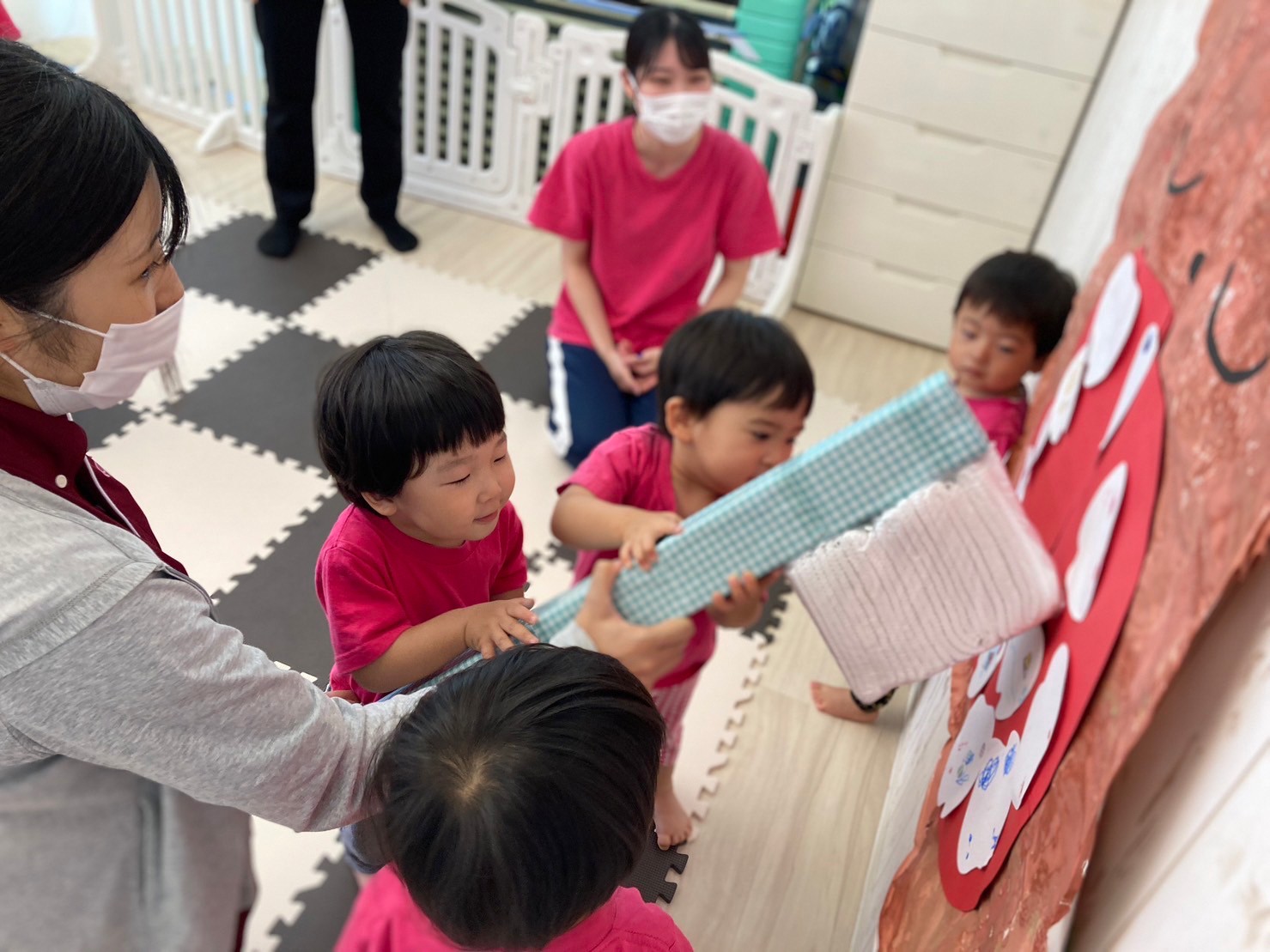 保育者が「ばいきんさんがきちゃう、どうしたら良いかな」と問いかけると「はみがき!」と答えてくれる姿も見られました。