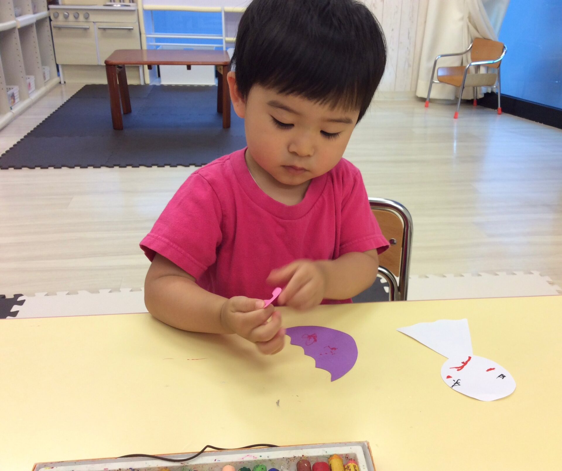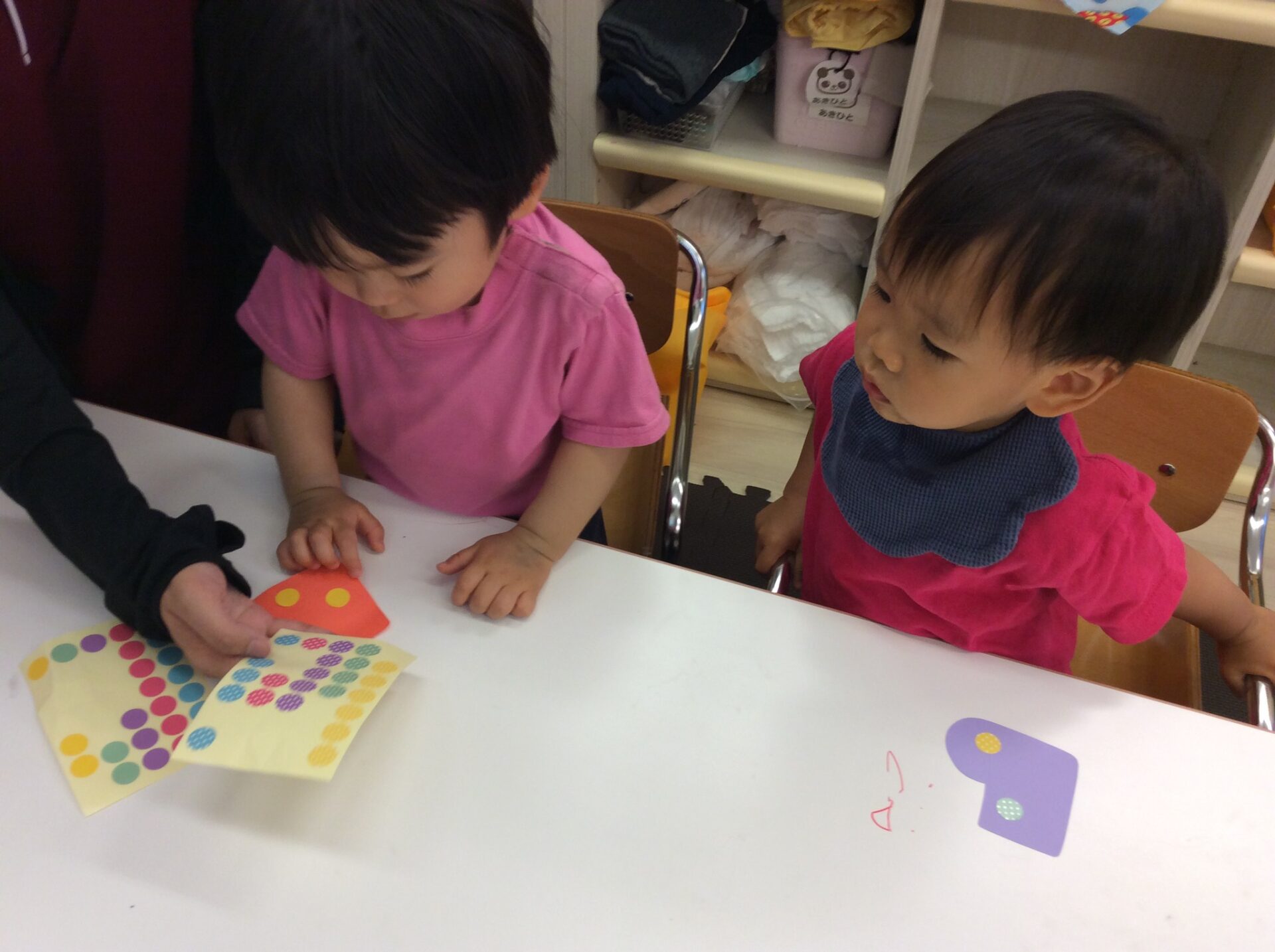 0歳児は傘やてるてる坊主にシールを貼り、1.2歳児はクレパスやシールを使って、てるてる坊主の目を描きました。