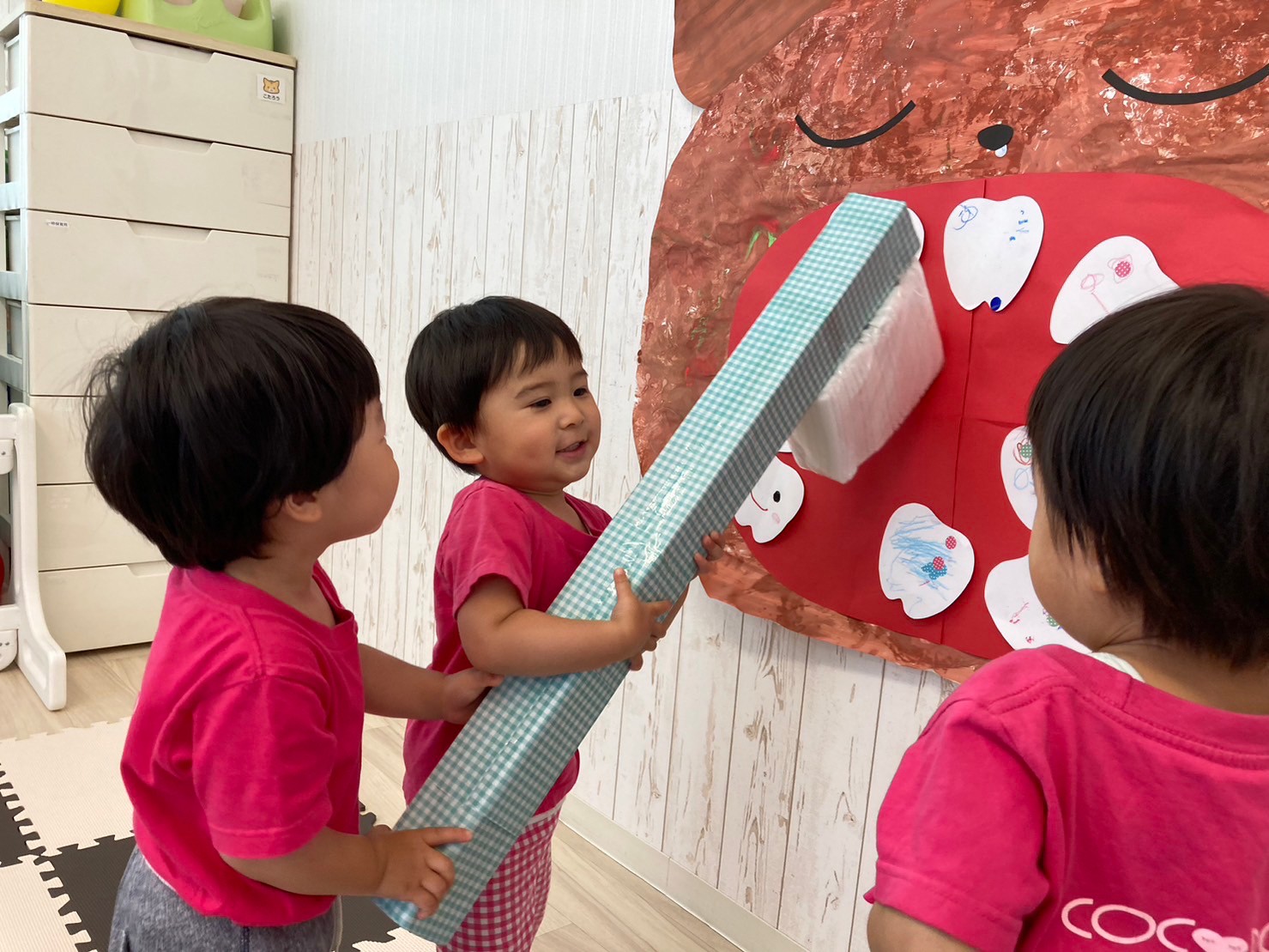 みんなでかわいい歯を作り、クマの口を完成させると、大きな歯ブラシを使って歯磨きを楽しむ子どもたちでした。