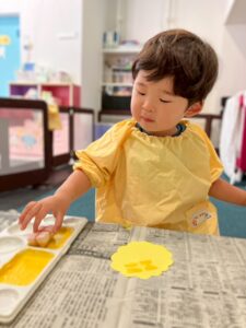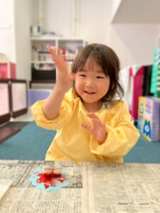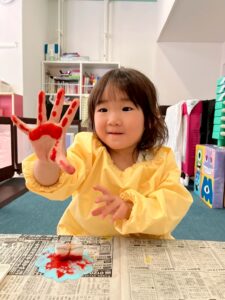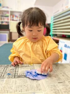 手に絵具が付かないように慎重に取り組む子や、大胆に手でやりたい!と言う子