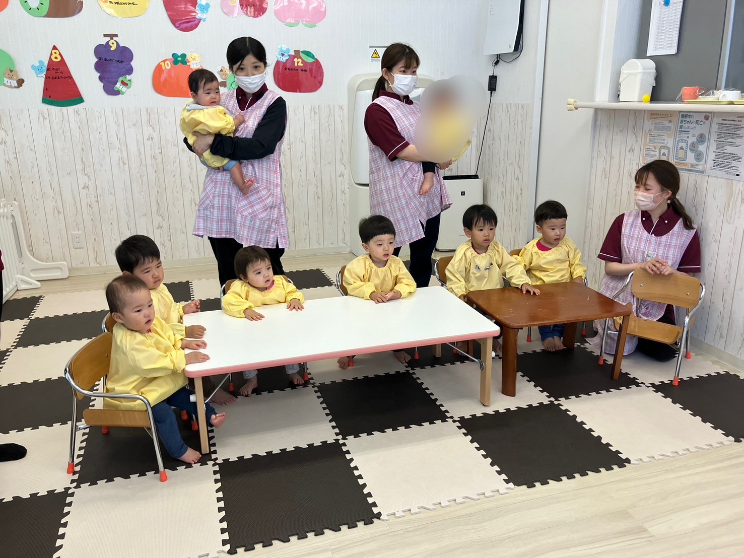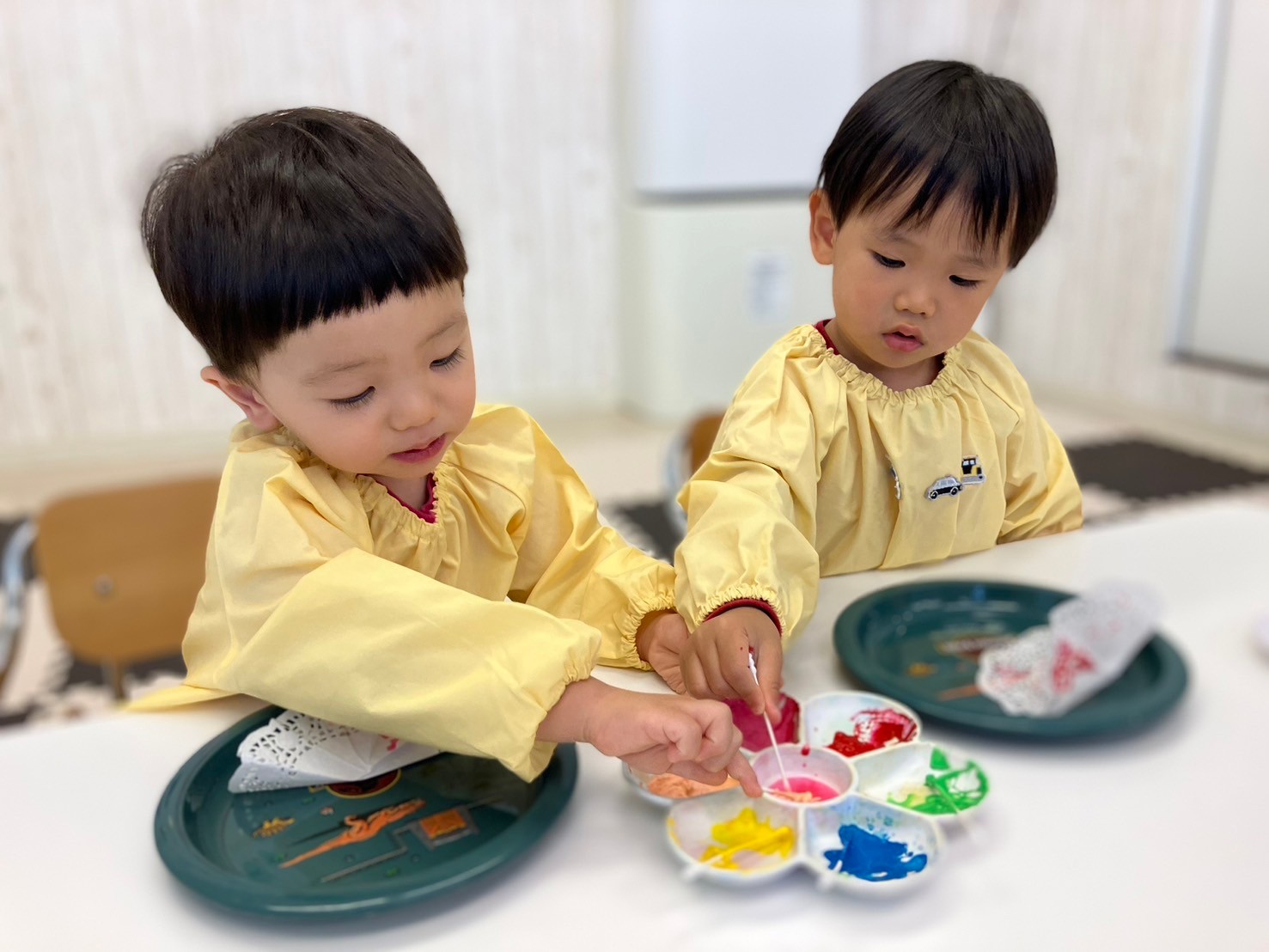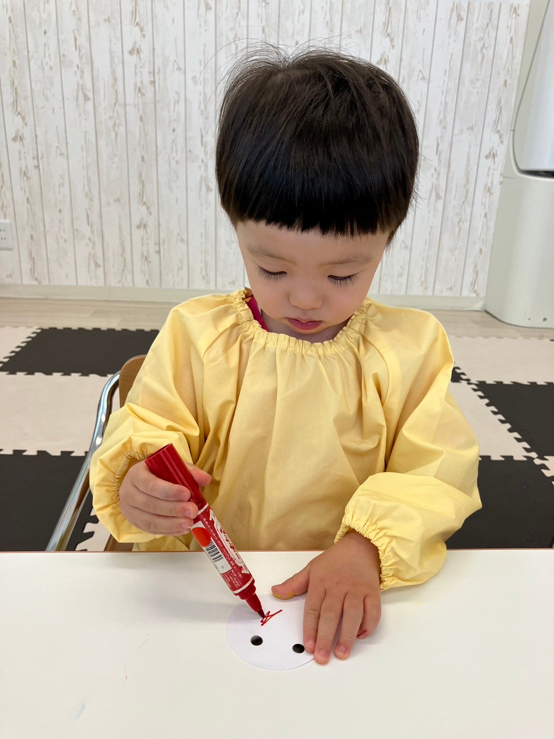 0、1歳児は目や口をシールで貼り、2歳児はペンを使って描きました。