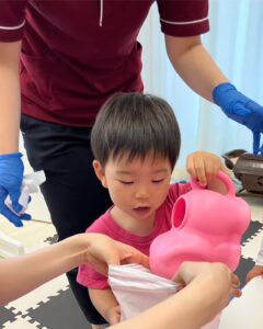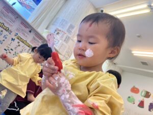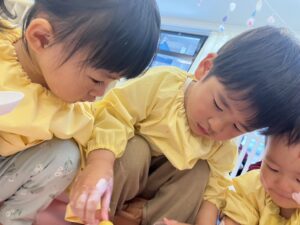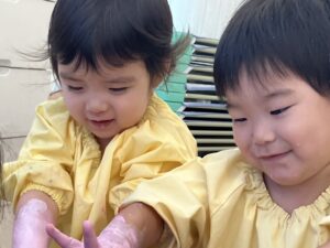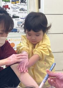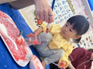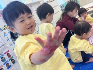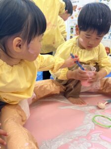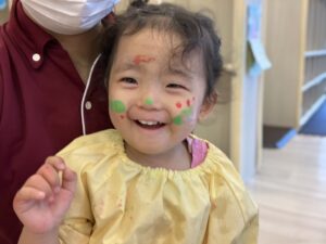 「ここにもぬってみる〜!」「ぴんくになったよー!」とあっという間に身体がカラフルになりました。