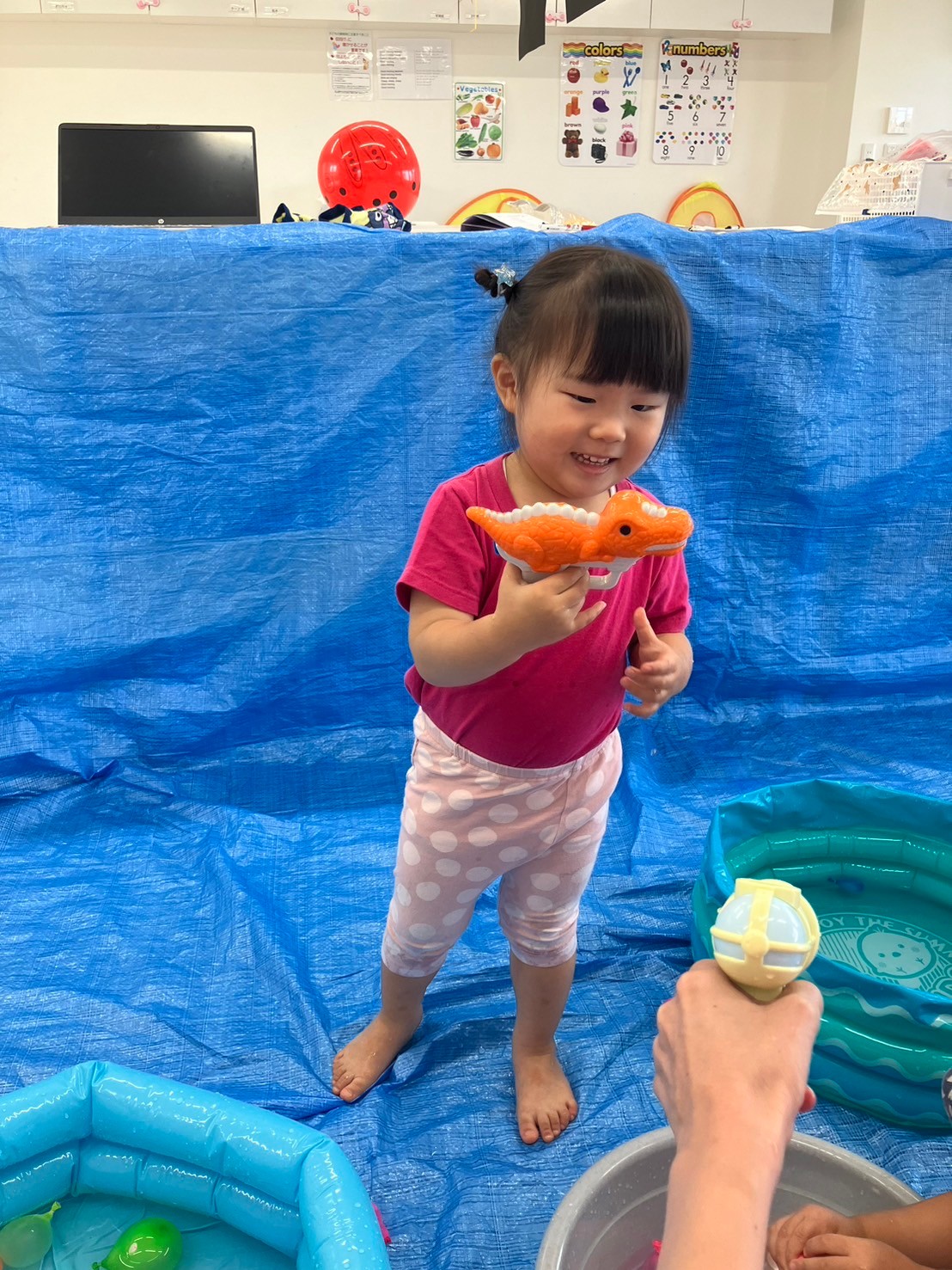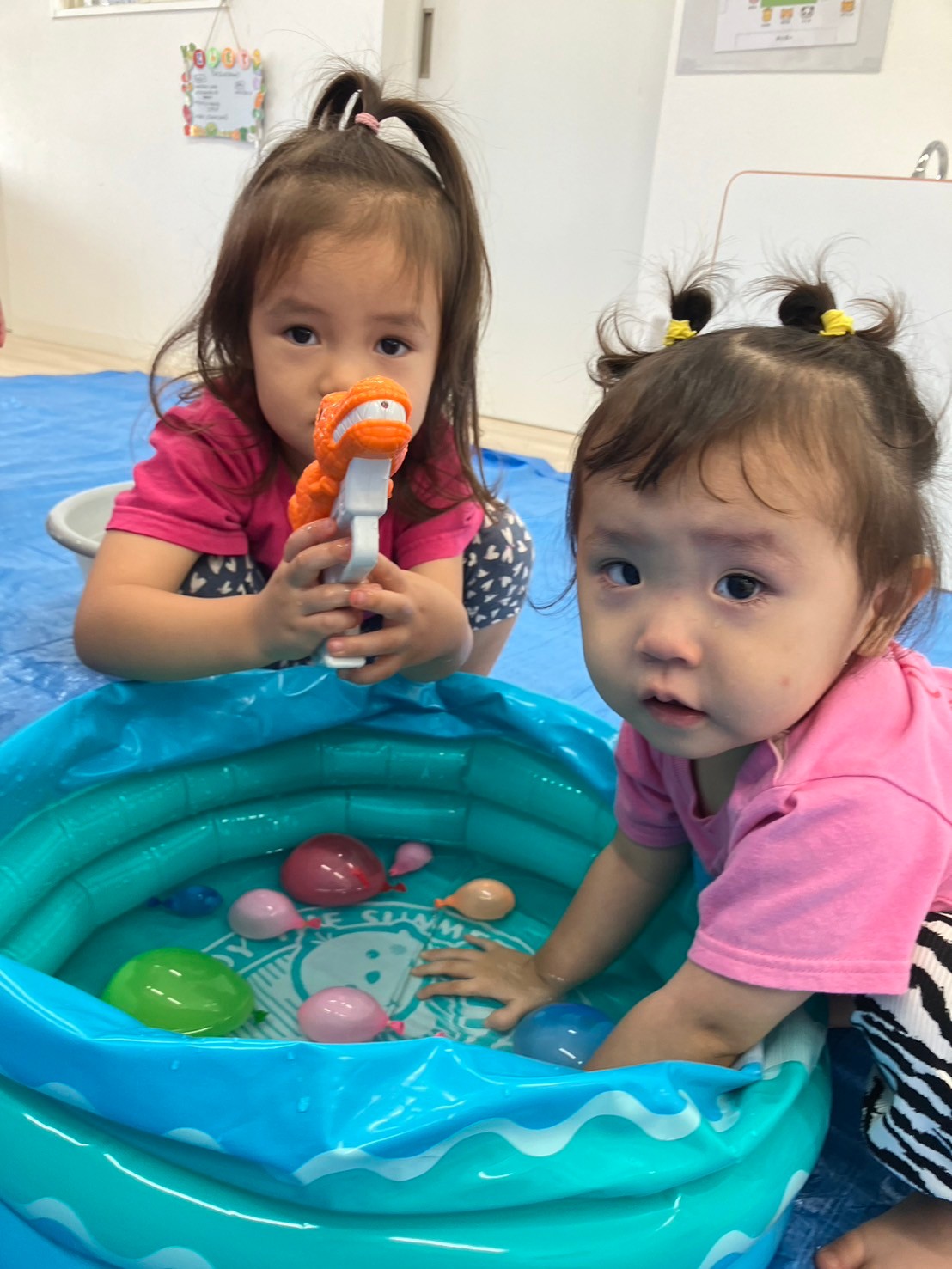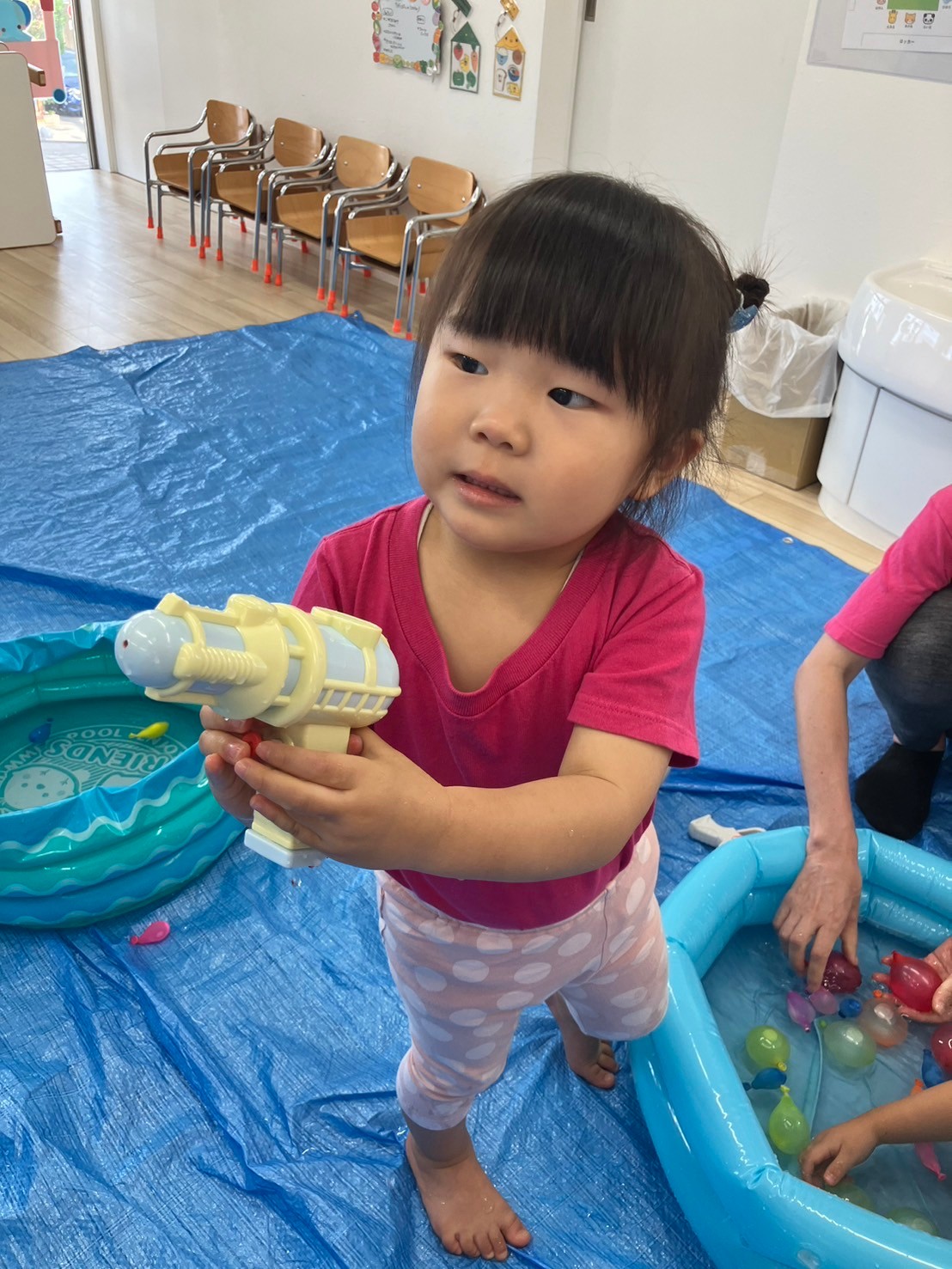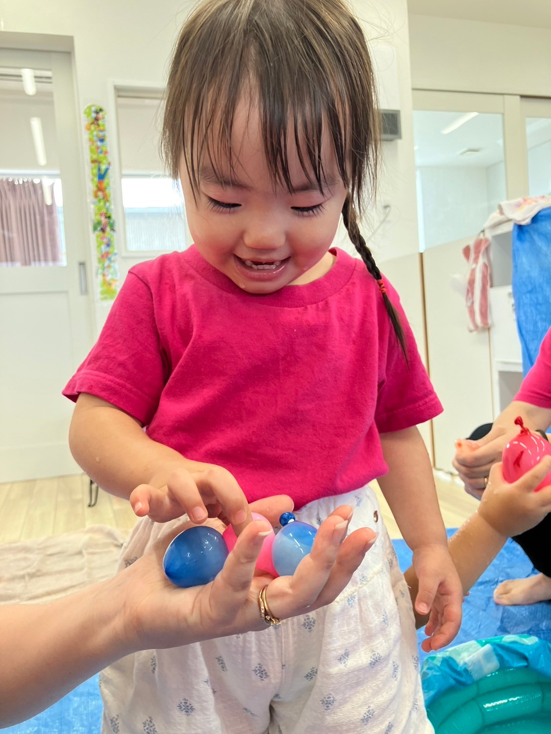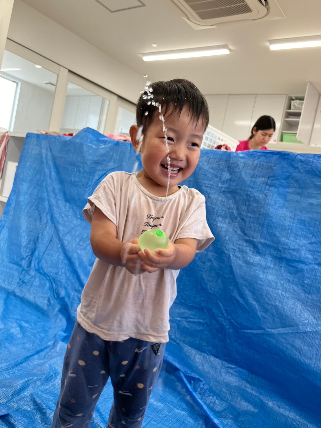 水風船が弾ける感覚や、水鉄砲を押すことに指先を使ったり水をかけられたときの刺激を味わったりと、ほかの遊びでは感じることのできない五感をたくさん使って遊んでいる子どもたち。