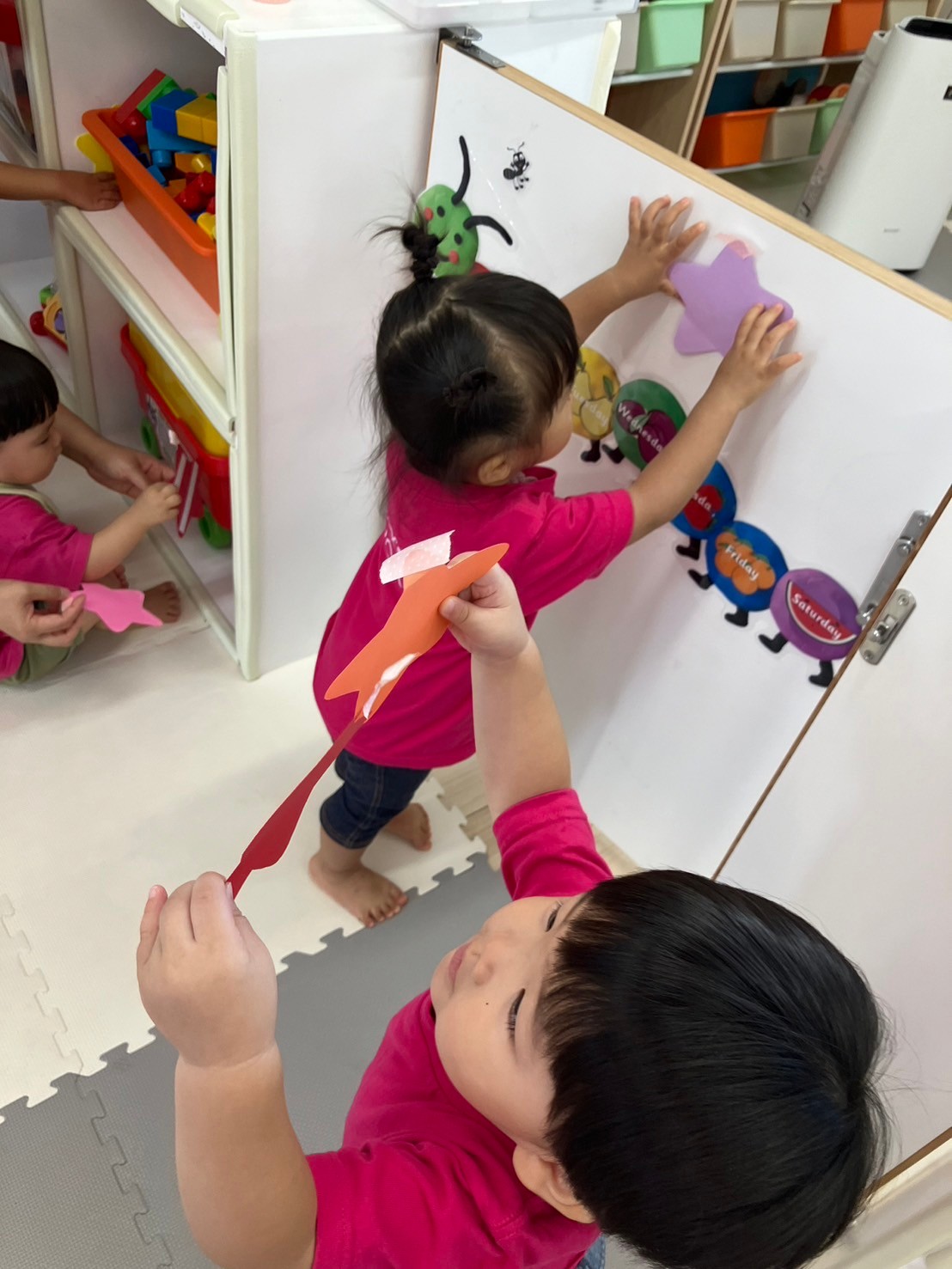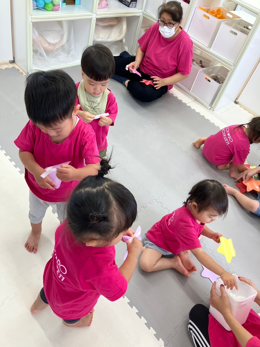 保育園にお星様が遊びにきていると知り、みんなで元気よく探し始めました。かくれんぼの上手なお星様でしたが、それ以上に探すのが上手な子どもたちは、「みつけたよ!」「こっちもあった!」とたくさんのお星様を見つけることができました。