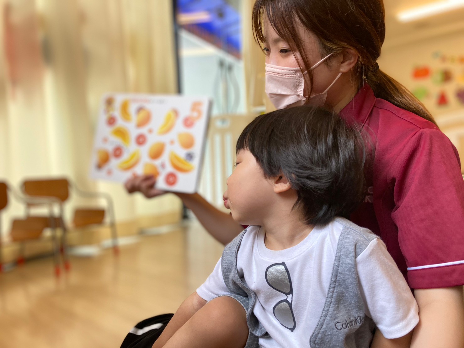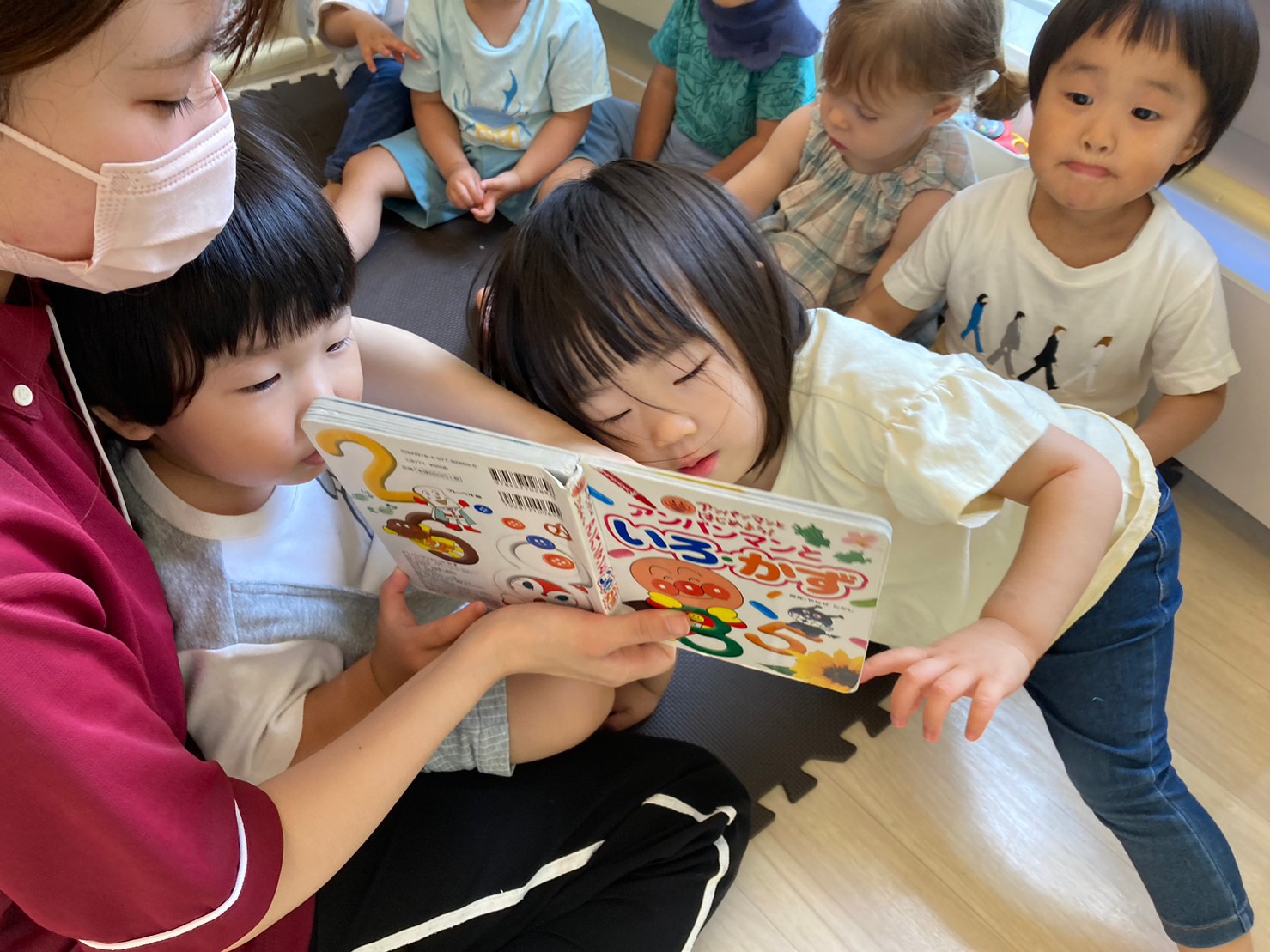 好きな絵本を手にとり、保育者から読んでもらうと、皆嬉しそうです。