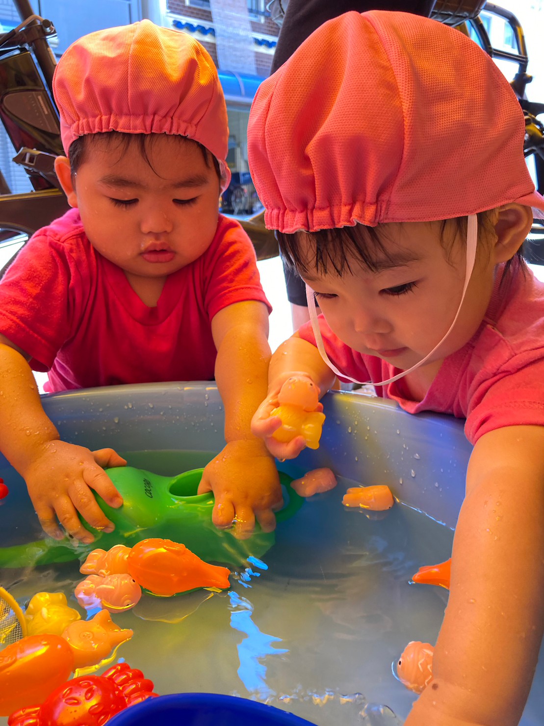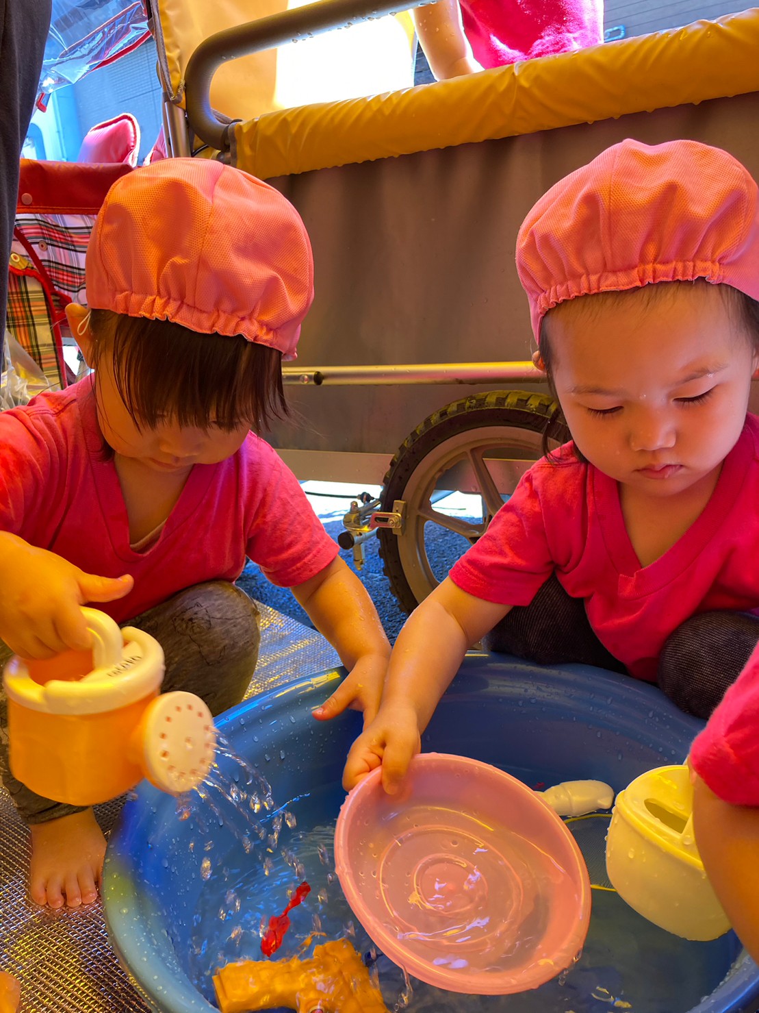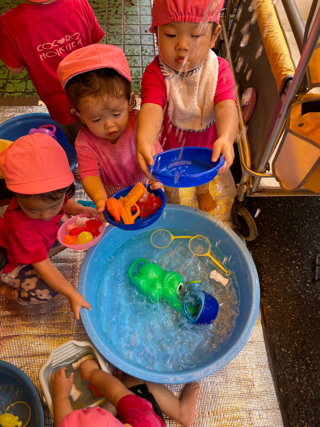 友だちや保育者と水のかけ合いをしたり、魚をたくさんすくって見せてくれたり、お店屋さんになりきったり、夏の遊びを楽しんでいます。