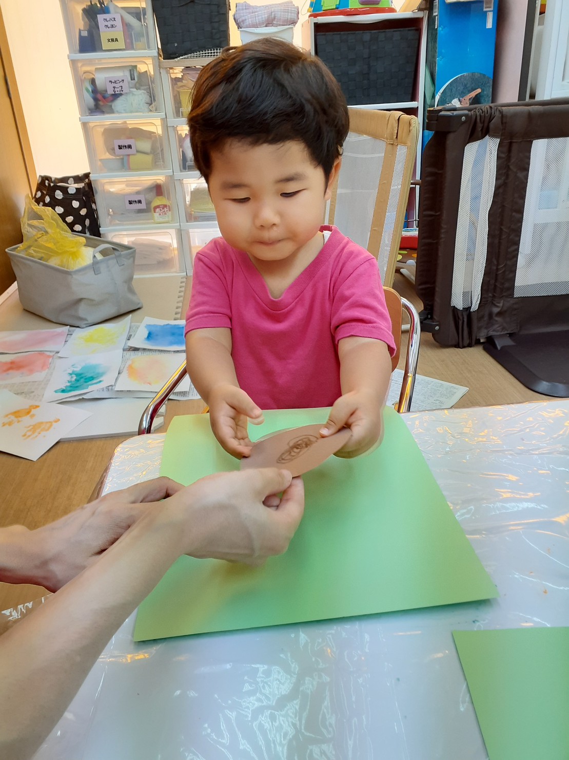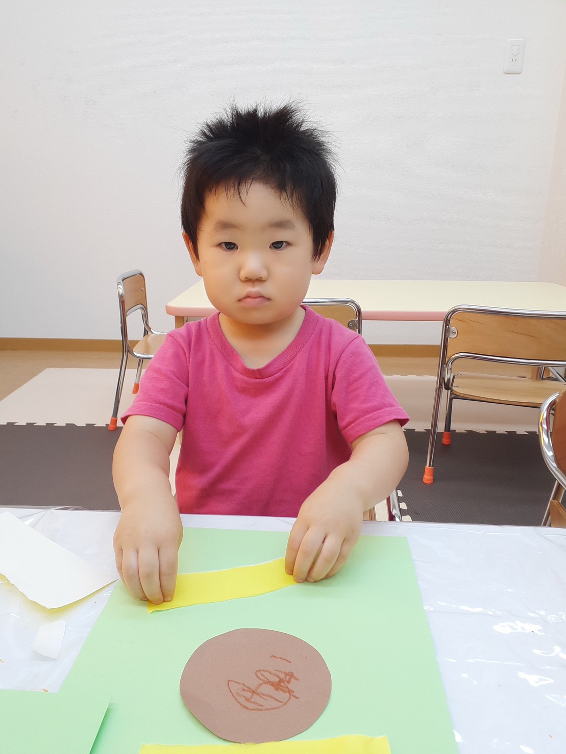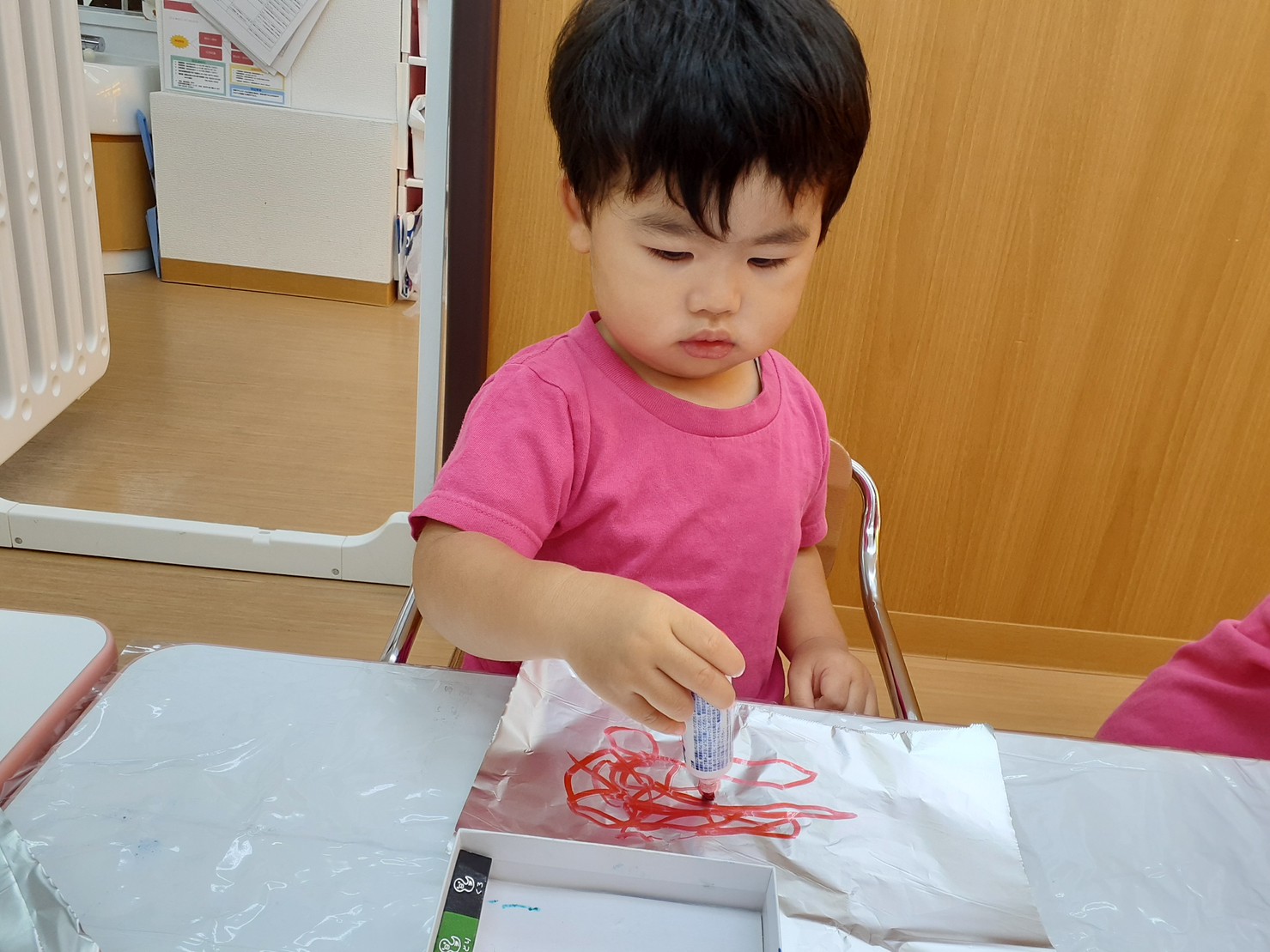 「ぺったん」「かきかき」「びりじり」など、保育者と一緒に言葉にしながら真剣な表情で取り組んでいました。