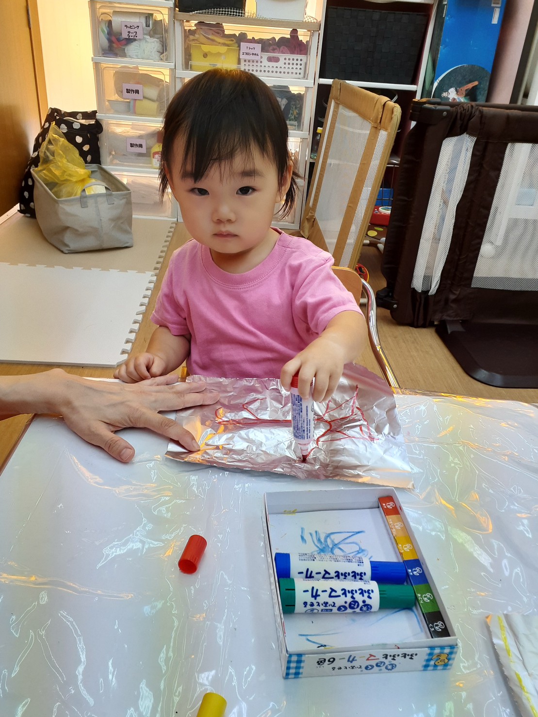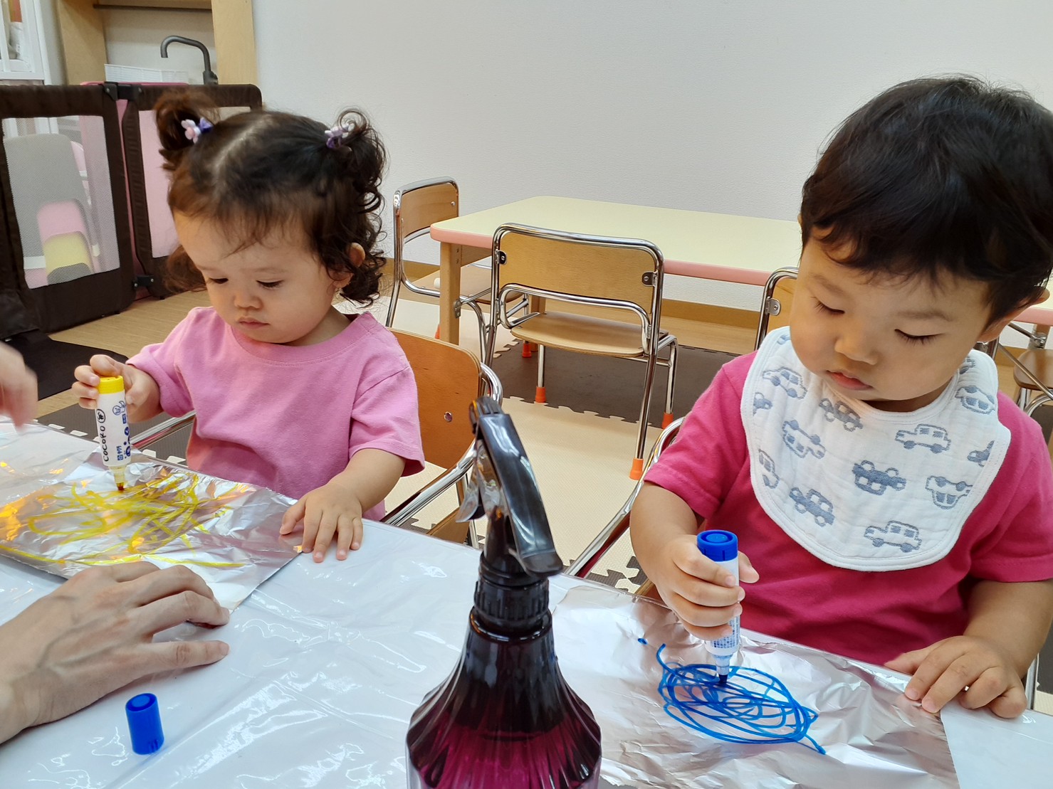 0歳児は手形で金魚、1歳児はアルミホイルとペンを使ったはじき絵で朝顔、2歳児は折り紙をちぎったちぎり絵でひまわりを作りました。
