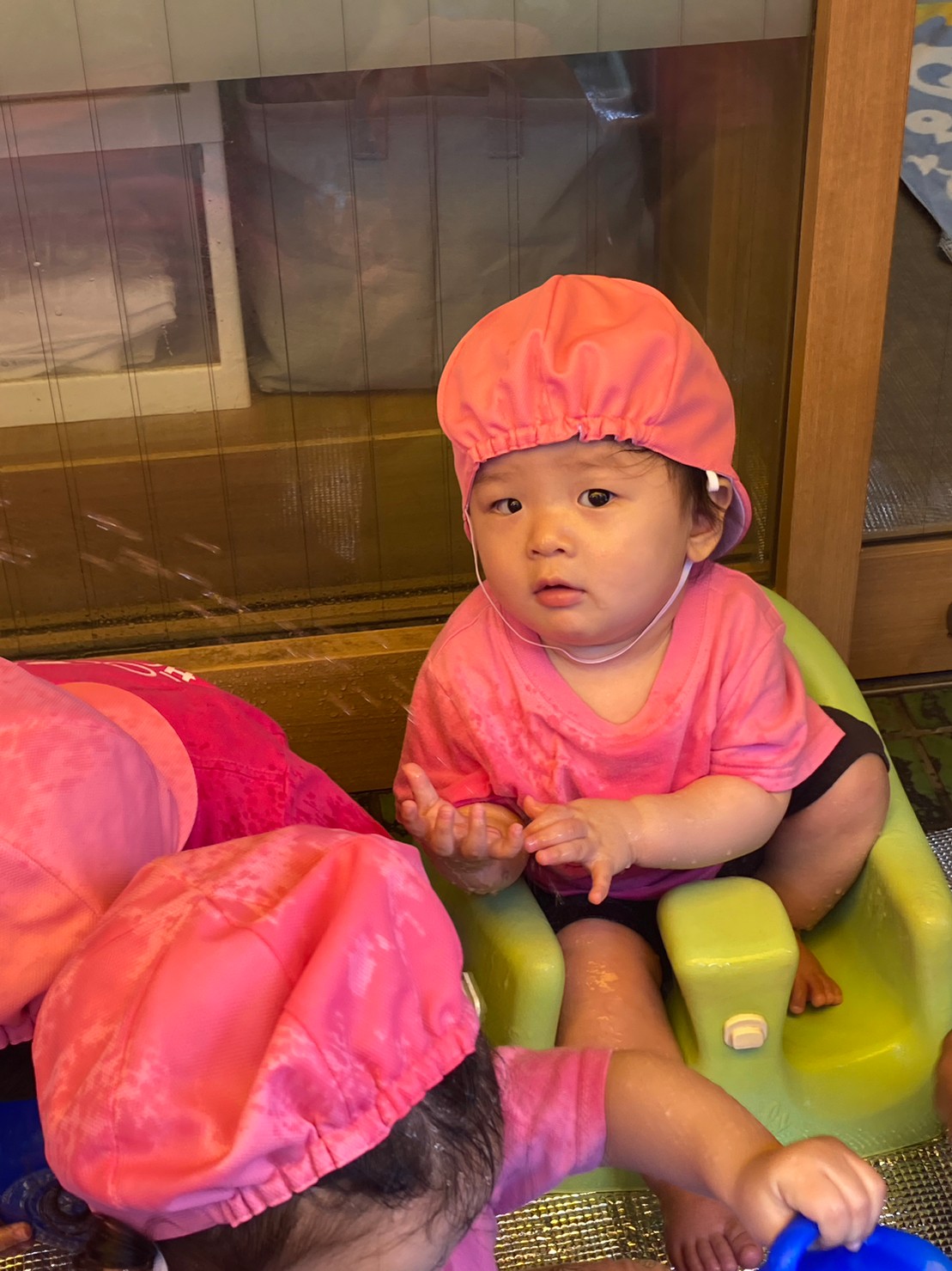 初めての水遊びの日は、驚いた表情や笑顔、怖いと言う子どもがいましたが、遊んでいくうちに慣れて来て「きもちいいー」「たのしいね」と話し、笑い声も出るようになりました。