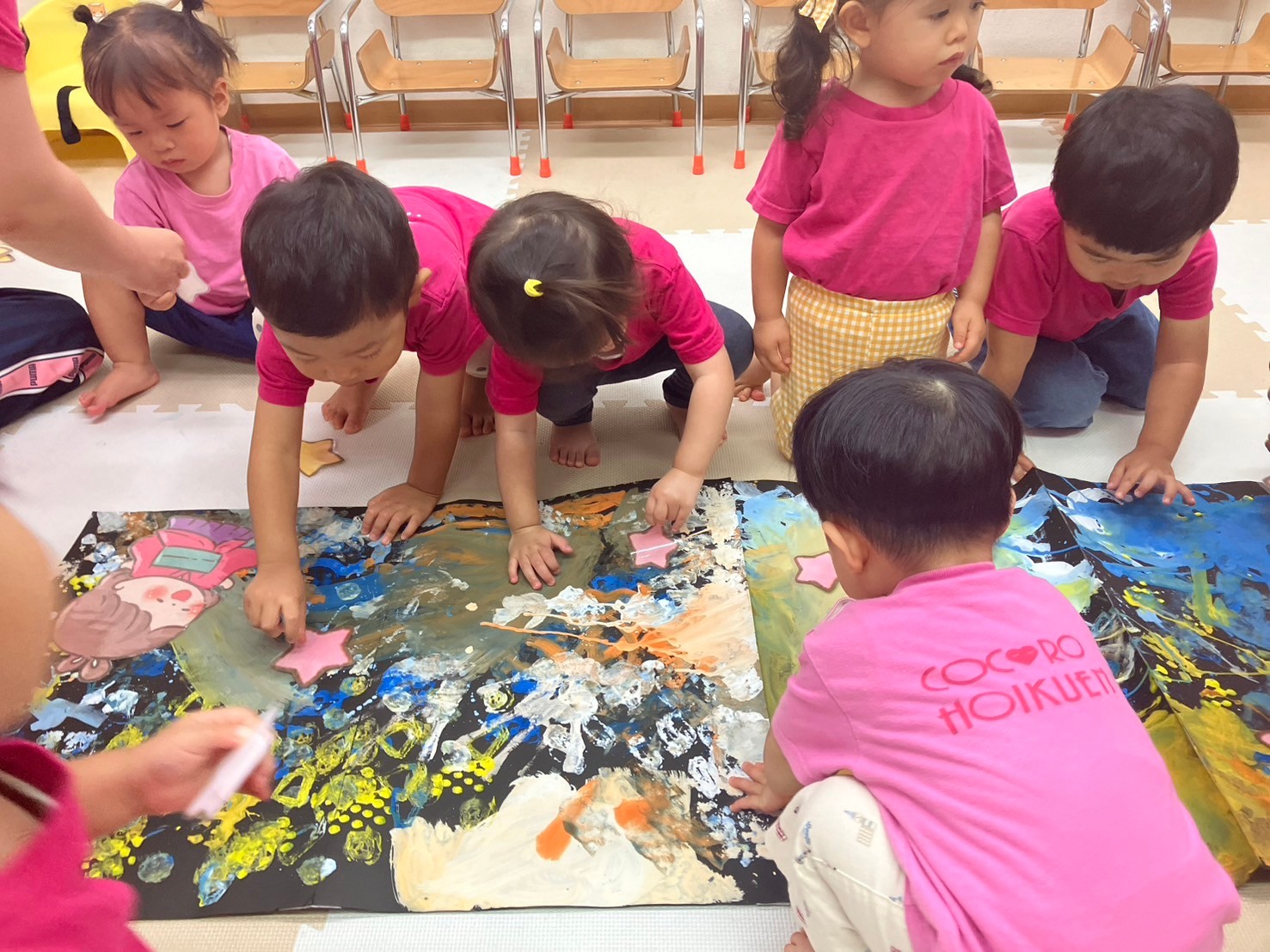 共同制作では、スポンジや筆、ダンボールを使って様々な模様をつけていきました。