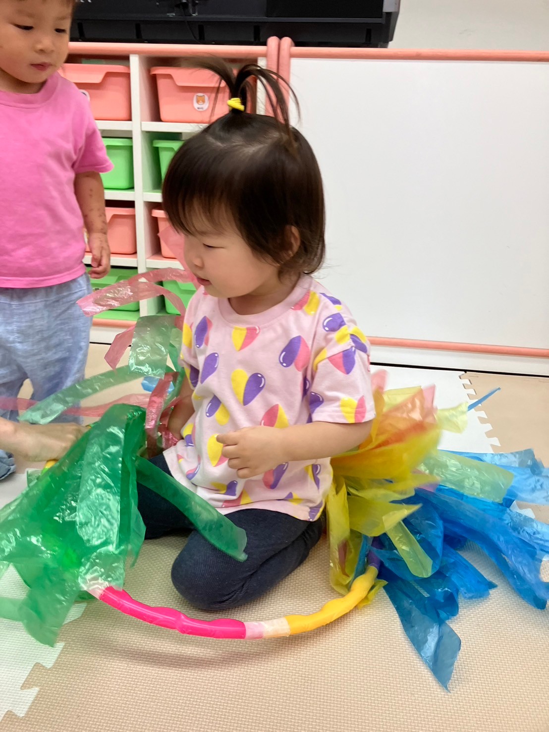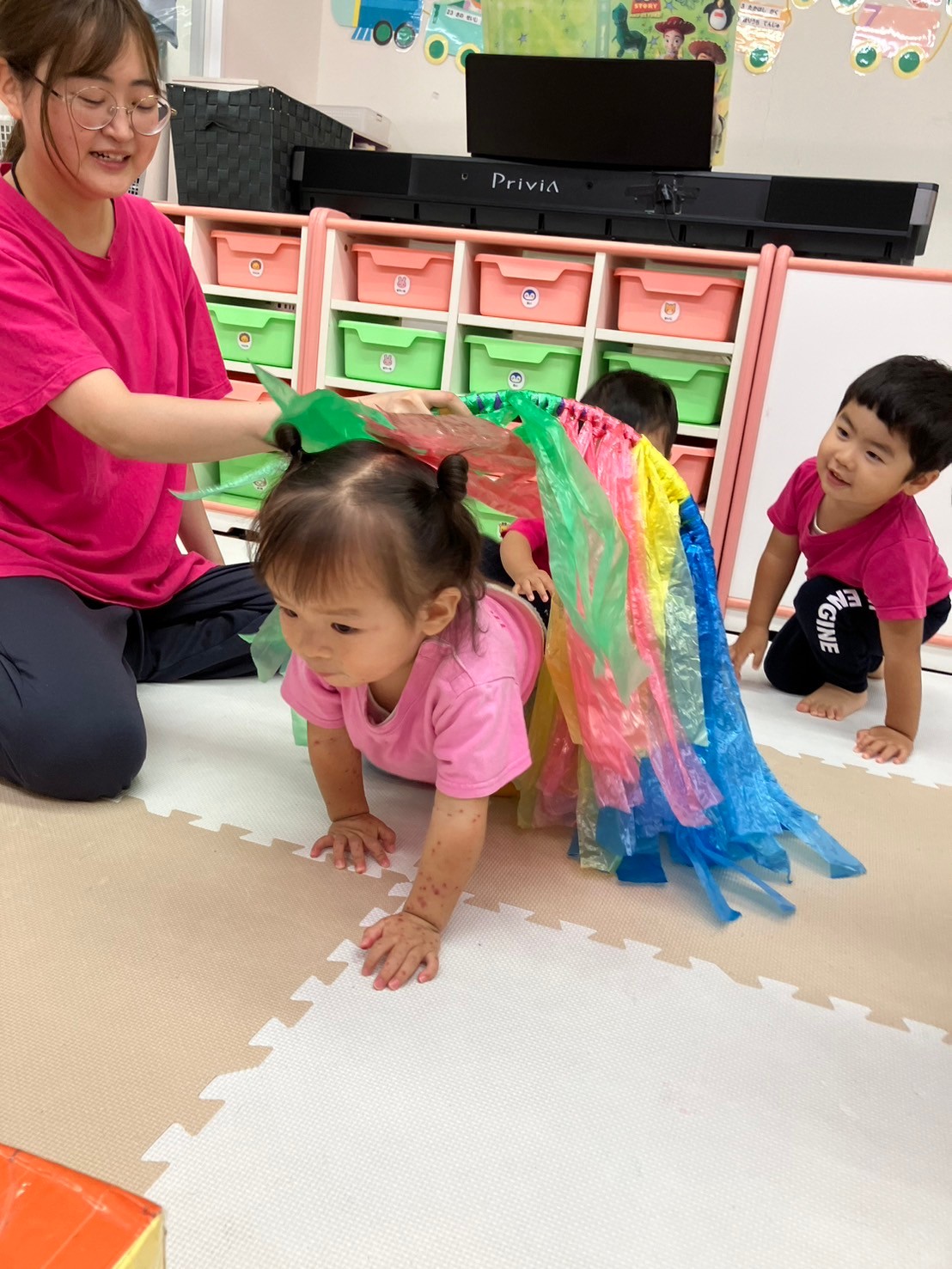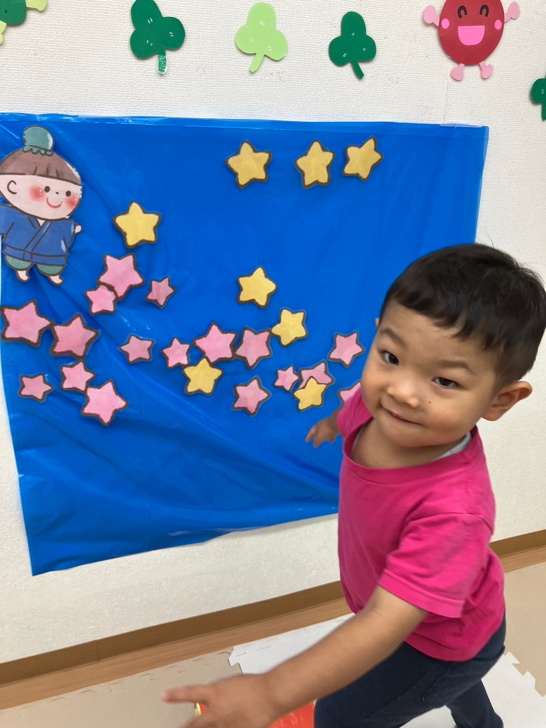 フラフープにスズランテープをつけて天の川に見立てた天の川トンネルを「うわあー!」と言いながらハイハイで上手に潜り抜けて体を動かしていた子ども達。