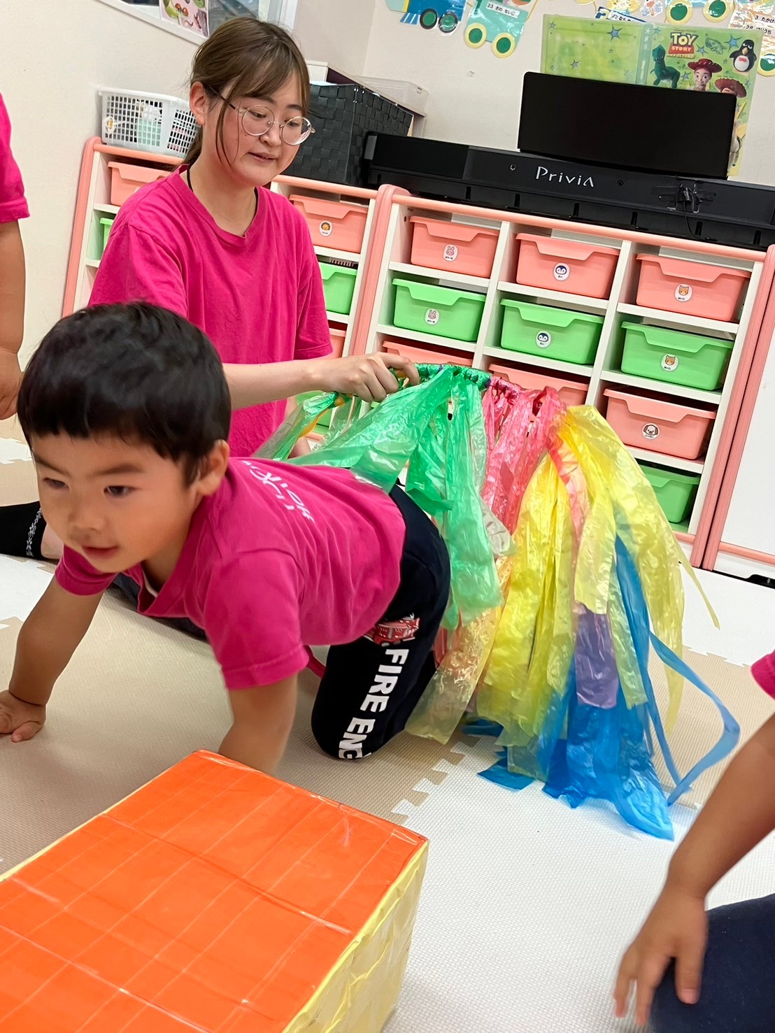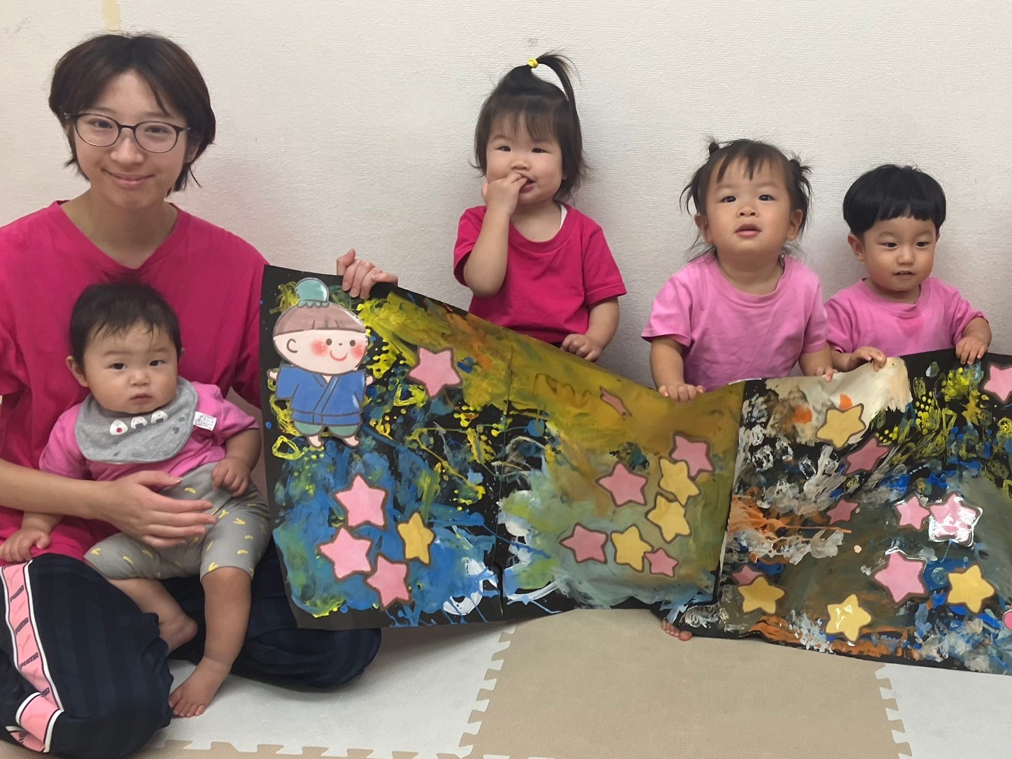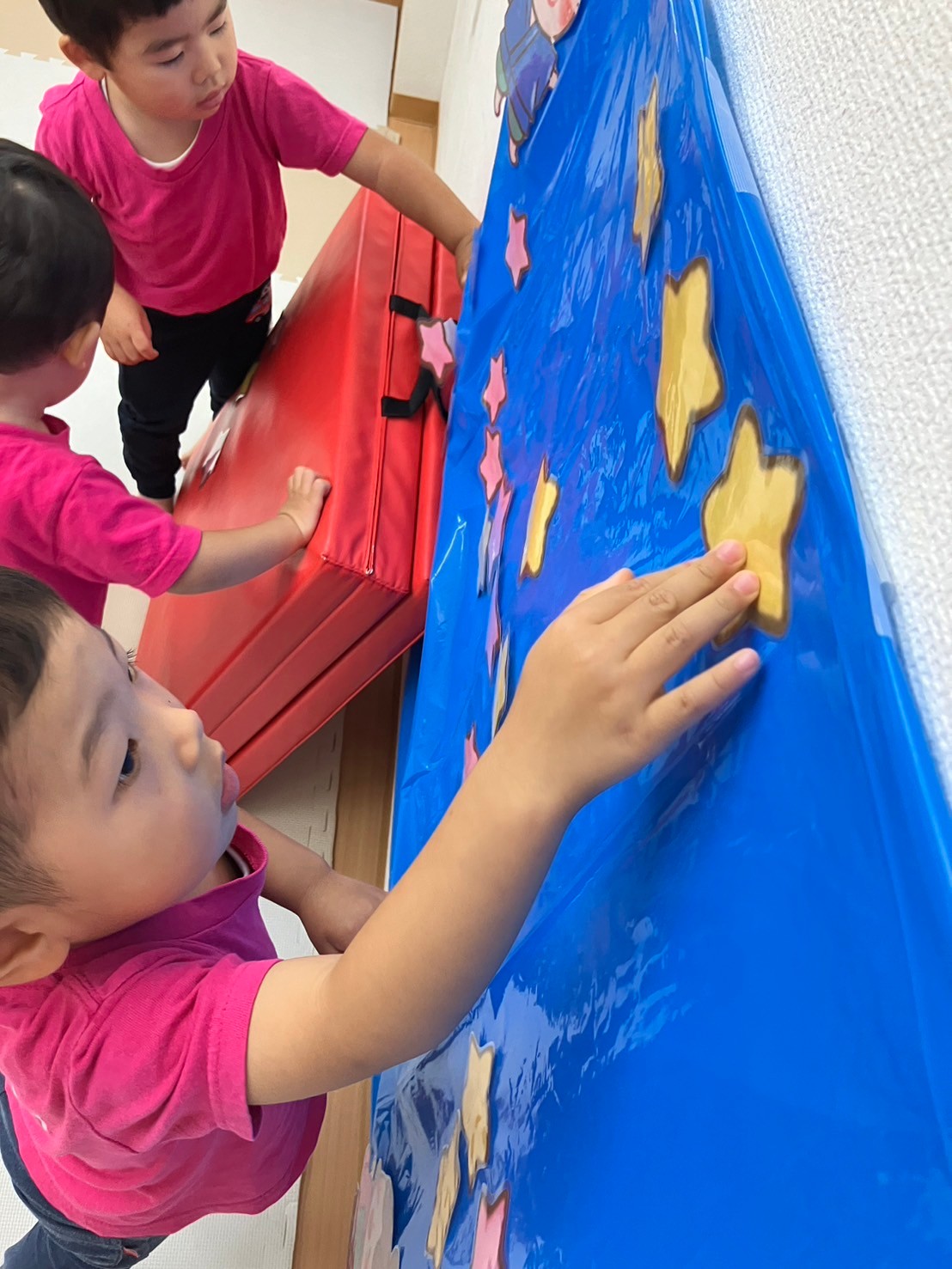 フラフープにスズランテープをつけて天の川に見立てた天の川トンネルを「うわあー!」と言いながらハイハイで上手に潜り抜けて体を動かしていた子ども達。