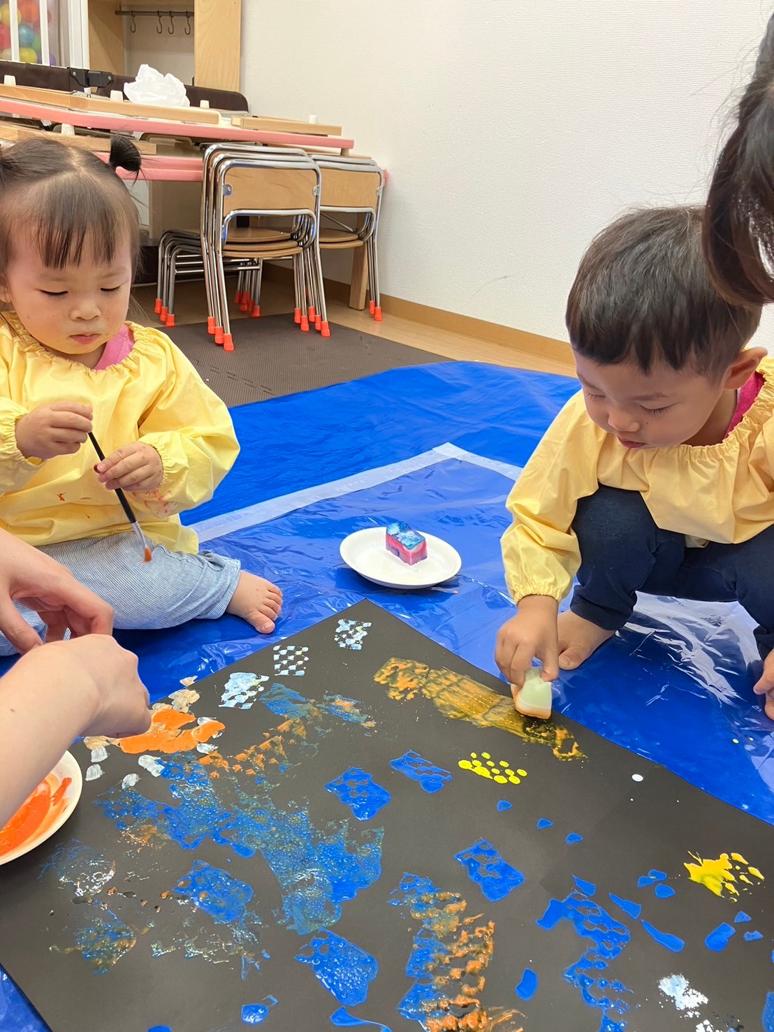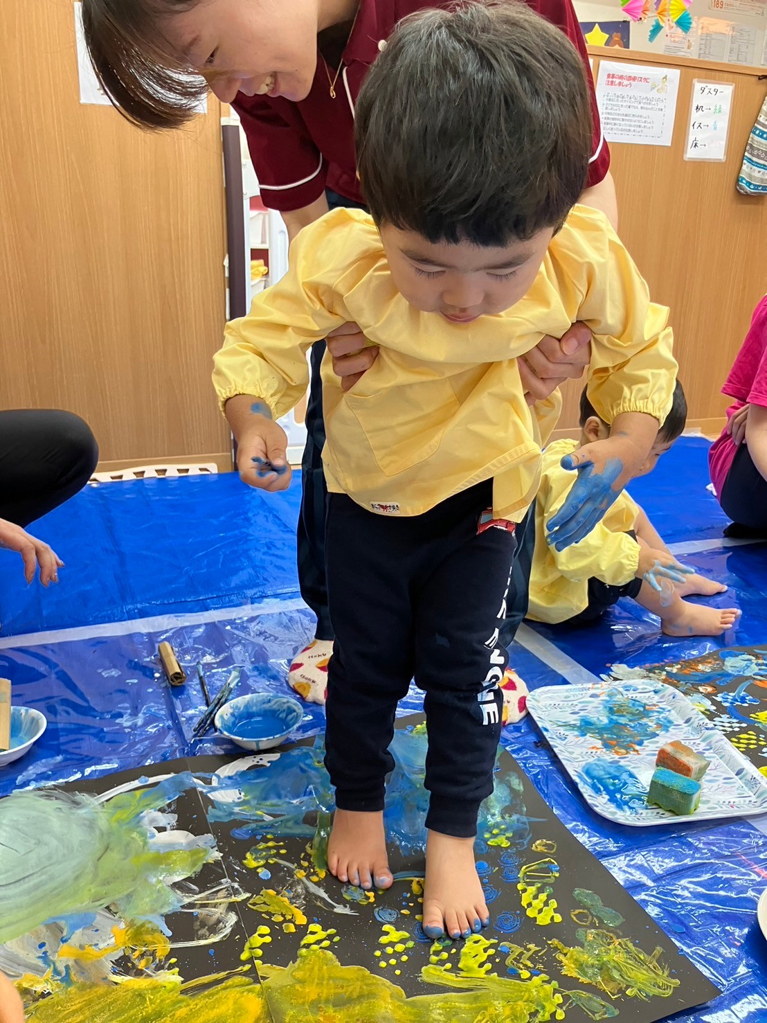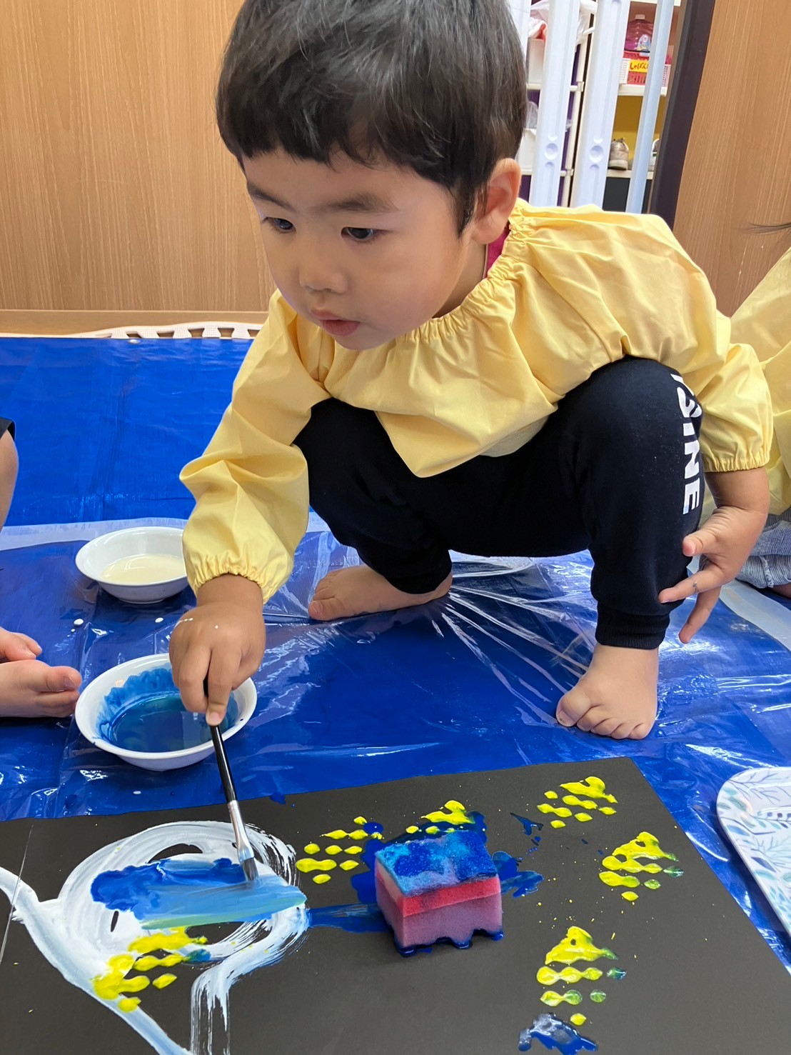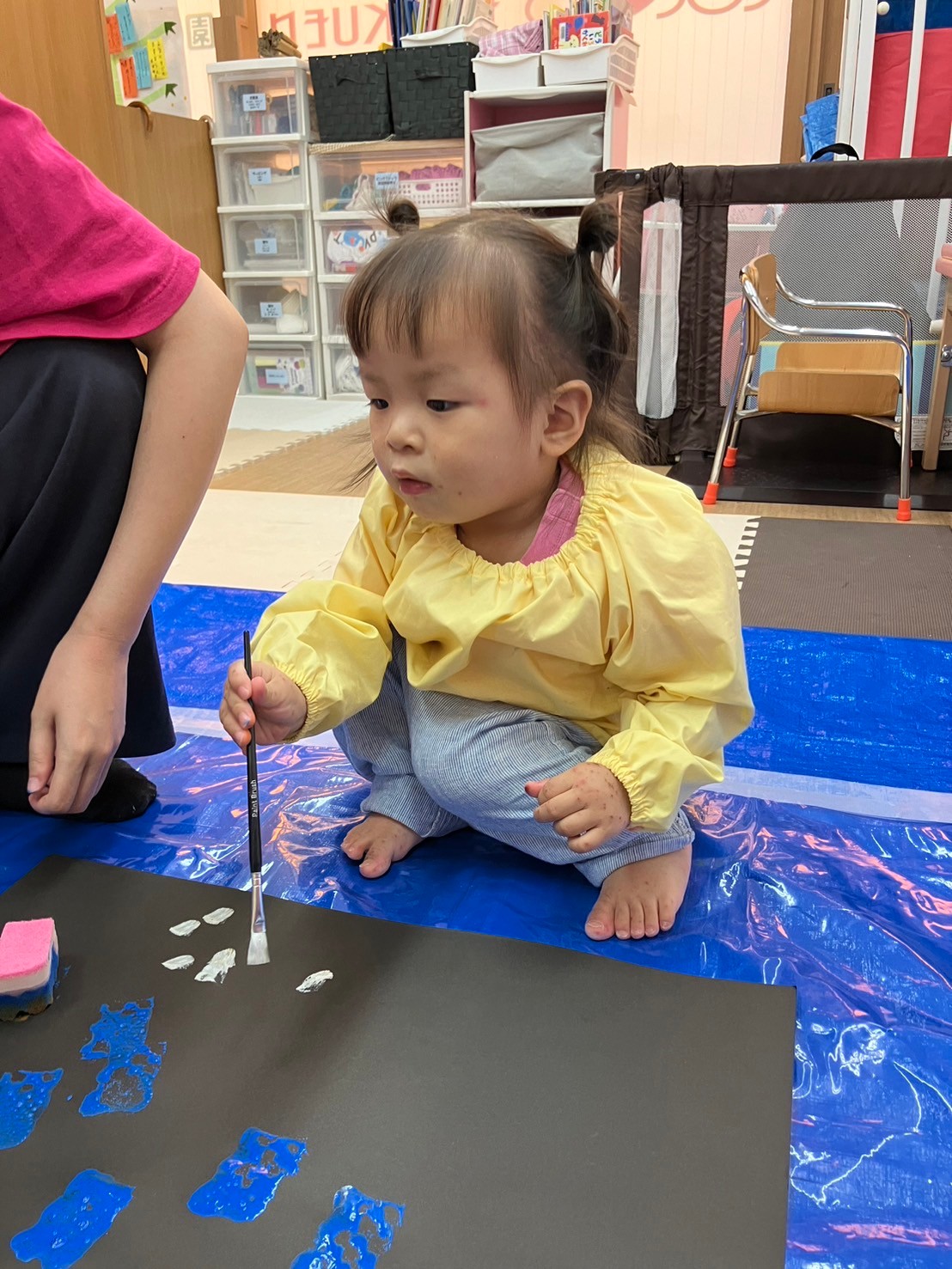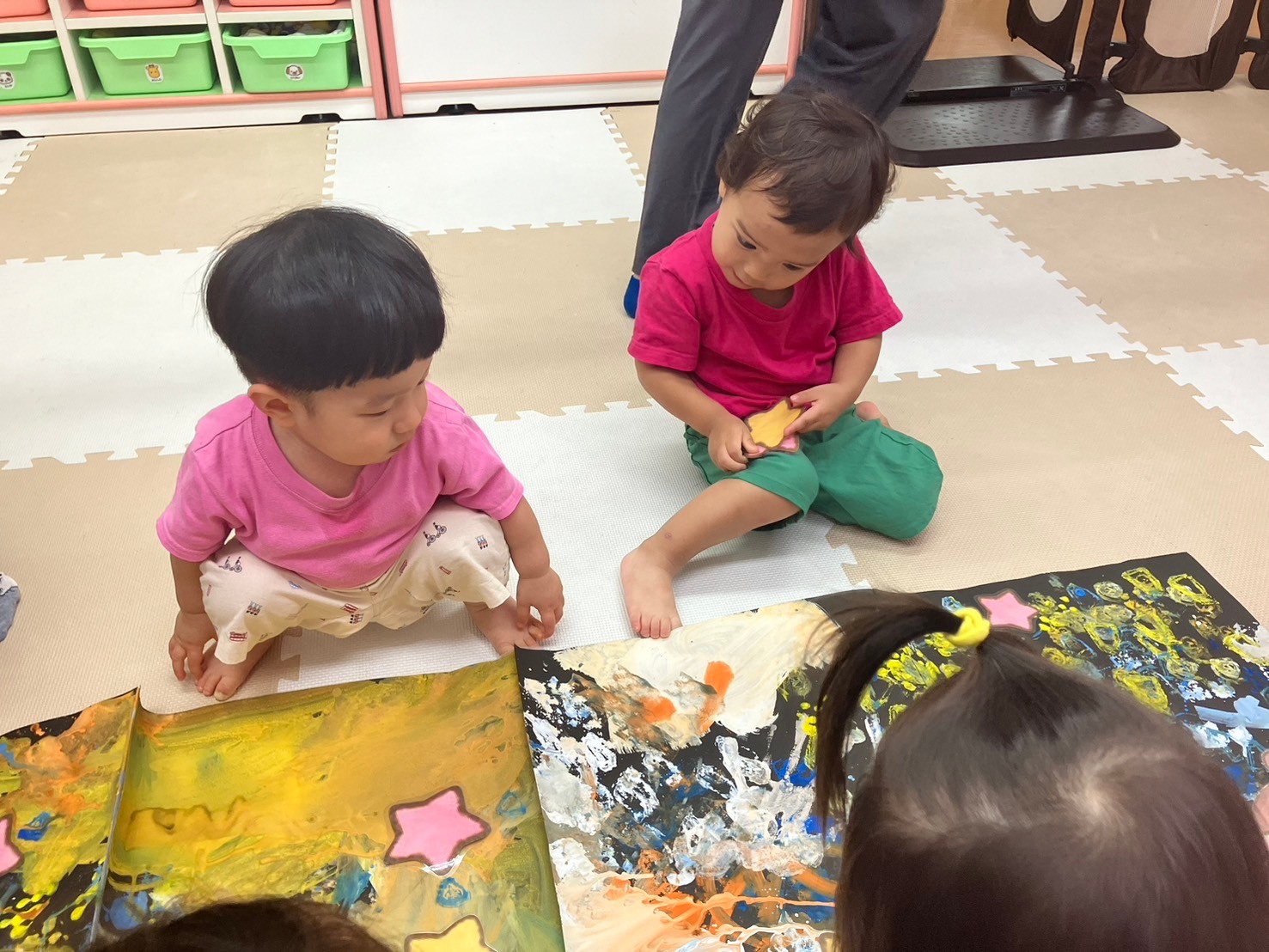 スポンジの柔らかい感触を握って確かめたり、ダンボールスタンプでは模様ができると目を大きく開けて驚いていた表情も見られました。