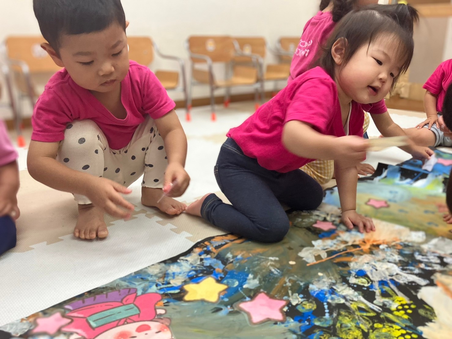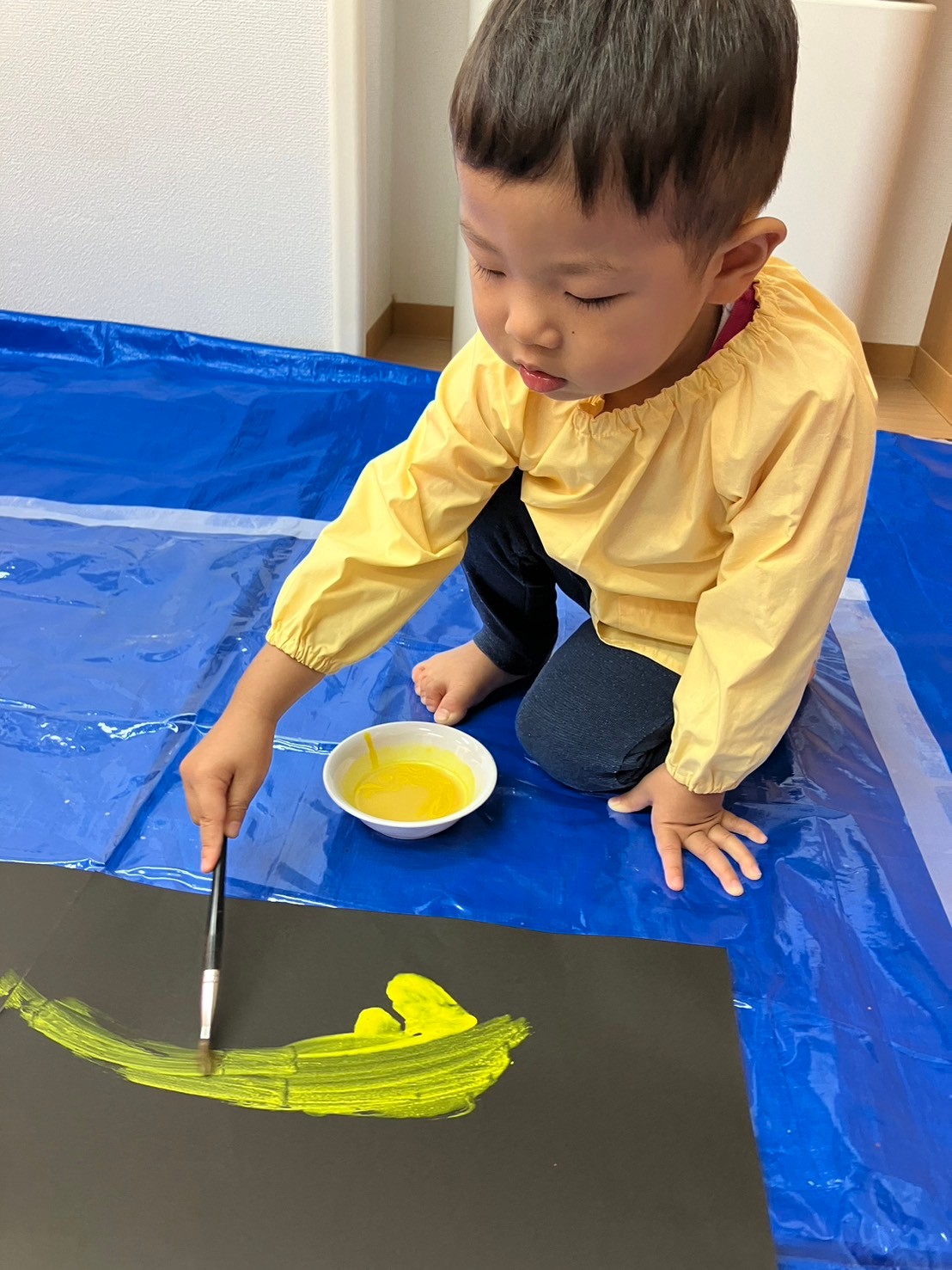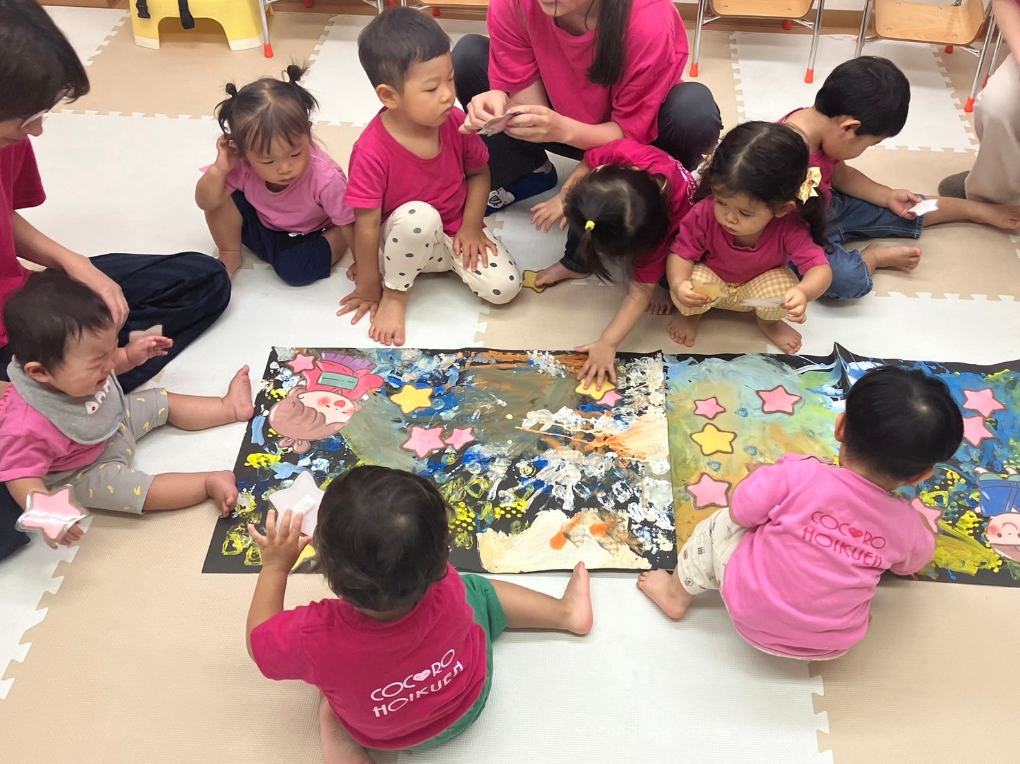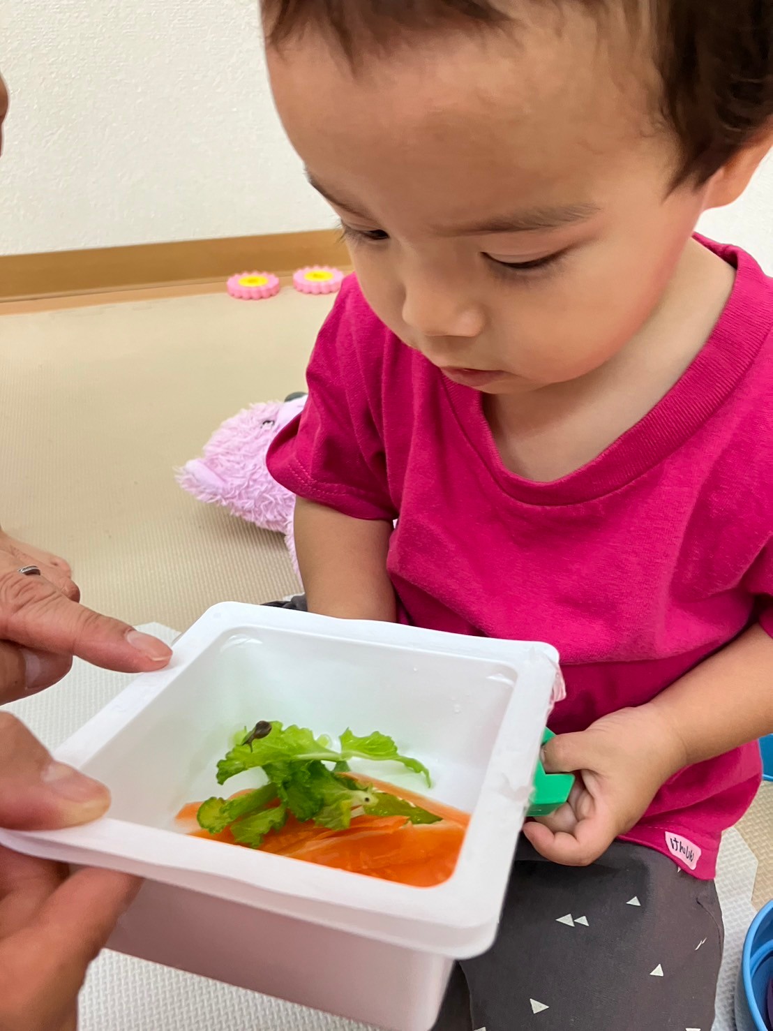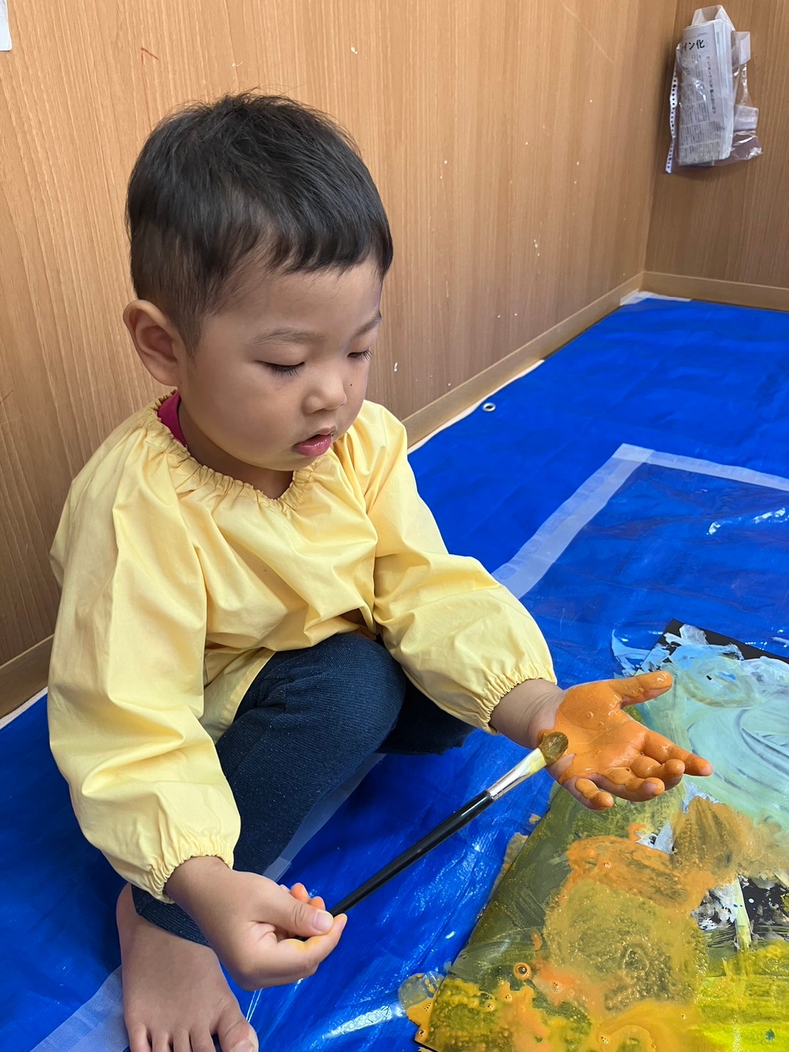 スポンジの柔らかい感触を握って確かめたり、ダンボールスタンプでは模様ができると目を大きく開けて驚いていた表情も見られました。