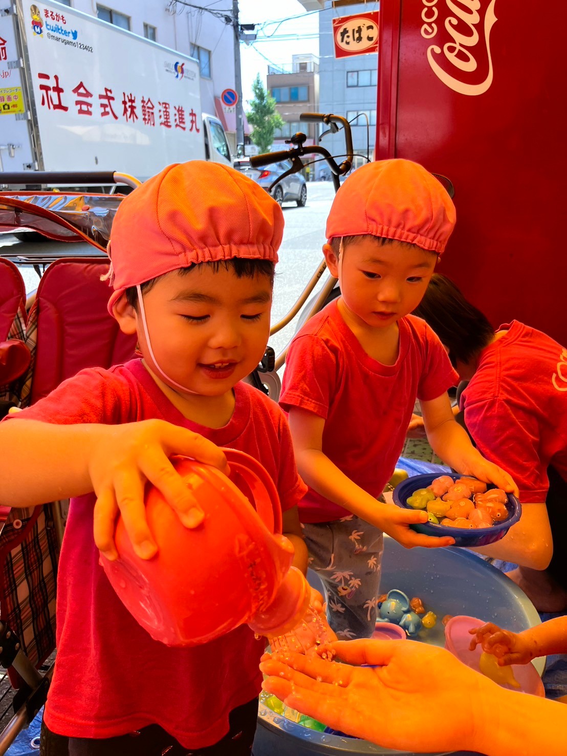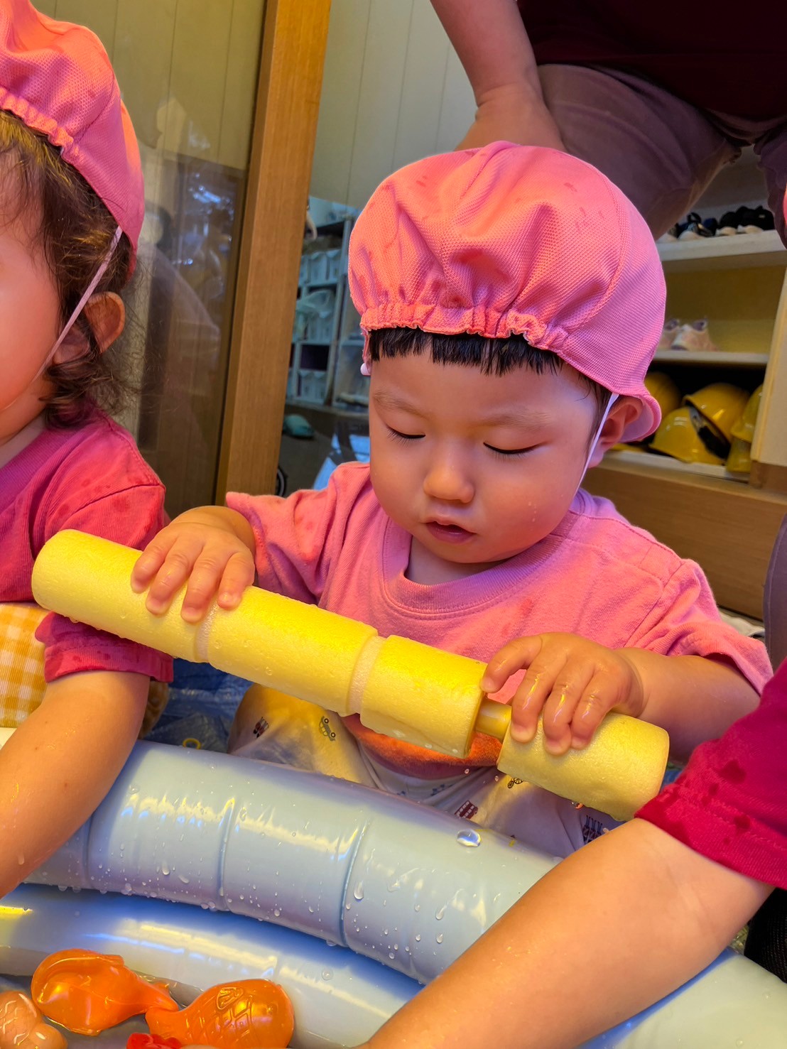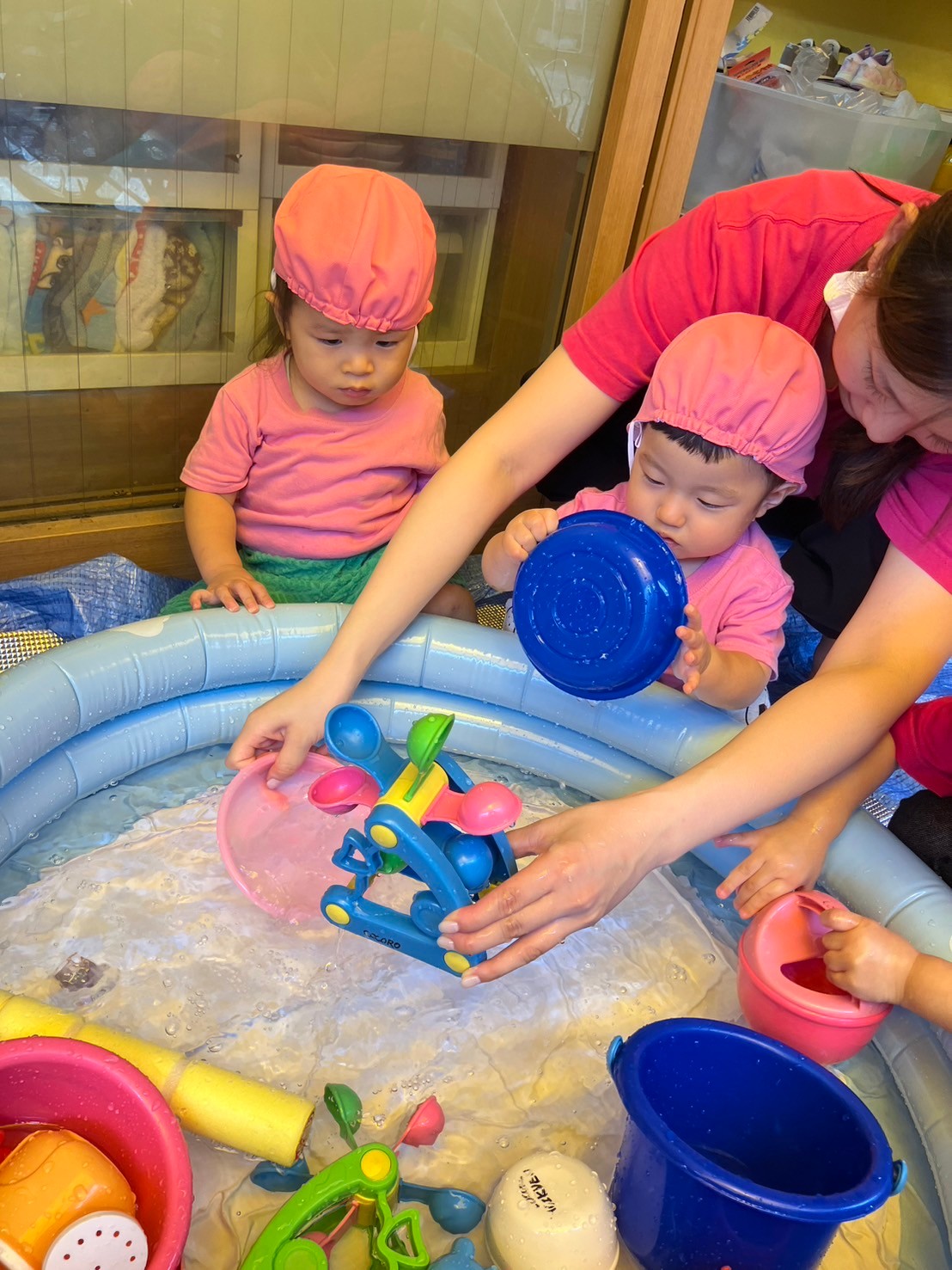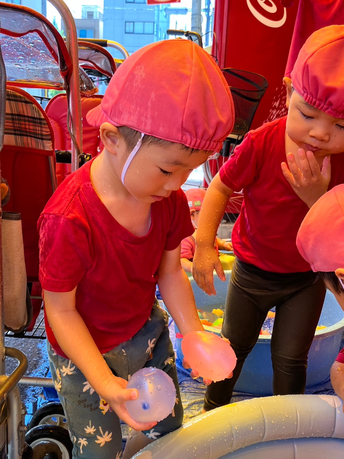 できた水風船を握って潰したり、潰れてびっくりしている表情がとっても可愛い子ども達です。