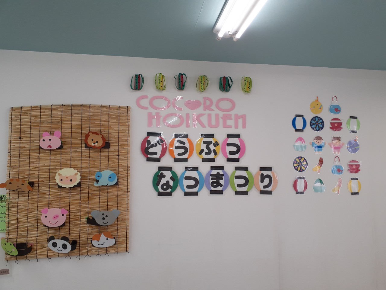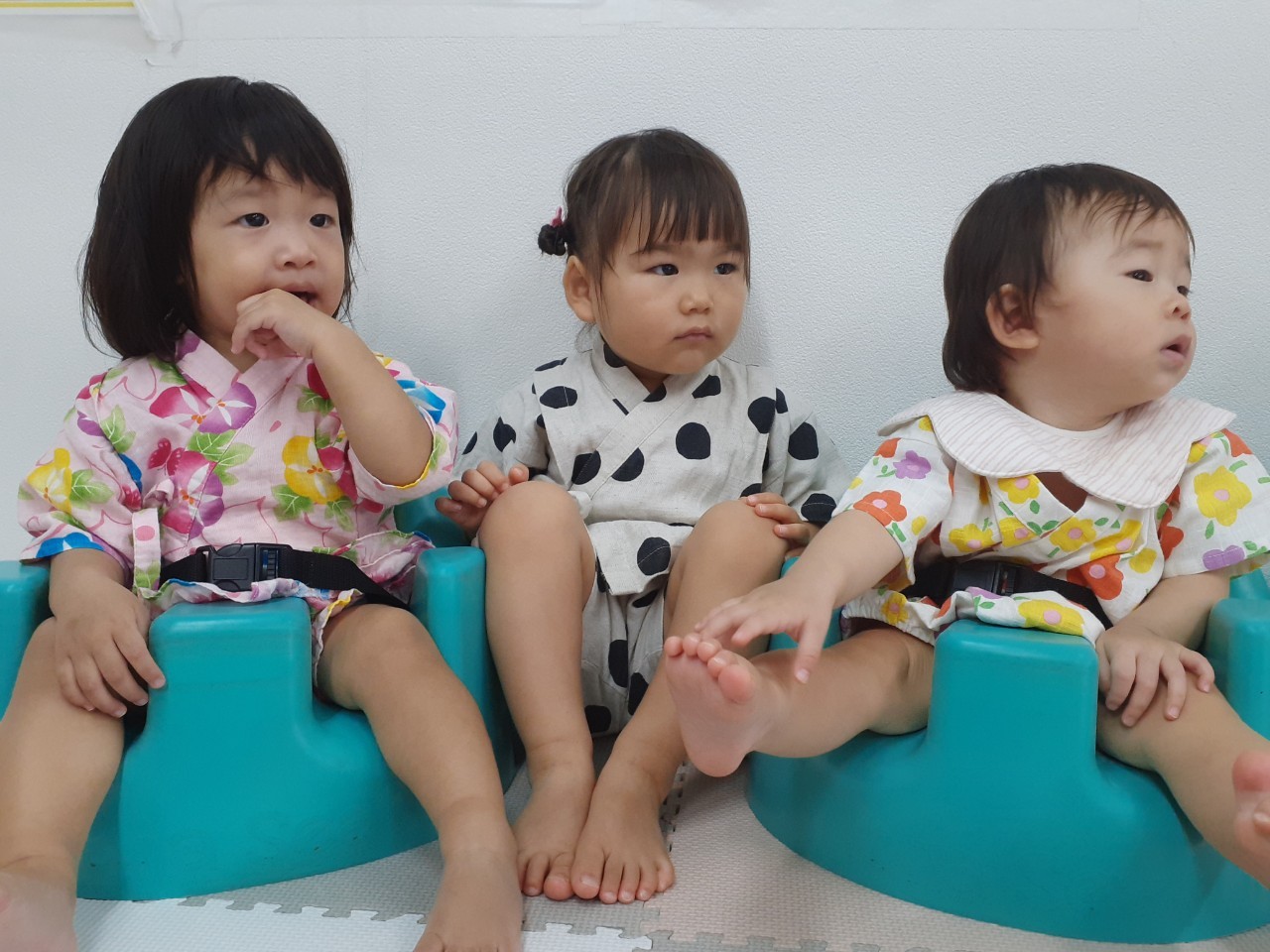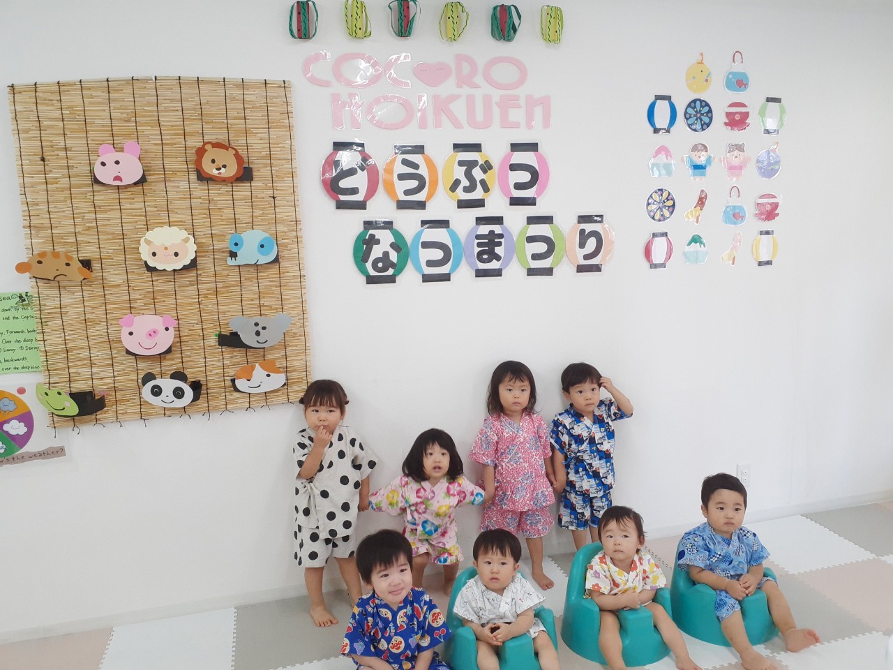みんなで色とりどりの甚平を着て夏祭りに参加しました。