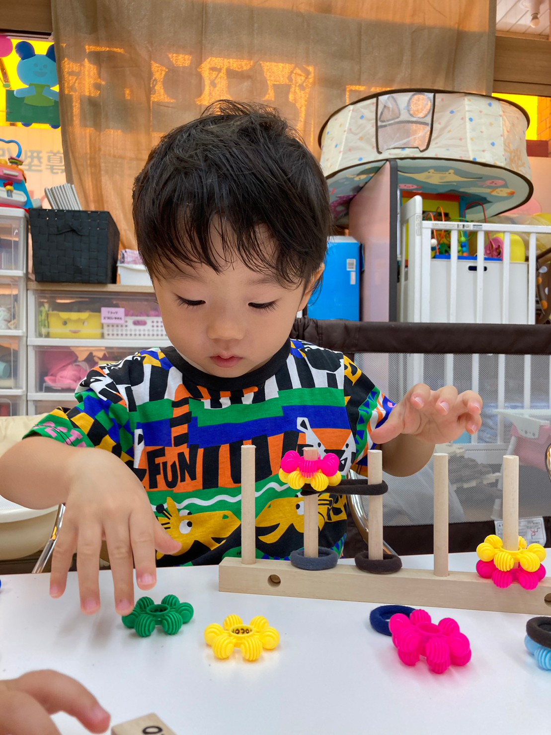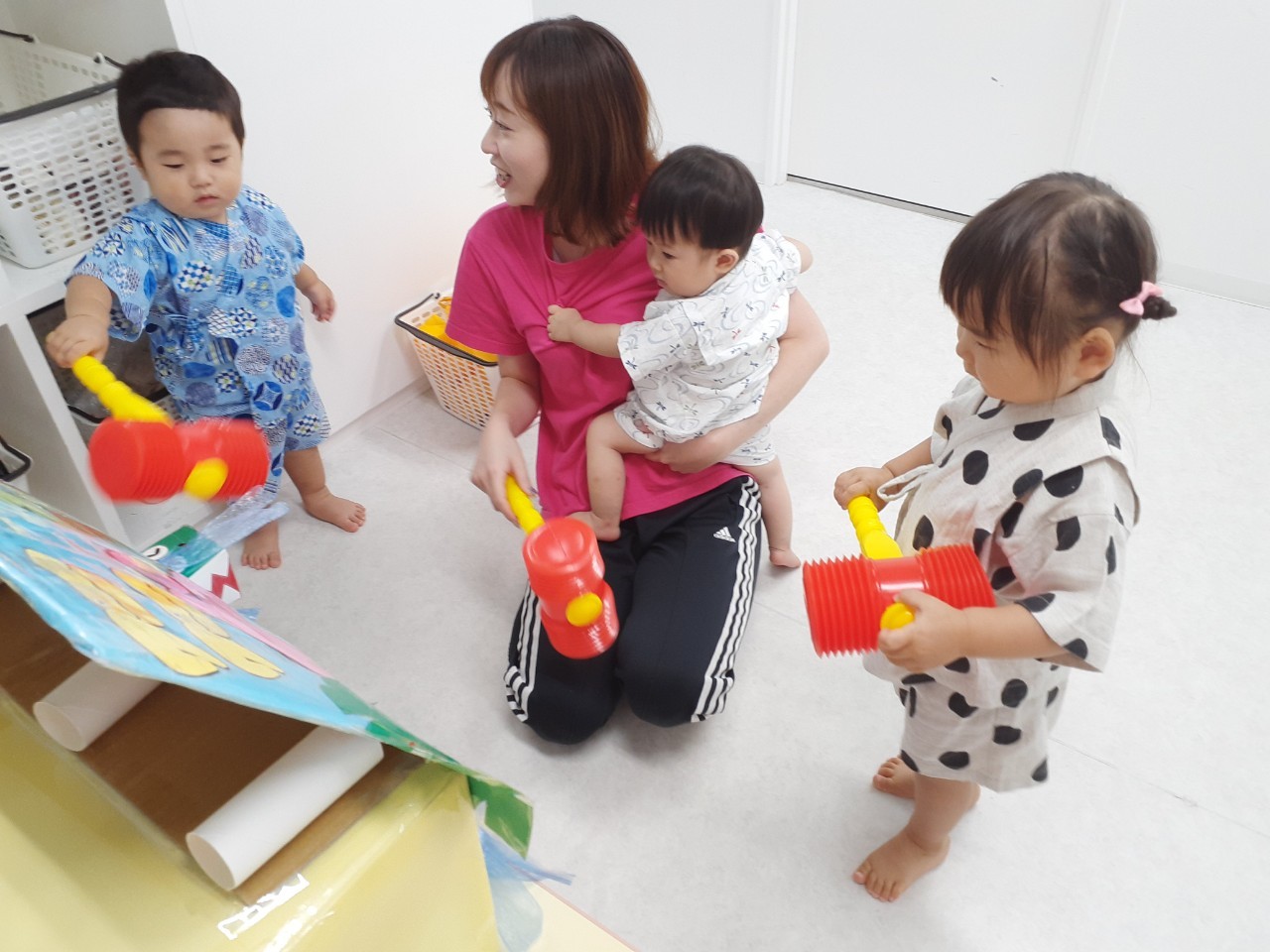 いつもと違う雰囲気の保育園に少し驚きながらも、わにわにパニックや釣竿を使った動物釣り、動物のかごにボール入れ、普段できないあそびを存分に楽しみました。