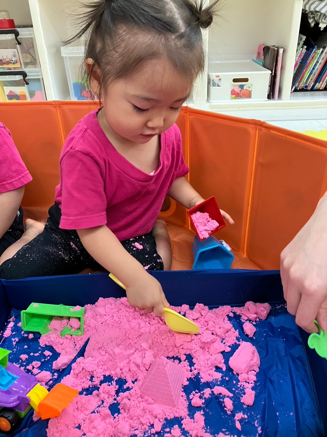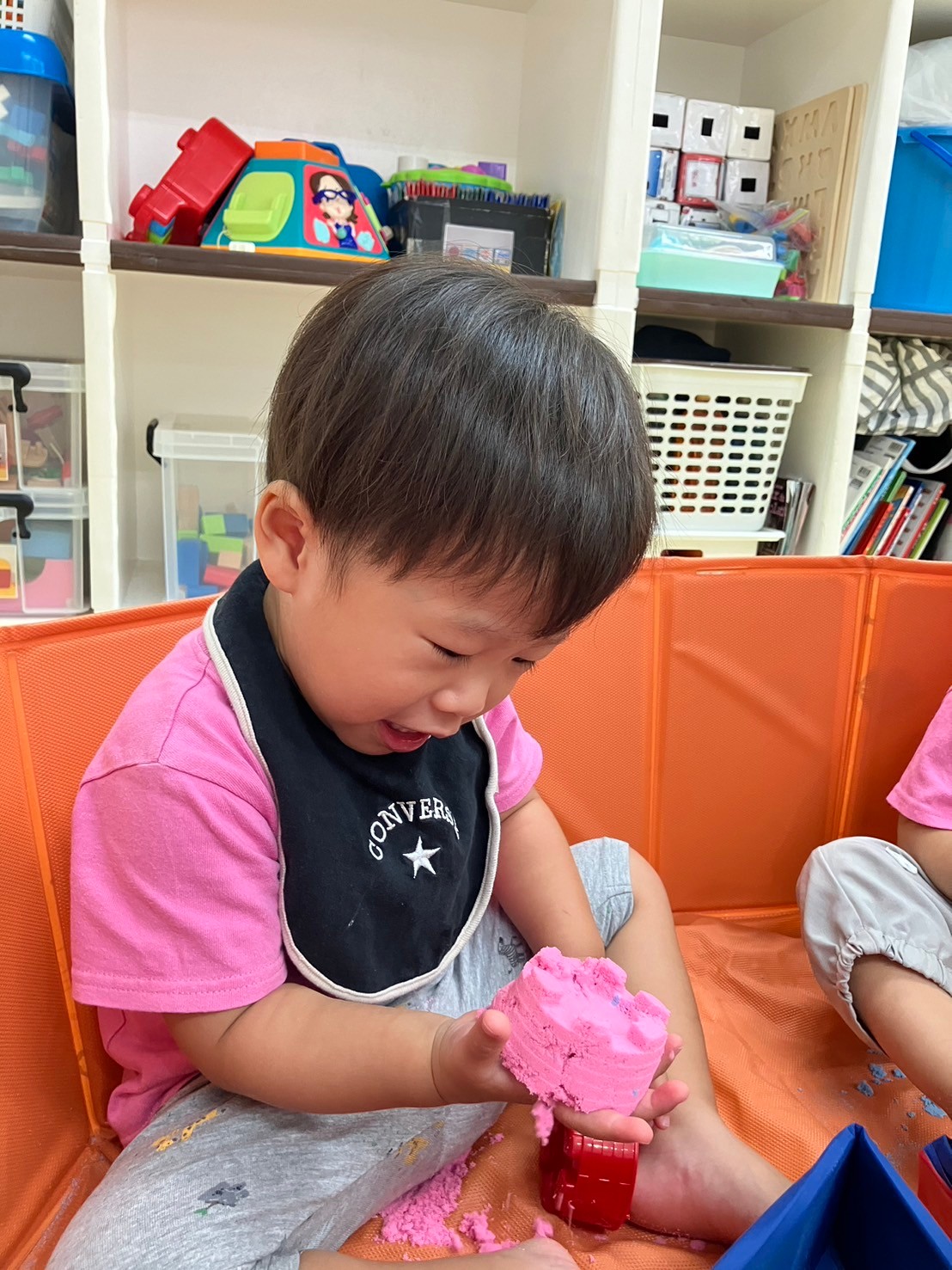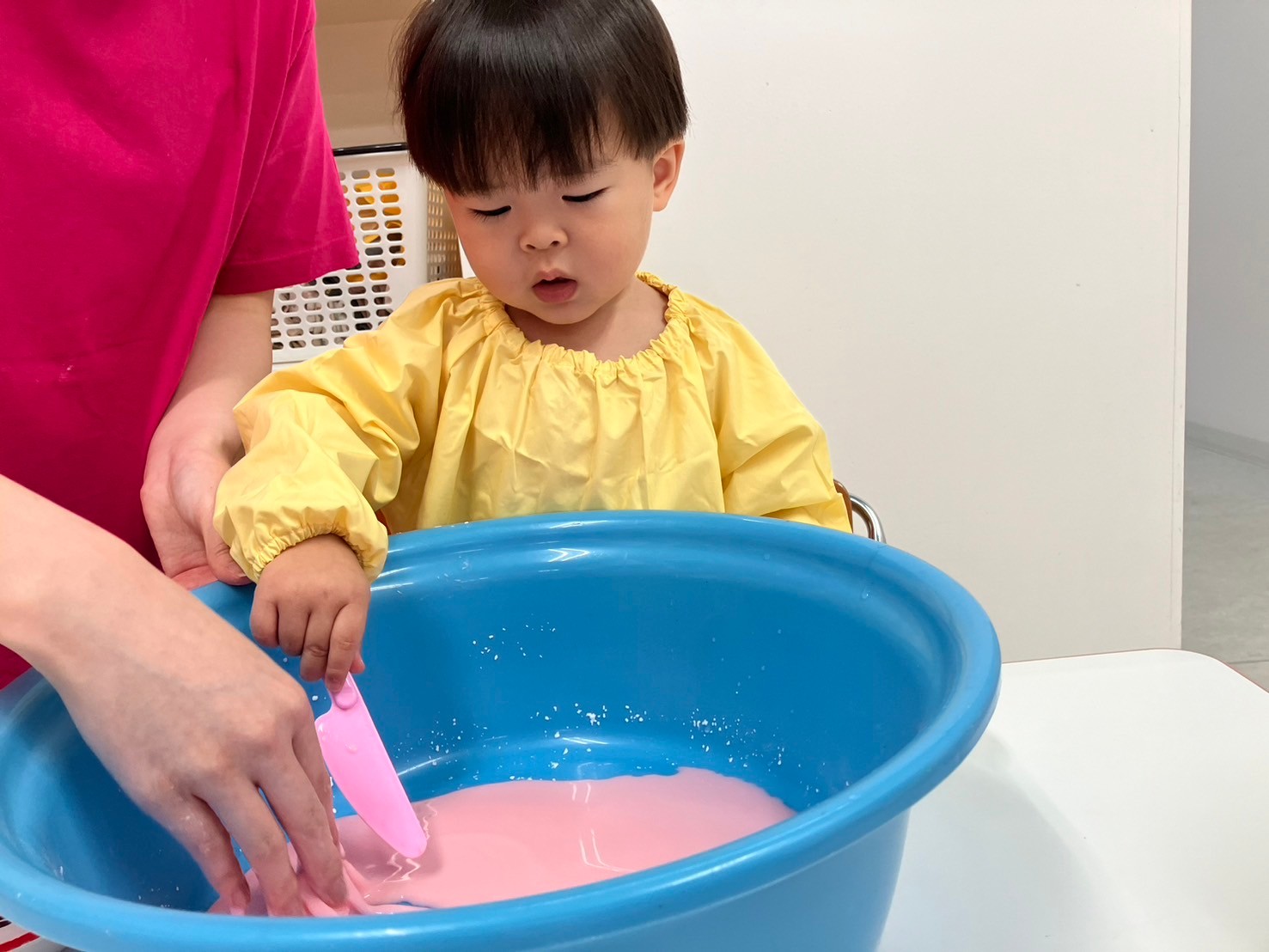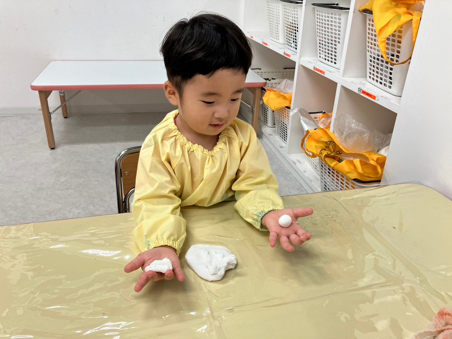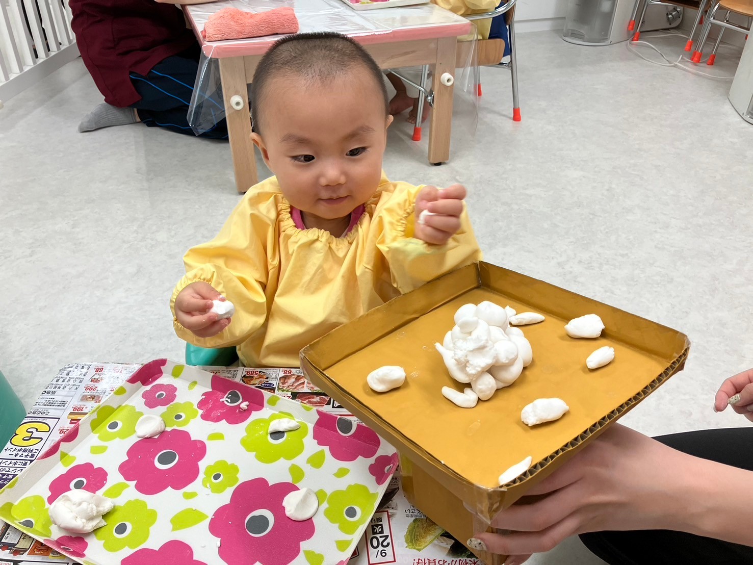 なかなか気温が下がらず戸外あそびができなかったため、砂粘土や片栗粉あそびなど、、