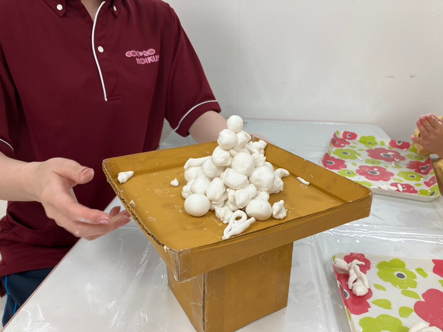 みんなで力をあわせて小麦粉粘土でたくさんのお団子を作りました‼︎