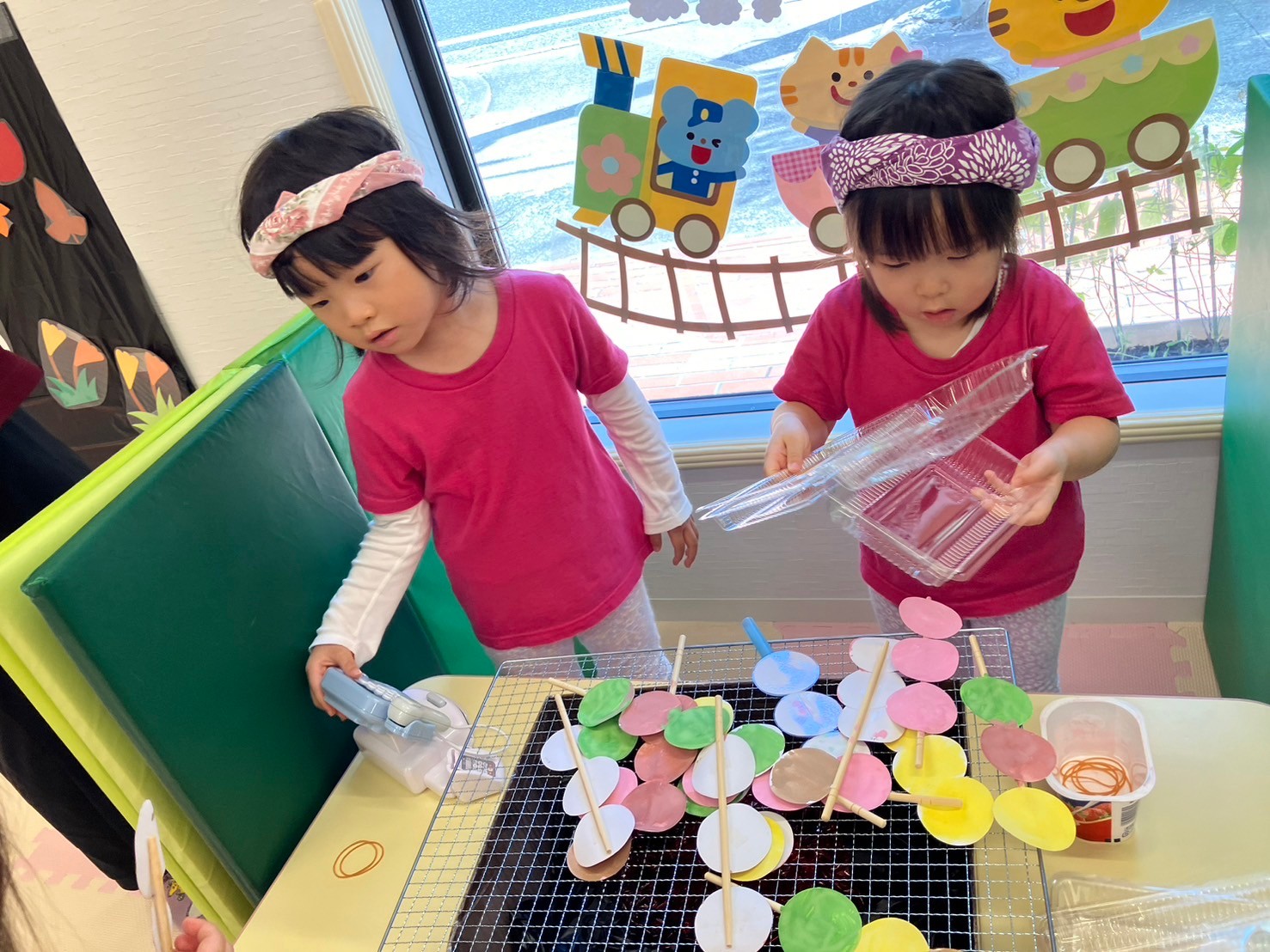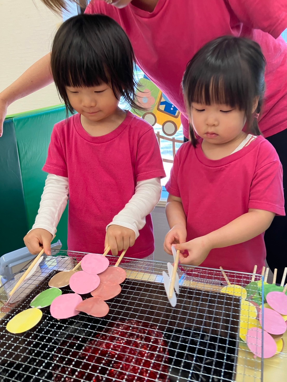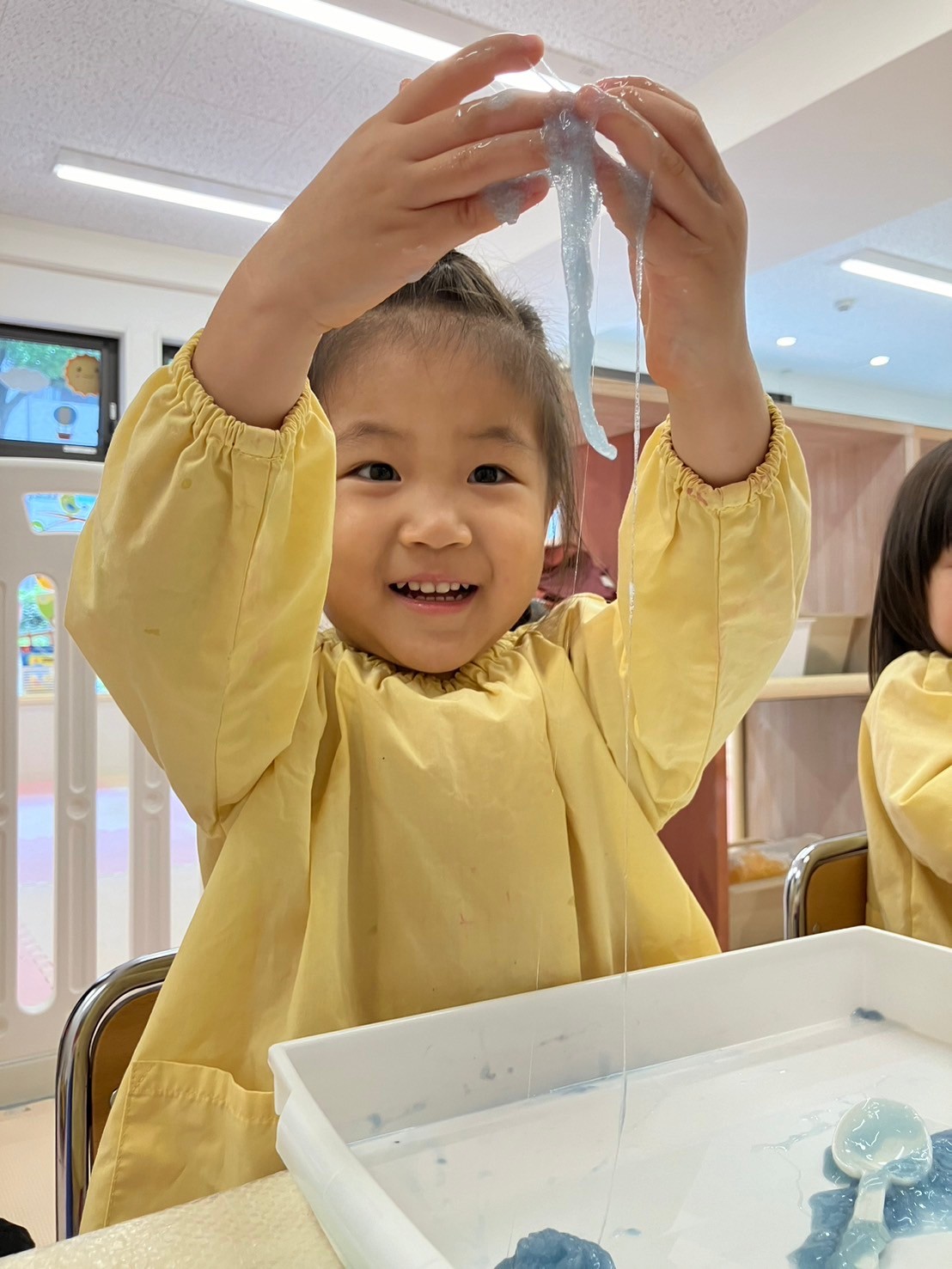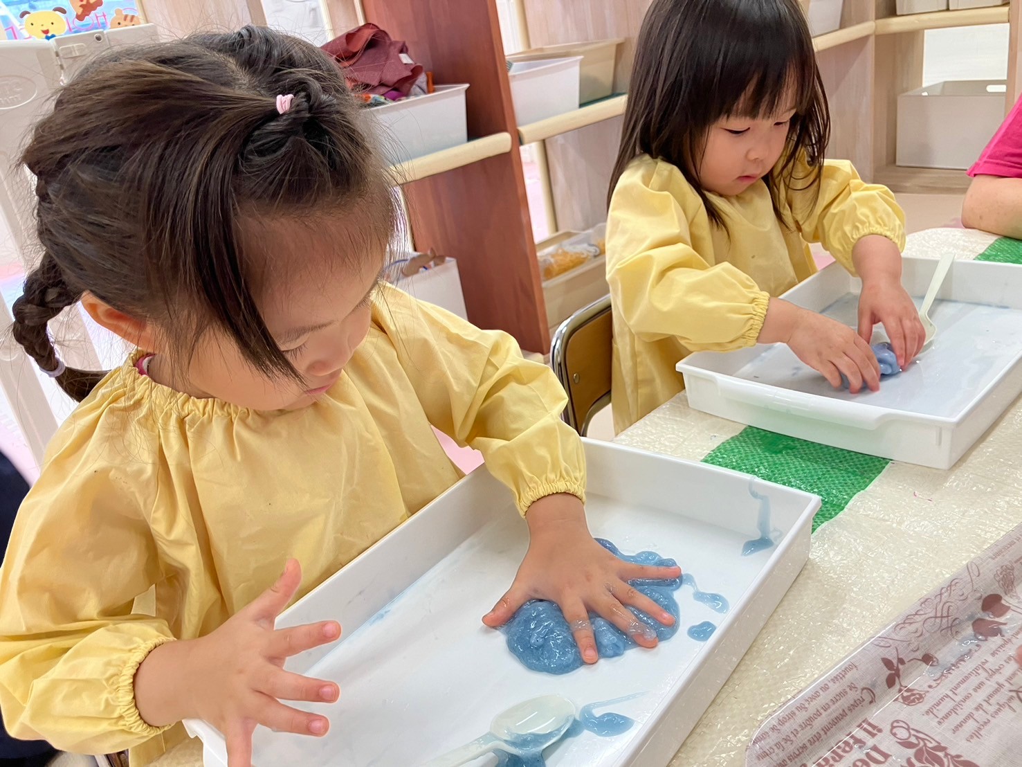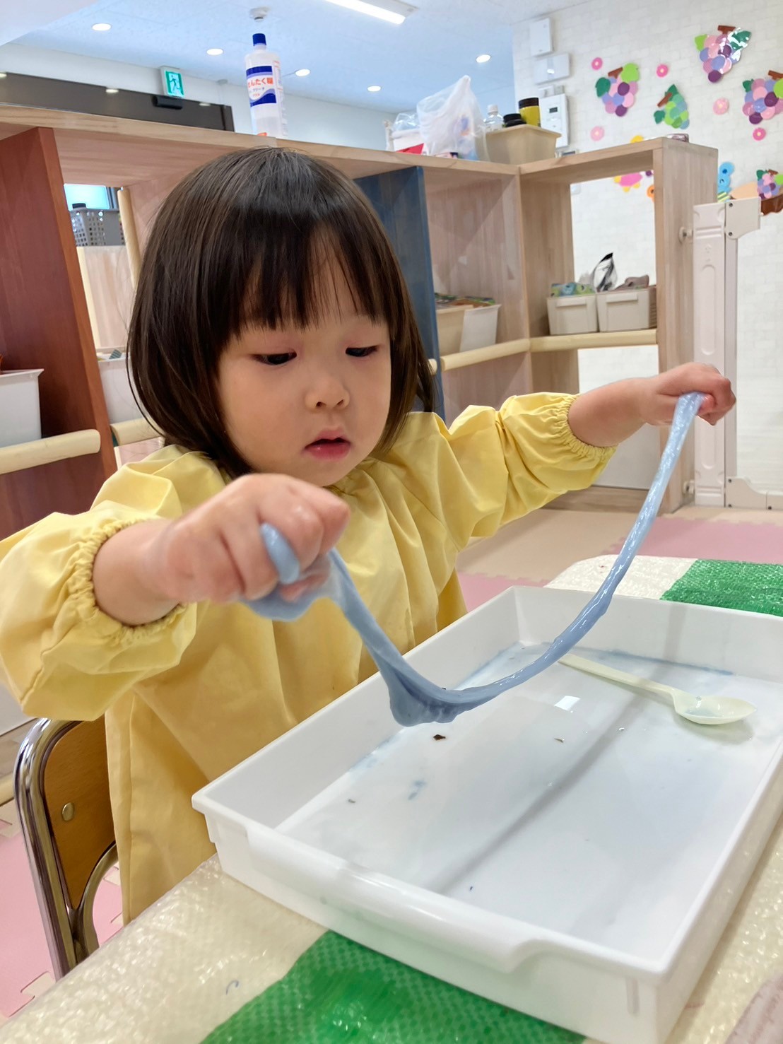 両手でビヨーンと伸ばしてみたり、スプーンでつついてみたりといろんな方法で感触を楽しんでいた子どもたちでした。