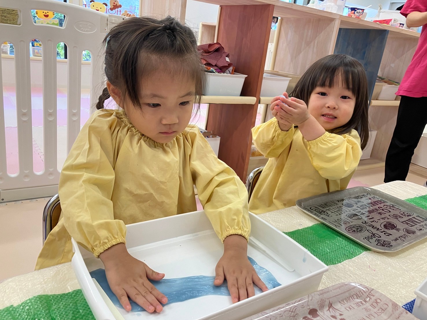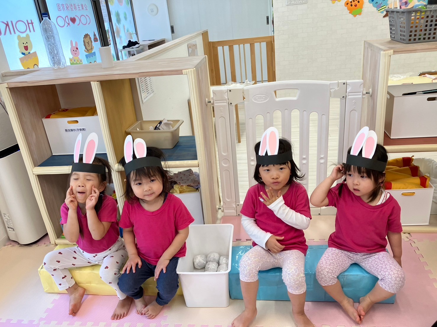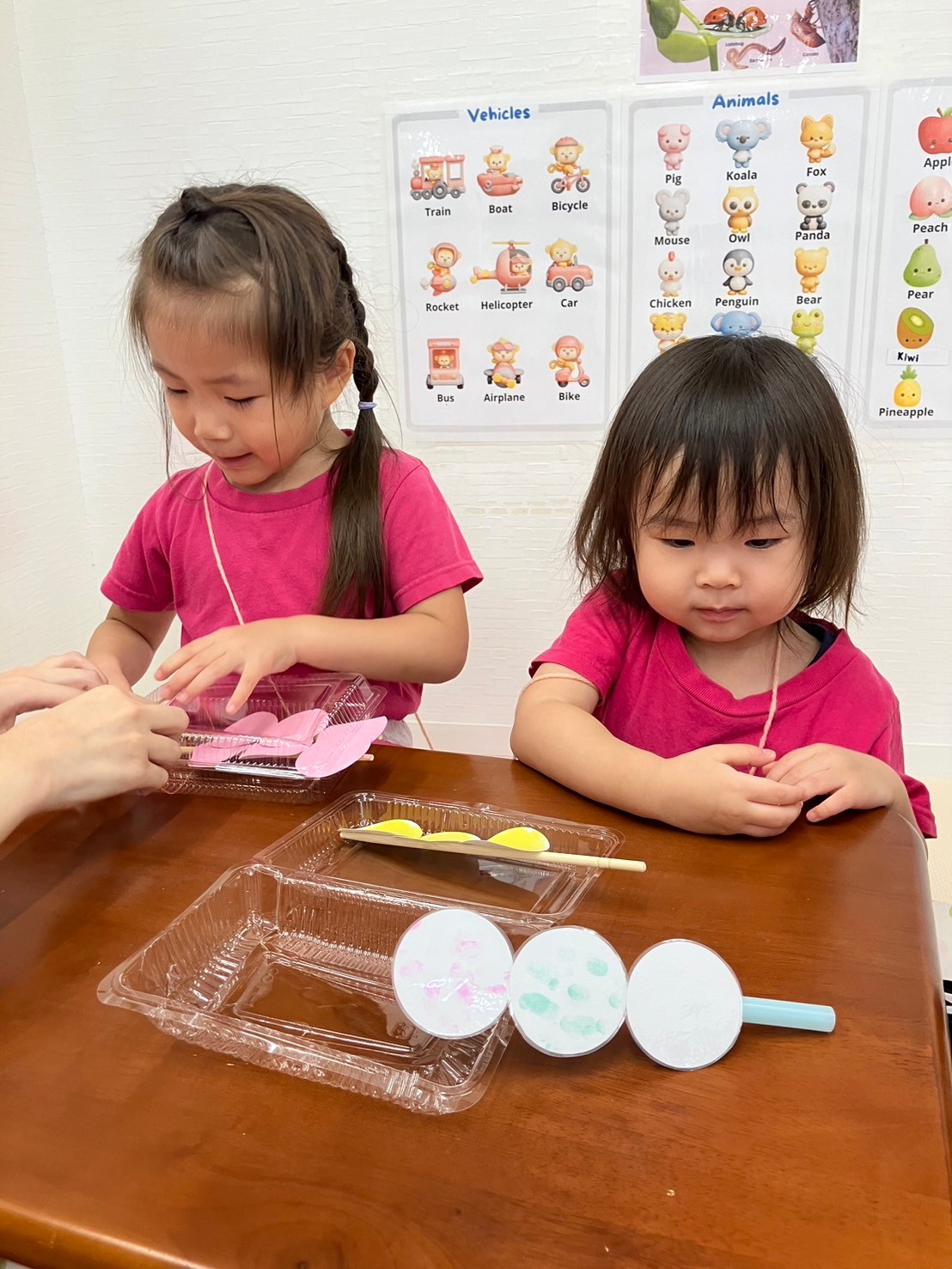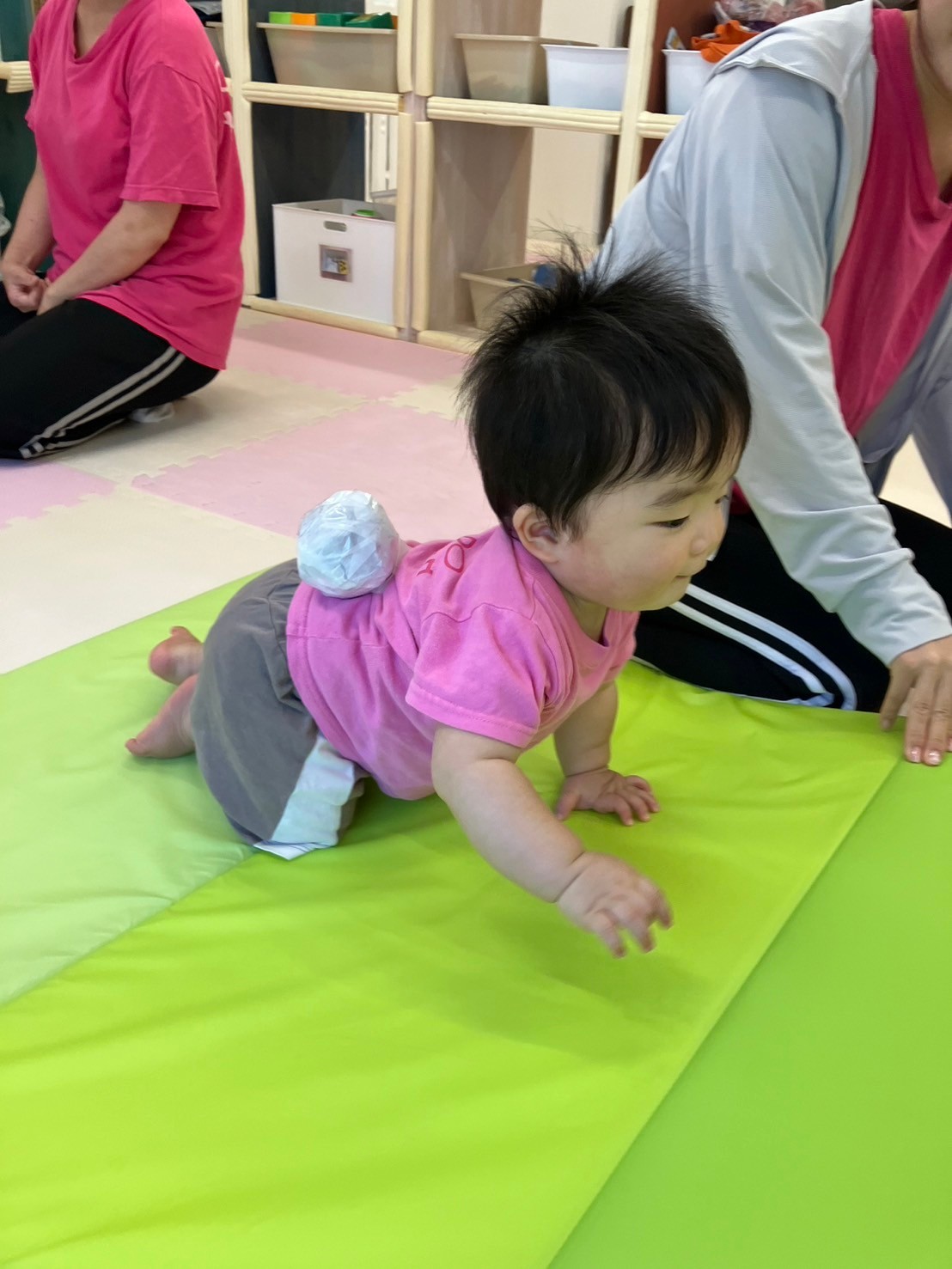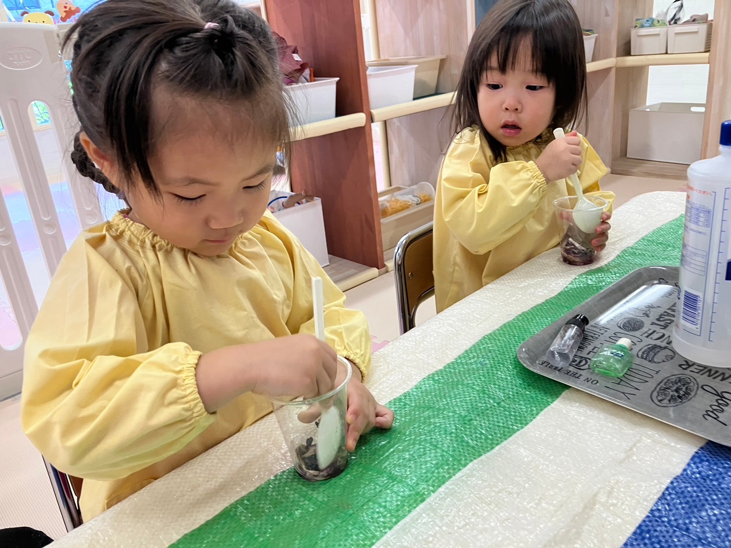 両手でビヨーンと伸ばしてみたり、スプーンでつついてみたりといろんな方法で感触を楽しんでいた子どもたちでした。