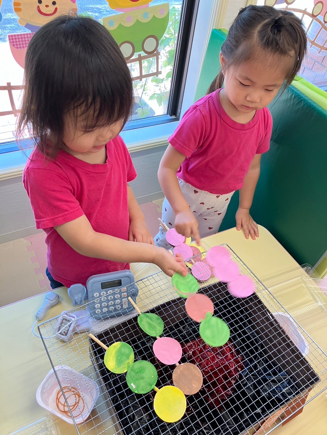 店員さんになると、いらっしゃいませー!と大きな声で呼び込みをしたり、網の上でお団子を焼いて渡したりとまるで本当の店員のようでした。