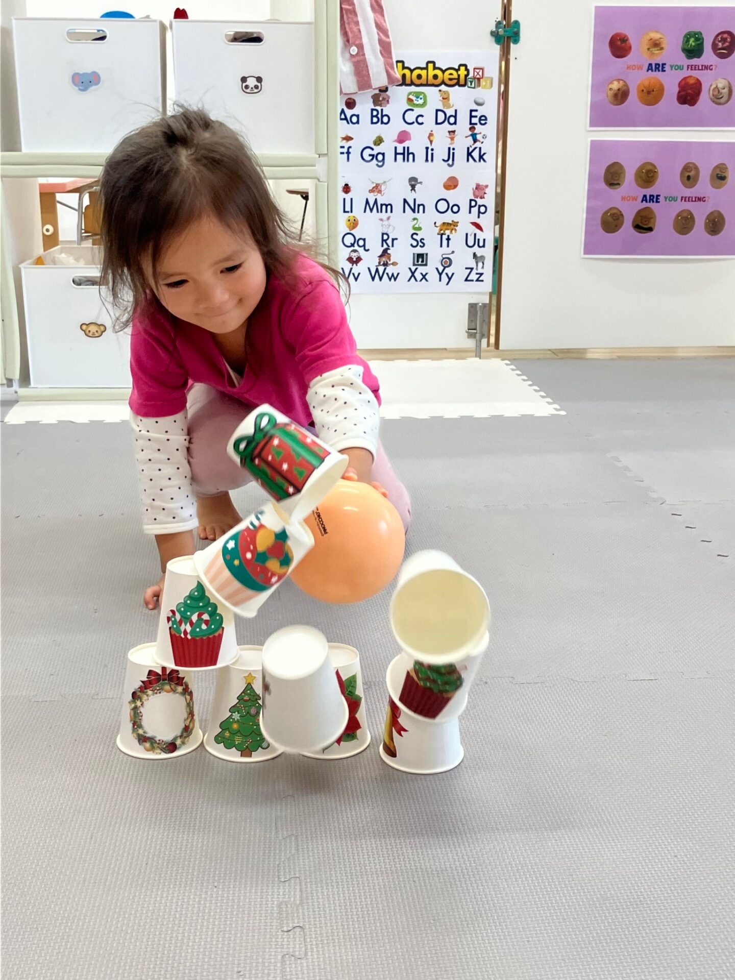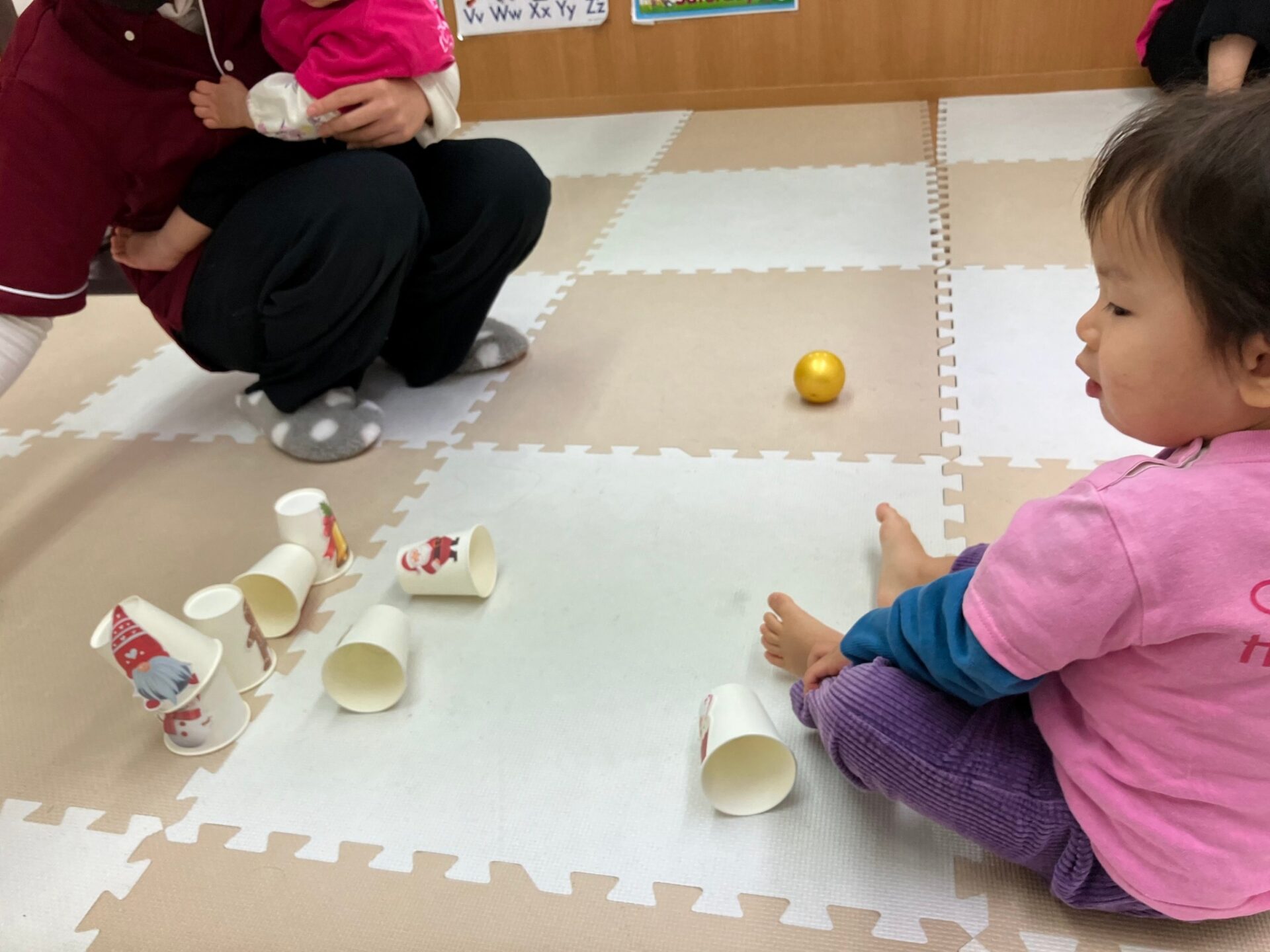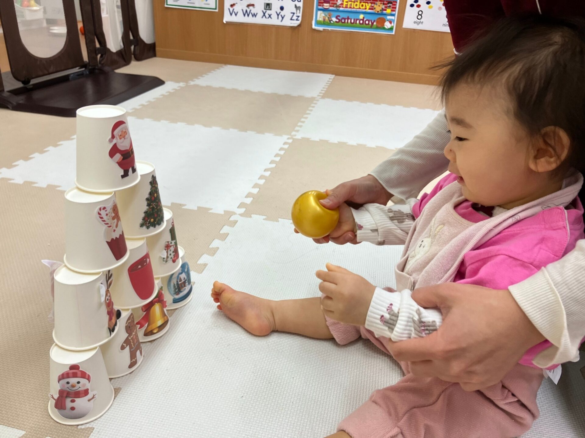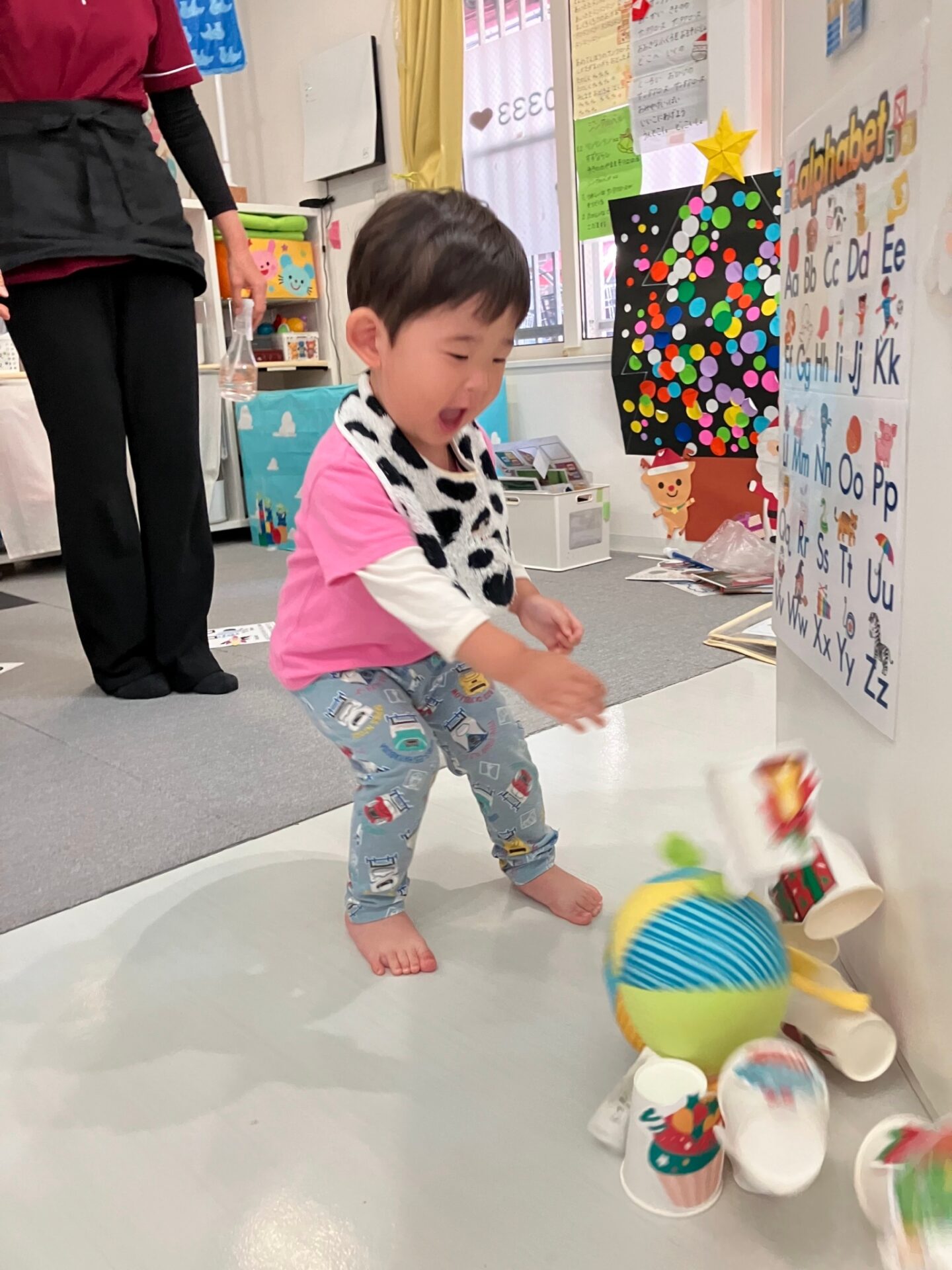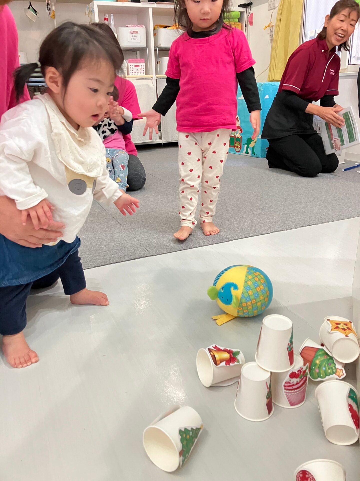 紙コップで作ったクリスマスタワーをボウリングで倒す遊びは、みんな順番を待ちきれないくらい遊んでいました。