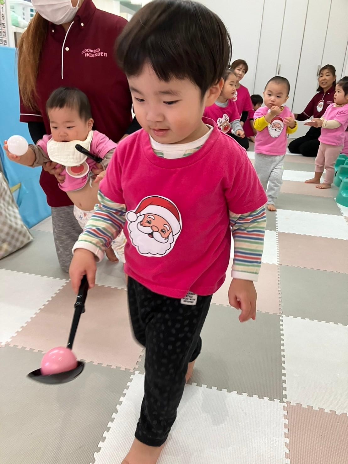 ・Santa Spoon race 料理のお玉にカラーボールを入れて落とさないように運び、サンタを手伝うゲーム